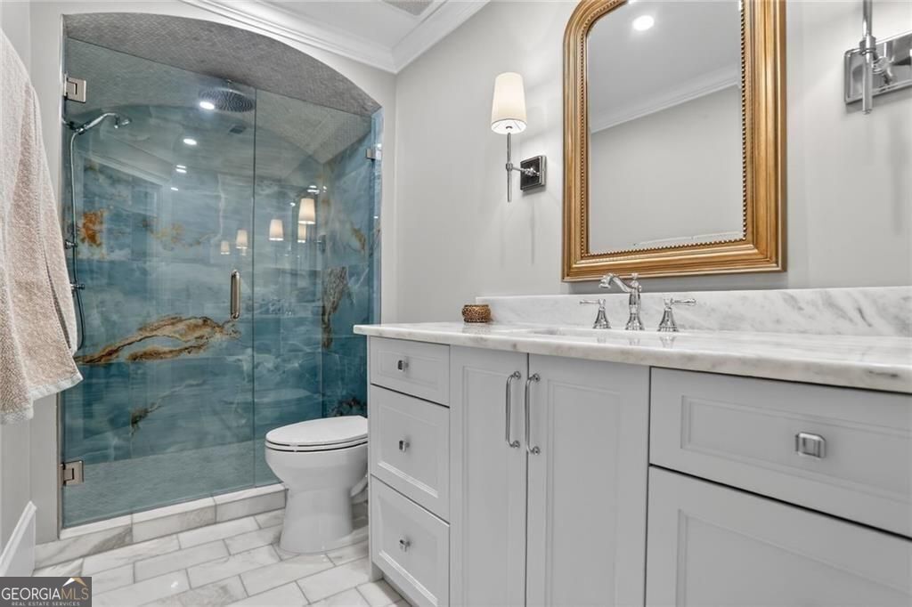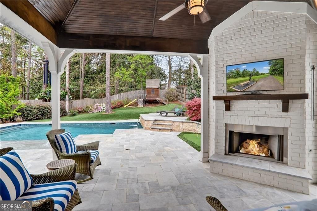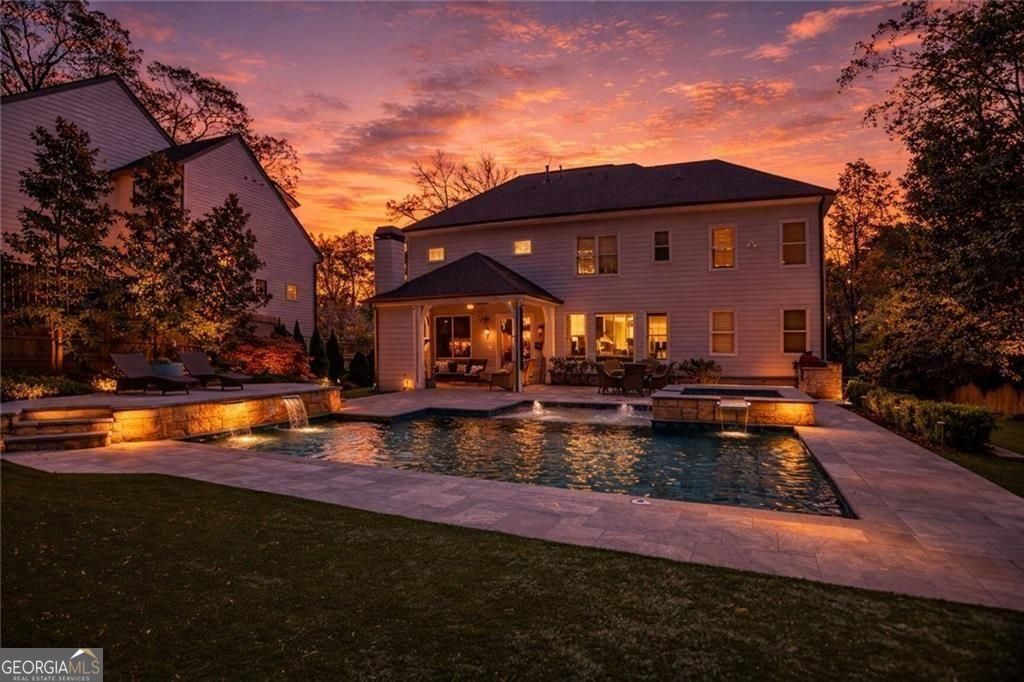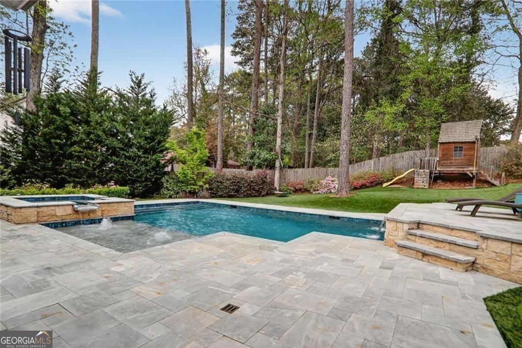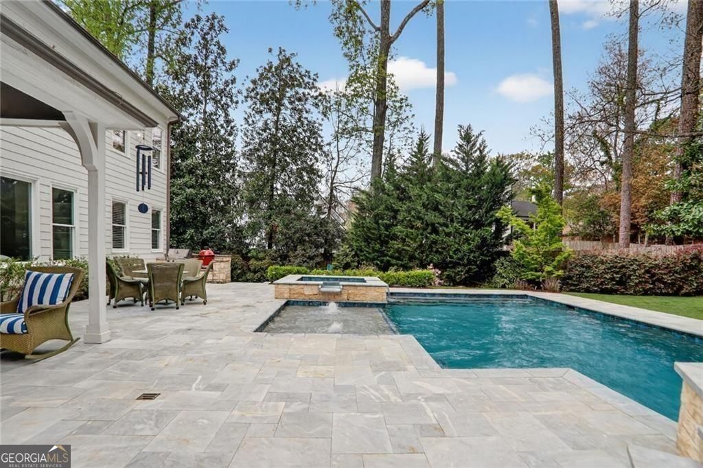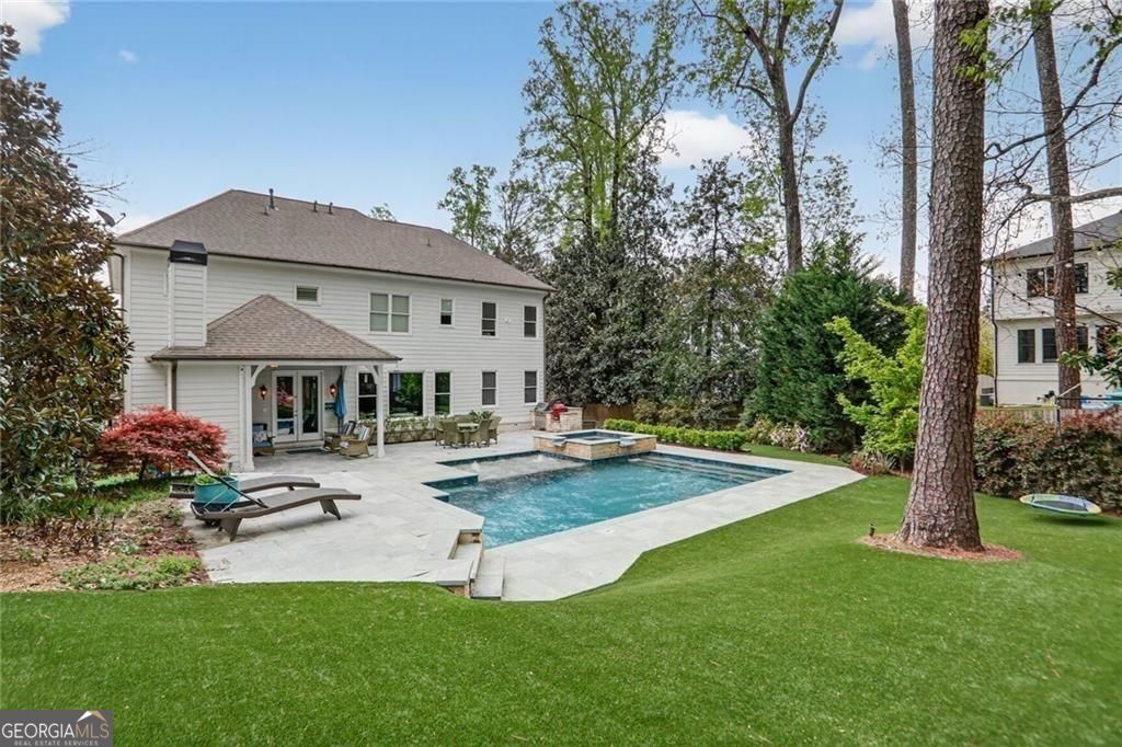 Situated in a cul-de-sac on a premier street in Ashford Park and just a short walk to the restaurants and shops along Dresden, this sought-after Waterford Homes resale stands out for its rare combination of location, walk-out backyard, pool and spa, and newly finished terrace level. The backyard is designed for entertaining and everyday enjoyment, featuring a large, heated, saltwater pool with elevated spa and waterfall spillover, in-water tanning ledge, raised sun shelf with additional water feature, covered patio with vaulted ceiling, fireplace and pre-wired speakers, outdoor grilling area, and generous travertine and limestone pool deck space for relaxing. The fully turfed yard provides year-round greenery with additional play space and putting green, and is accented by seasonal and ornamental landscaping with extensive landscape lighting throughout the property. Inside, the main level offers 10' ceilings and an open, functional layout centered around a large kitchen island with abundant cabinetry, additional mudroom pantry storage, and sunny views overlooking the backyard and pool from the living room with coffered ceilings, built-ins, speaker pre-wire and fireplace. A main-level study or formal living space with vaulted ceiling, true guest suite, formal dining room, and mudroom add flexibility and convenience to this well-designed home. Upstairs, the primary suite features hardwood floors and a spacious marble bath with freestanding cast-iron clawfoot bath tub, walk-in shower with dual heads and body sprays, double vanities, and two walk-in closets. Additional dedicated storage is available from the primary bedroom suite. Three additional bedrooms include one with a private en-suite bath and two connected via Jack-and-Jill bath with dual sinks. Laundry room with utility sink is also conveniently located upstairs. The newly finished terrace level expands the living space with large movie and flex areas including a custom wet bar with wine cooler, daylight bedroom, full bath, exercise room, finished storage, custom cabinetry and extra insulation for sound control. Lot, location and layout provide a homeowner with an uncommon opportunity in Ashford Park now and for years to come. Speaker wiring is installed in main floor living area and to back patio.