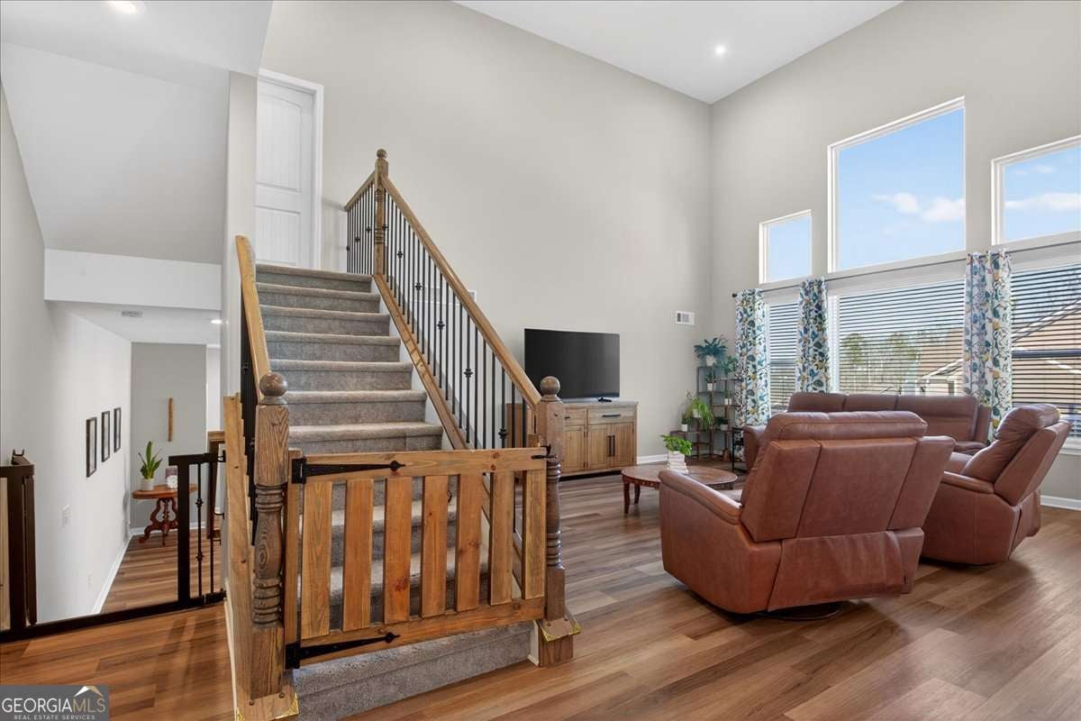 Take advantage of this huge price drop!!! Welcome to this beautiful 4-bedroom, 3.5-bath home perfectly situated on a corner lot with a fenced-in backyard. From the moment you step inside, you'll be impressed by the elegant design, abundant natural light, and thoughtful layout that make this home truly special. Just off the entryway is a lovely office space, ideal for remote work or quiet study. The open-concept main living area showcases the standout kitchen, complete with a massive island with seating, bright white cabinetry, and ample storage throughout. This home features a unique multi-level floor plan with only a few steps separating each level, offering both functionality and charm. A few steps down from the main floor leads to a fully finished terrace level, currently set up as a theater room perfect for movie nights but easily adaptable as a gym, playroom, or versatile bonus space. The terrace level also features brand-new LVP flooring, adding both style and durability. Just a few steps up from the main level, on its own private floor, you'll find the spacious primary suite with a comfortable seating area and a luxurious ensuite bath. The breathtaking shower in the primary bath is truly a showstopper. The conveniently located laundry room is also on this level. Upstairs, you'll discover three additional generously sized bedrooms with ample closet space, ideal for family, guests, or hobbies. Throughout the home, you'll appreciate the new blinds, providing a fresh, modern touch and enhanced privacy. Outside, enjoy the privacy of the corner lot, a three-car garage with extra storage, and a beautifully maintained yard perfect for entertaining or relaxing. Located in the amenity-rich River Rock community, residents enjoy access to an Olympic-size pool, tennis and pickleball courts, a playground, clubhouse, and scenic walking trails leading down to the river. The neighborhood offers an active, welcoming lifestyle that is second to none. Come experience all that this incredible home and community have to offer! Sellers are relocating and are motivated. The best value in the neighborhood!
