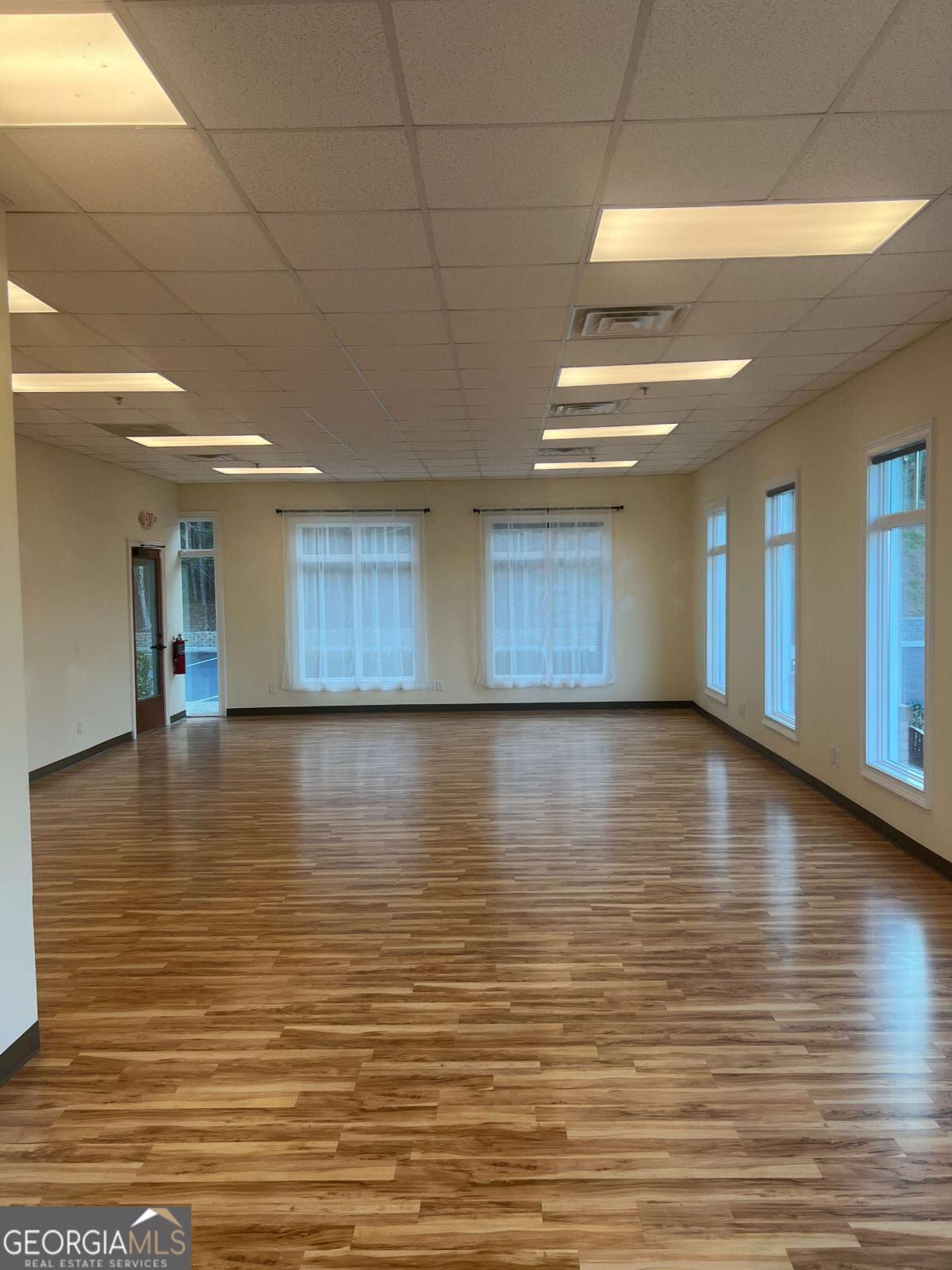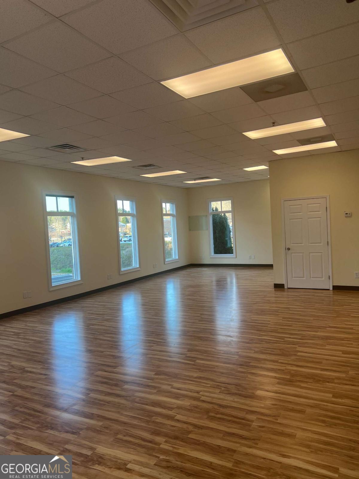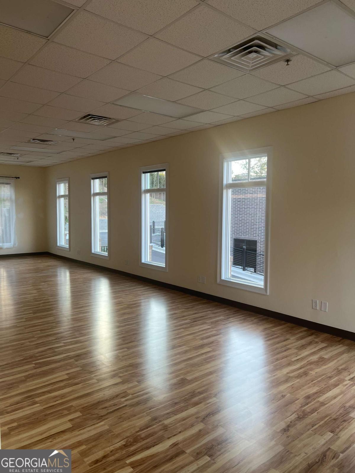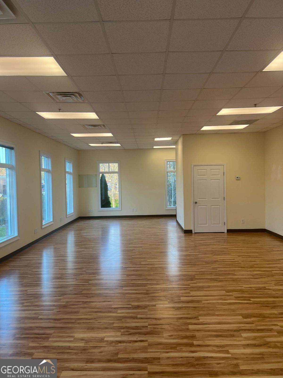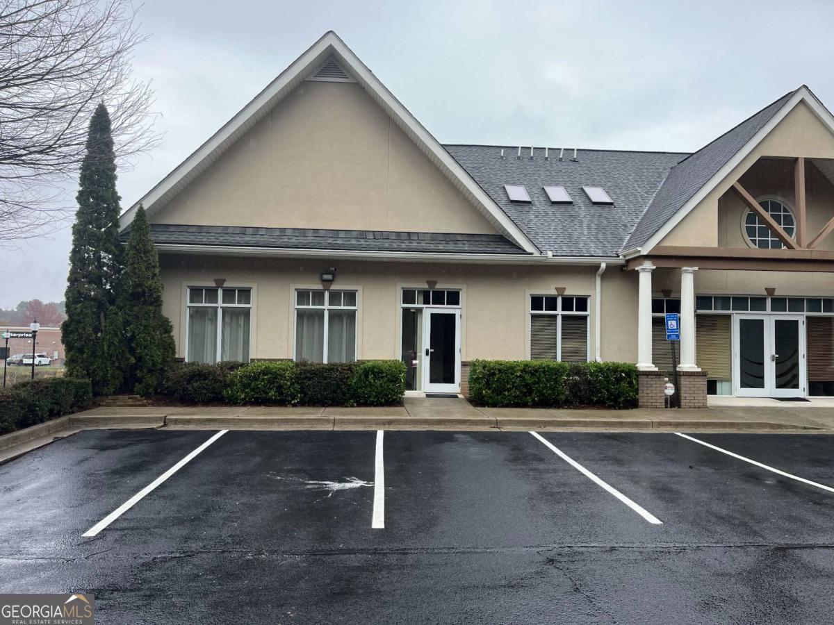 Position your business in this bright, well-maintained commercial space, featuring a spacious open layout, hardwood flooring, tall front-facing windows, and abundant natural light, creating a clean and welcoming environment for clients and staff alike. The large main area offers flexibility for a variety of professional uses, including office, studio, wellness, boutique service, creative, or client-focused operations. The space also includes a private restroom, neutral finishes, high drop ceilings, and multiple oversized windows that enhance both visibility and atmosphere. The property also offers strong curb appeal ample parking, covered walkway access, and a professional setting in a desirable Woodstock location. A versatile, move-in ready opportunity with great visibility. character, and flexibility for a variety of commercial uses.