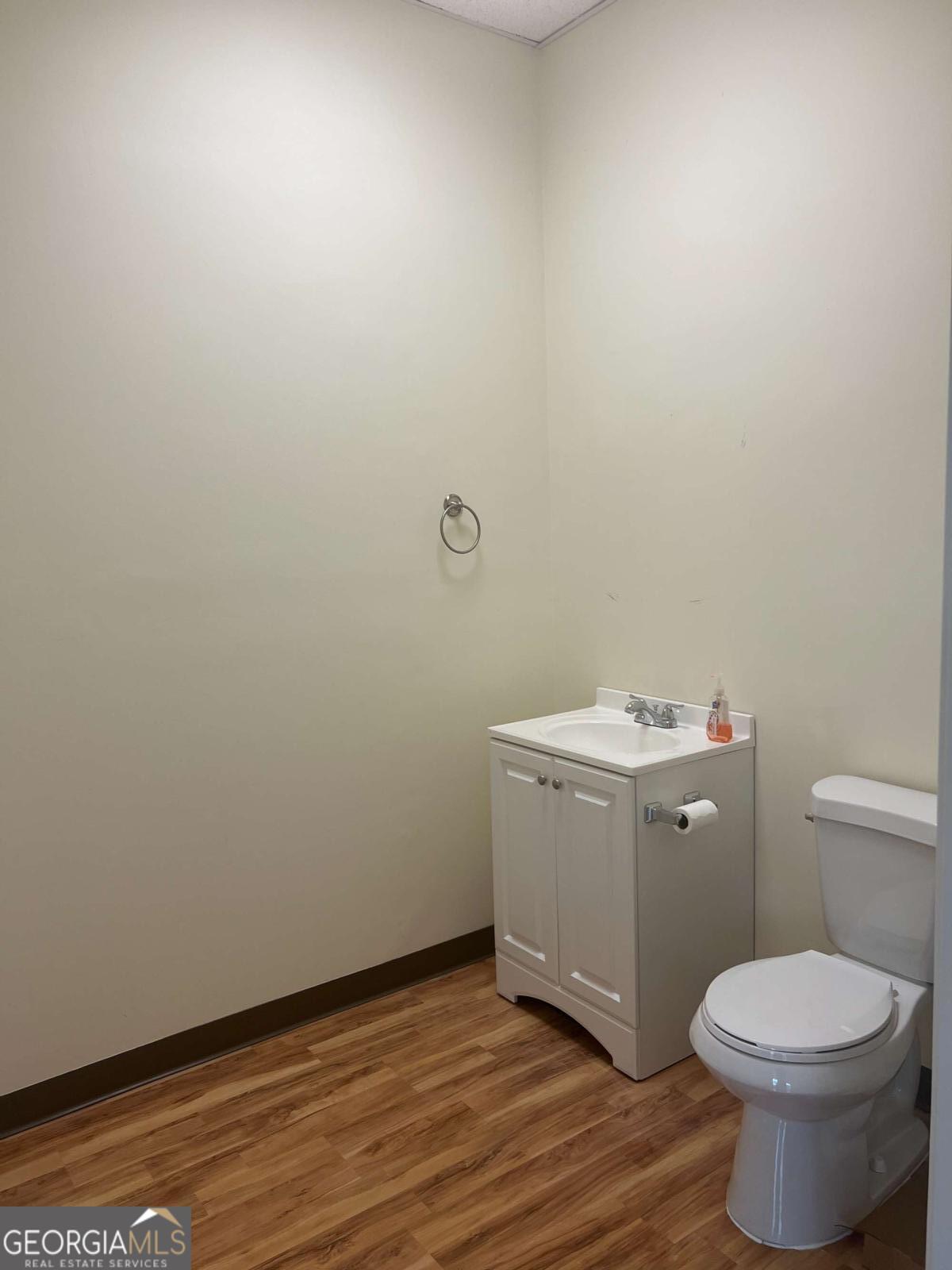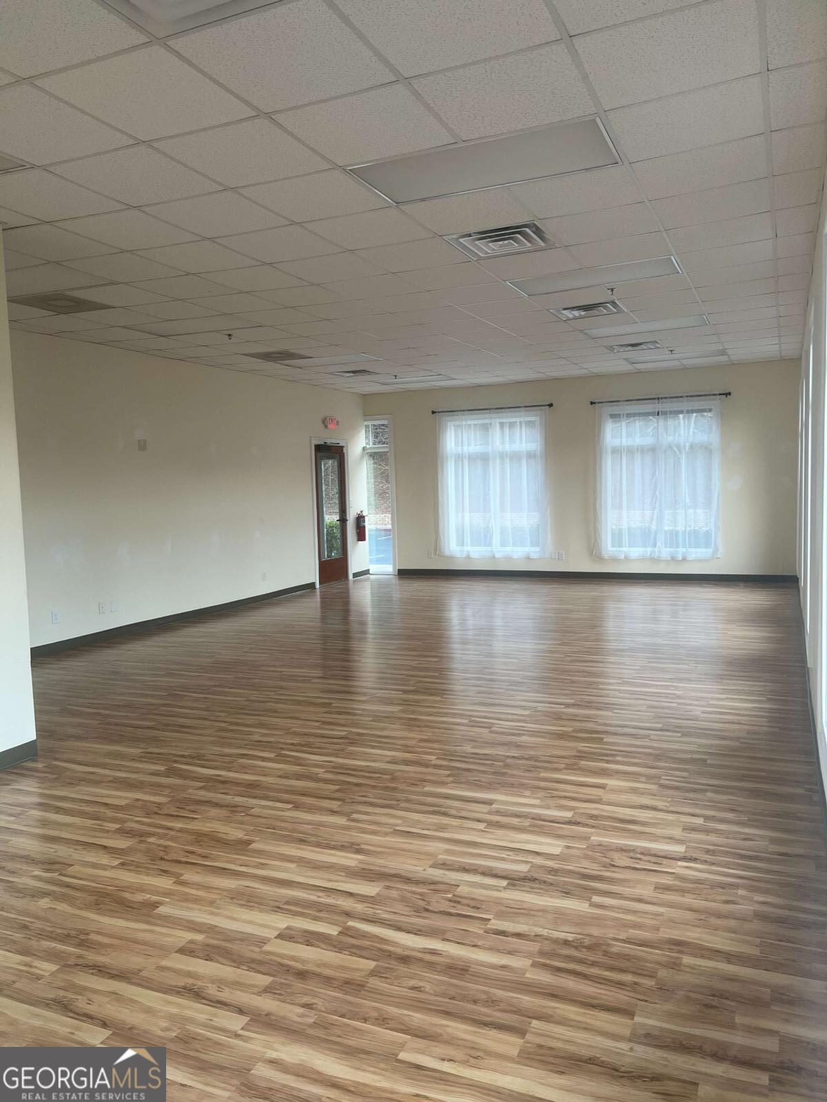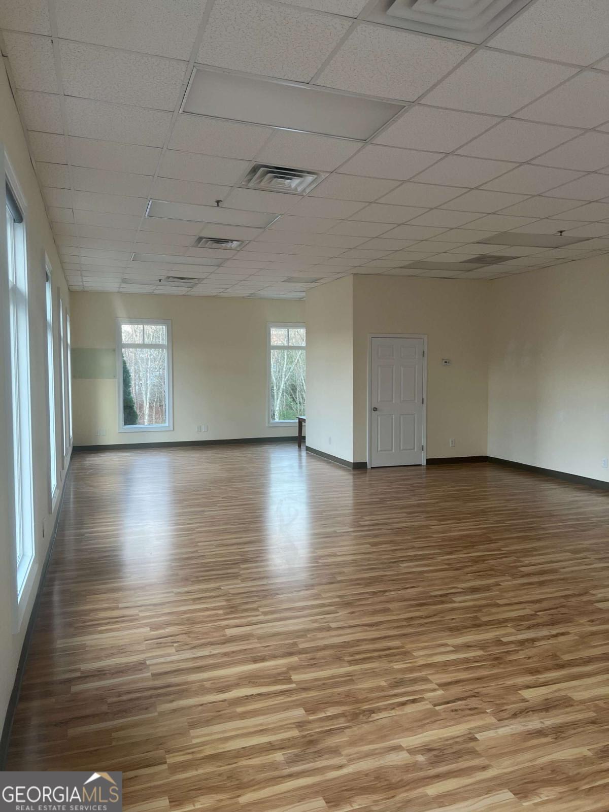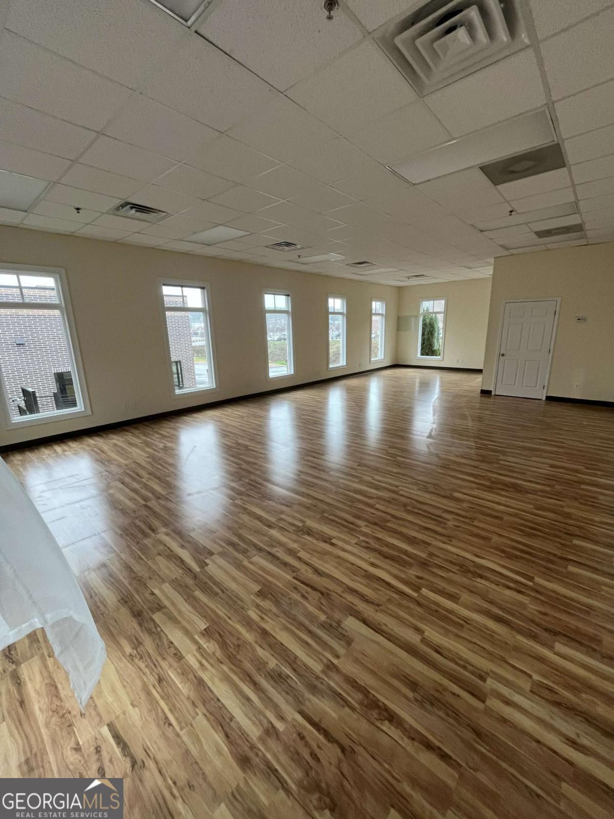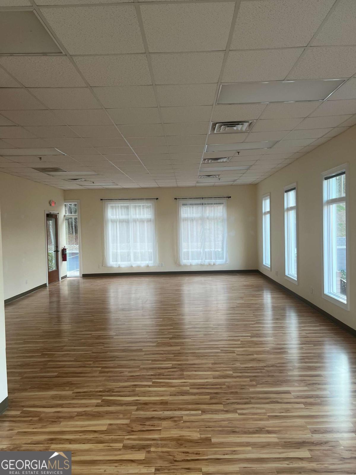 Position your business in this bright, well-maintained commercial space, featuring a spacious open layout, hardwood flooring, tall front-facing windows, and abundant natural light, creating a clean and welcoming environment for clients and staff alike. The large main area offers flexibility for a variety of professional uses, including office, studio, wellness, boutique service, creative, or client-focused operations. The space also includes a private restroom, neutral finishes, high drop ceilings, and multiple oversized windows that enhance both visibility and atmosphere. The property also offers strong curb appeal ample parking, covered walkway access, and a professional setting in a desirable Woodstock location. A versatile, move-in ready opportunity with great visibility. character, and flexibility for a variety of commercial uses.