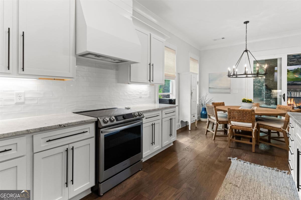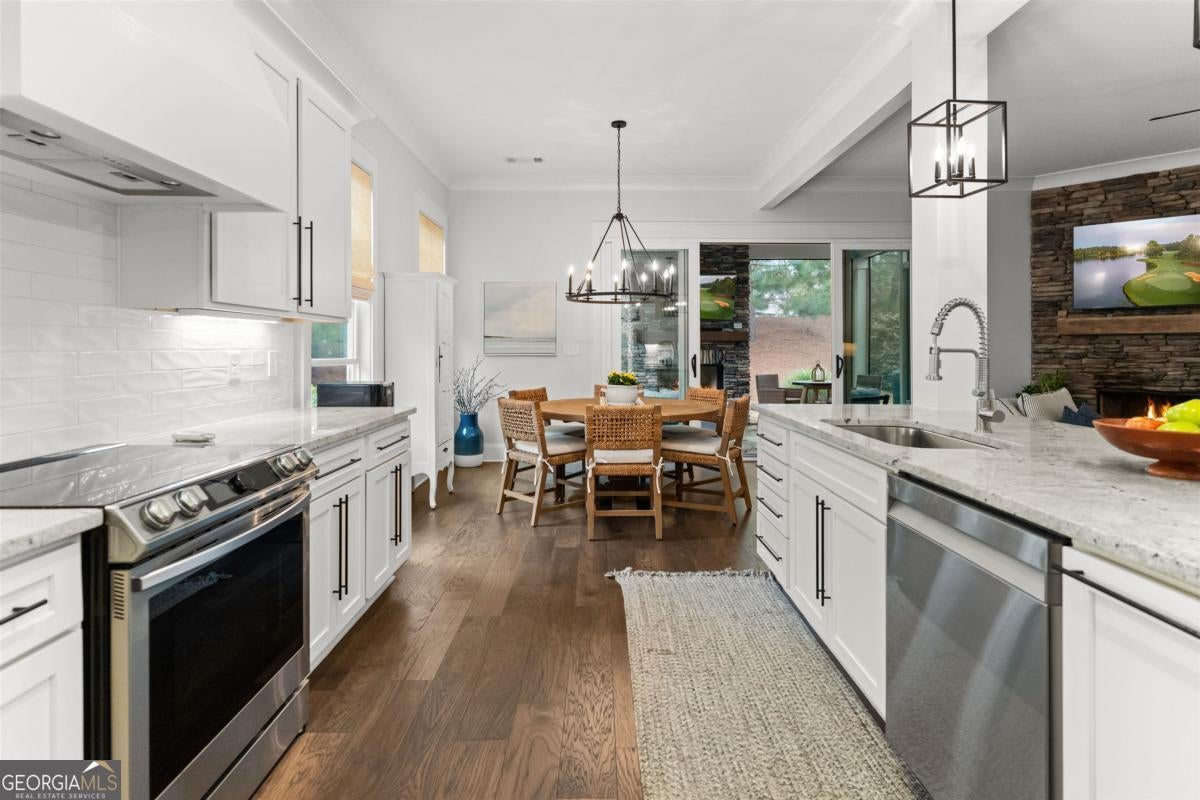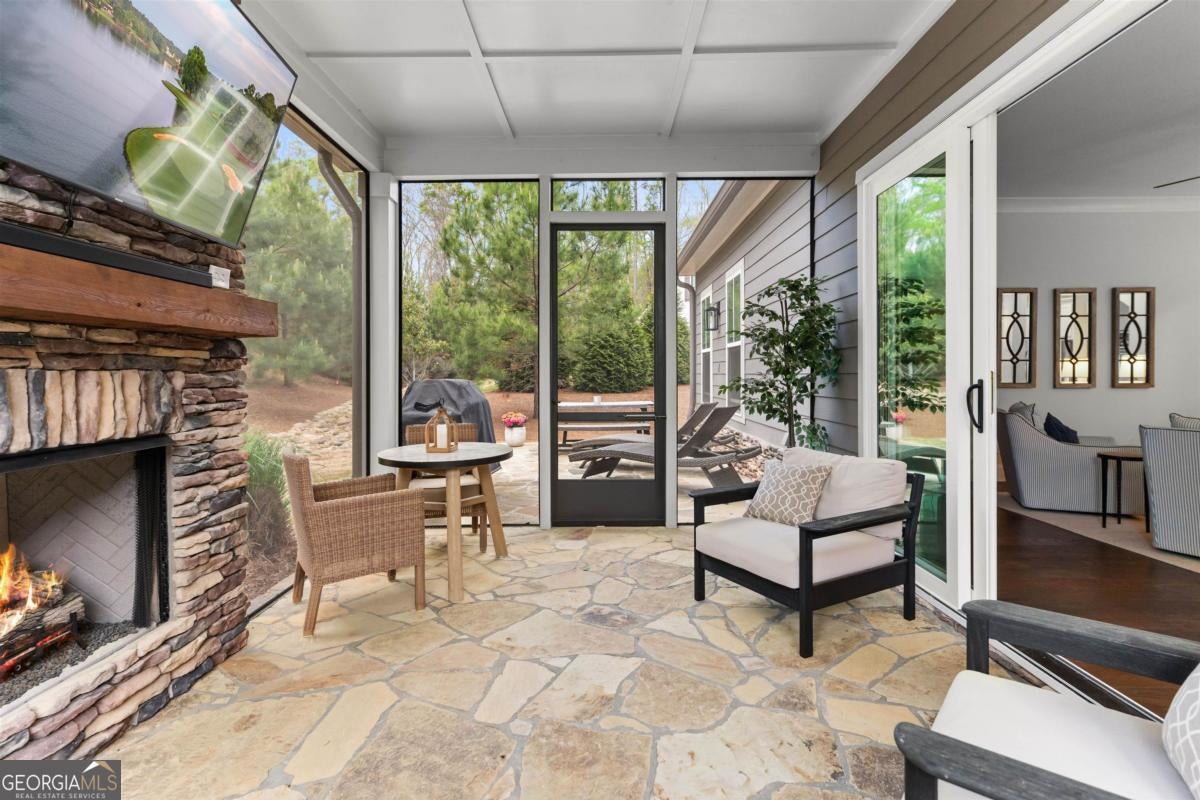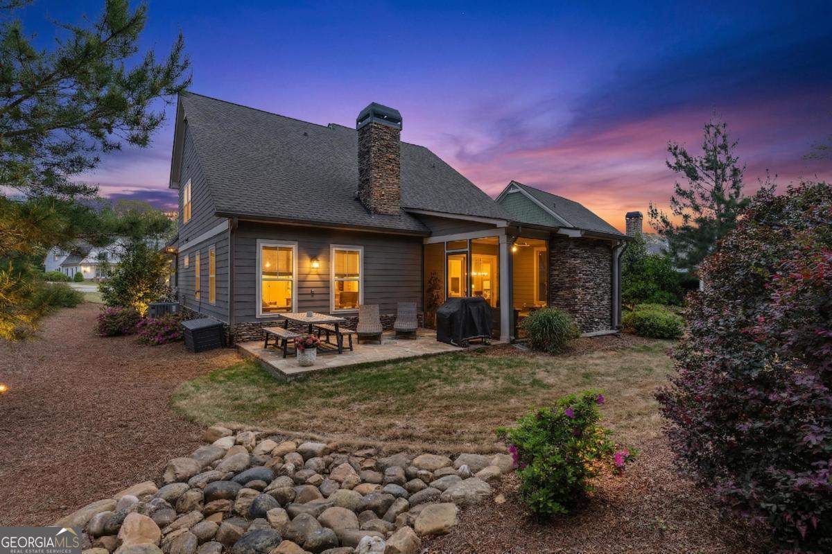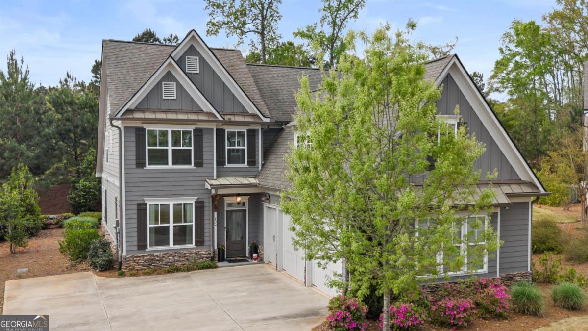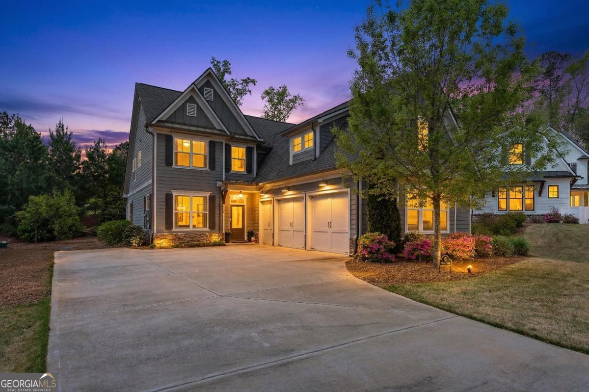 Welcome to the Cottages at Eagles Rest in Cuscowilla! This beautifully designed 4-bedroom, 4-bath home offers an open-concept floor plan featuring rich hardwood floors, a cozy wood-burning fireplace in the great room, and a spacious eat-in kitchen with a large island-perfect for entertaining. The owner's suite is conveniently located on the main level and features a spa-like bath with a walk-in shower and a generous custom closet. Also on the main level is a bedroom which can also be used as an office with elegant French doors, ideal for working from home or a quiet retreat. Upstairs, you'll find two oversized ensuite bedrooms along with a separate living area, providing comfort and privacy for guests or family. Enjoy outdoor living year-round on the covered, screened porch, recently upgraded with a stunning gas-log stone fireplace, large sliding glass doors, and an extended patio-ideal for relaxing or hosting gatherings. Additional highlights include an oversized two-car garage plus a separate golf cart garage. Experience refined lake and golf course living in Cuscowilla-Lake Oconee's only fully private golf community. Residents of Cuscowilla enjoy an exceptional lifestyle with access to premium amenities including pickleball and tennis courts, a fitness facility, community garden, dog park, driving range, and playground. Golf Membership available.