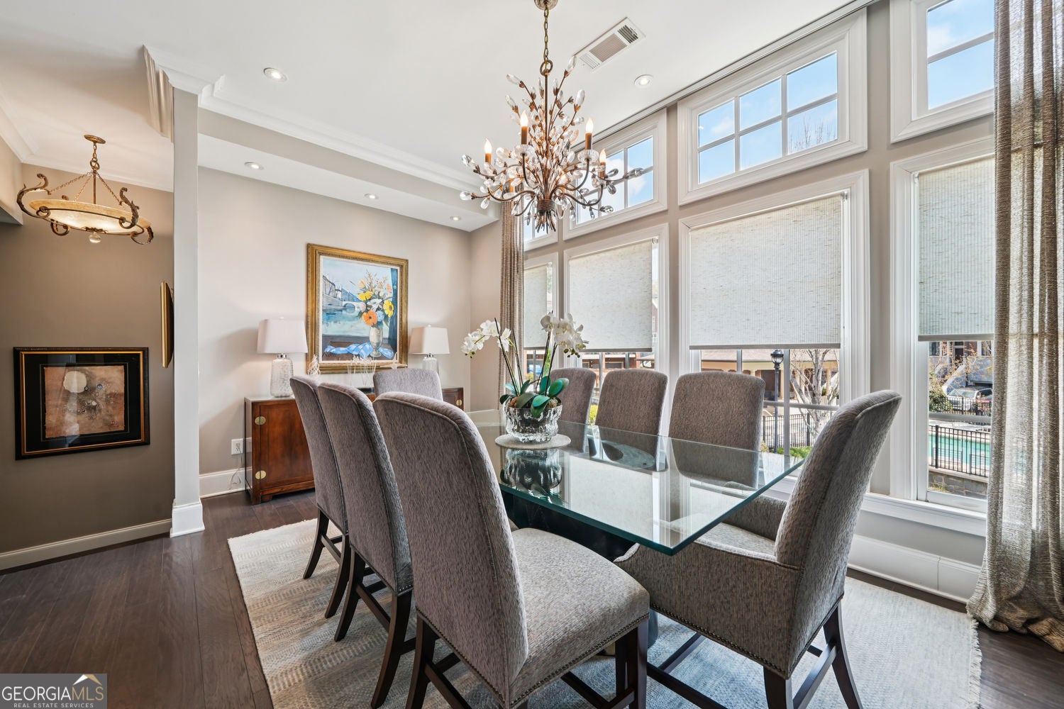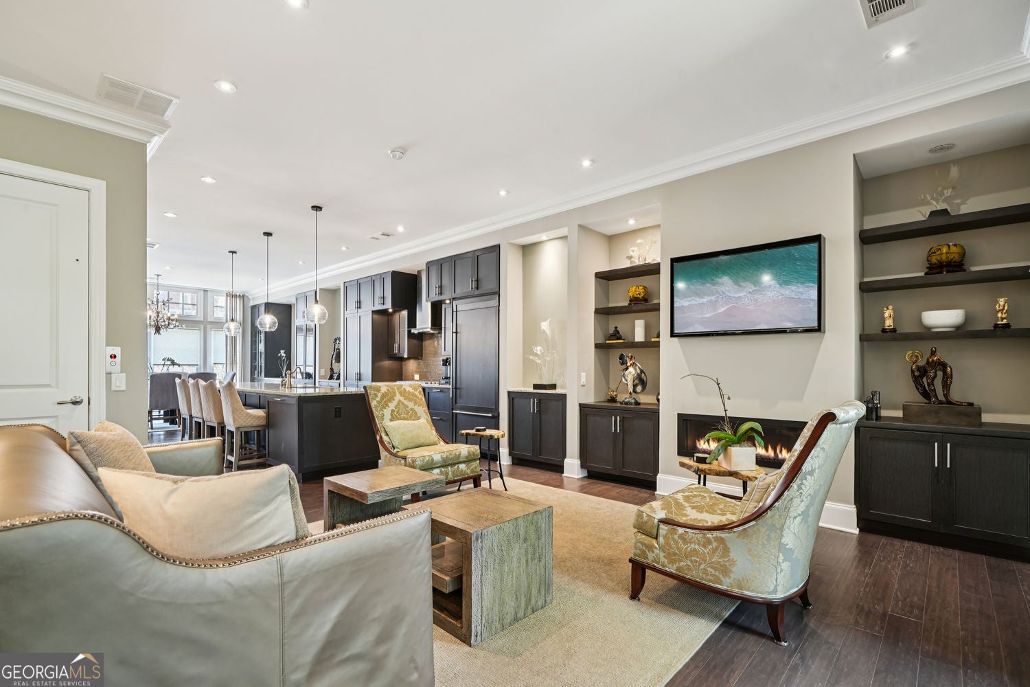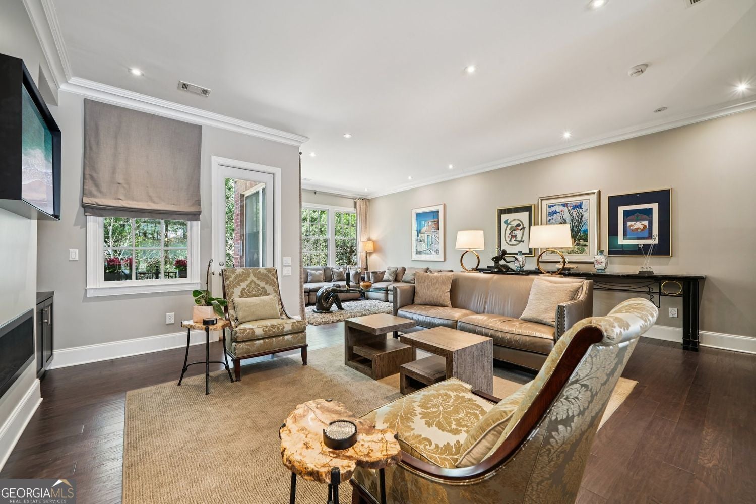 Private wooded views, an elevator, and pride of ownership from a single owner set the tone for this exceptionally upgraded townhome. Welcome to an exquisite and timeless residence in The Savoy at Town Brookhaven. This is one of Brookhaven's most desirable gated communities, where thoughtful design, quality construction, and everyday convenience come together seamlessly. This extra-wide townhome lives like a single-family home, offering three beautifully finished levels, a private elevator, and a layout designed for both comfortable living and effortless entertaining. The main level is open and inviting, anchored by a spacious living area with a fireplace, a refined dining space, and a well-appointed kitchen featuring JennAir stainless steel appliances and an oversized breakfast bar ideal for gathering. Custom millwork, built-ins, and a wet bar stub create a level of finish that feels both tailored and elevated. Throughout the home, you will find hardwood floors, LED lighting, a central vacuum system, an integrated intercom system, and thoughtfully designed spaces, including a built-in desk and custom storage solutions. The laundry room is generously sized and beautifully finished with custom cabinetry and a sink, proving that even functional spaces can be well designed. Upstairs, the primary suite is a true retreat, overlooking a peaceful wooded setting and featuring a spa-inspired bath with a dramatic floor-to-ceiling glass shower with body sprays and a luxurious six-foot soaking tub. A large custom walk-in closet completes the space. Additional bedrooms are well proportioned, offering flexibility for guests, office space, or everyday living. The terrace level provides a private, light-filled living area ideal for guests, in-laws, or a dedicated work-from-home setup. This level also offers exceptional flexibility, currently featuring a separate room set up as a home gym, while still allowing space for a media room or additional lounge area, making it perfect for both wellness and entertainment. This home is also equipped with modern conveniences, including a full security system with cameras and a video doorbell, remote garage access, and a high-powered EV charger. Recent updates include a new HVAC system and water heater, offering true turnkey peace of mind. Outdoor living is equally inviting and very private, with both a covered balcony and patio for relaxing or entertaining. Residents of The Savoy enjoy gated security and a saltwater pool, all just minutes from Town Brookhaven, offering premier dining, shopping, and everyday conveniences, along with easy access to MARTA and major corridors. This is a rare opportunity to own a meticulously upgraded, thoughtfully designed home in a prime Brookhaven location where the details truly set it apart.