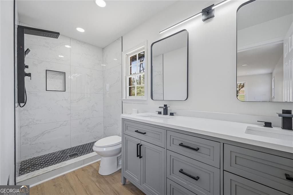 Welcome to this beautifully updated 3-bedroom, 3 full bathroom home, thoughtfully renovated from top to bottom and full of modern charm and functionality. From the moment you arrive, you'll be drawn in by the vibrant accent door and inviting curb appeal, complemented by a spacious yard and plenty of parking, including an oversized 2-car garage and extended driveway. Step inside to discover a bright and open great room featuring a stylish modern accent wall, perfect for relaxing or entertaining. The home is enhanced with new light fixtures throughout, recessed lighting in the bedrooms and basement, and an abundance of natural light. The kitchen shines with brand-new quartz countertops, sleek new faucets, and updated finishes, while all bathrooms have been newly remodeled with elegant tile work, updated flooring, new vanities, and modern fixtures. Major upgrades provide peace of mind, including new electrical, new plumbing, new gutters, and a roof that's only 2 years old. Additional improvements such as new exhaust systems, suspended ceiling, and updated hot water tanks ensure comfort and efficiency throughout. Enjoy the flexibility of a full finished basement, complete with its own full bathroom and kitchen with quartz countertops and new modern cabinetry plus access to a screened sun porch-perfect for relaxing evenings. The main level also features an enclosed sun porch, offering even more space to unwind or entertain year-round. This move-in-ready home combines modern updates with practical living spaces, making it a must-see. Schedule your showing today and experience all it has to offer!