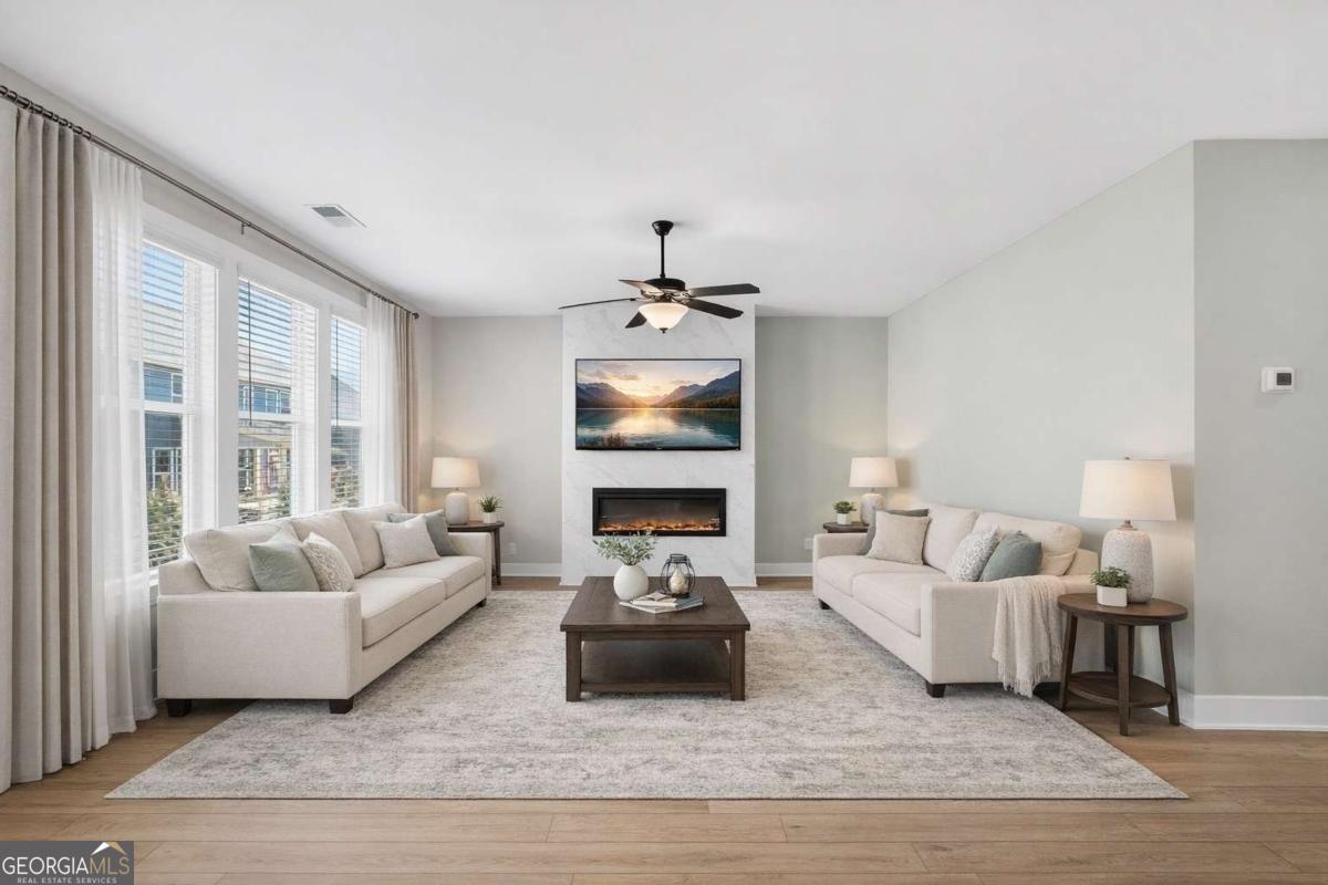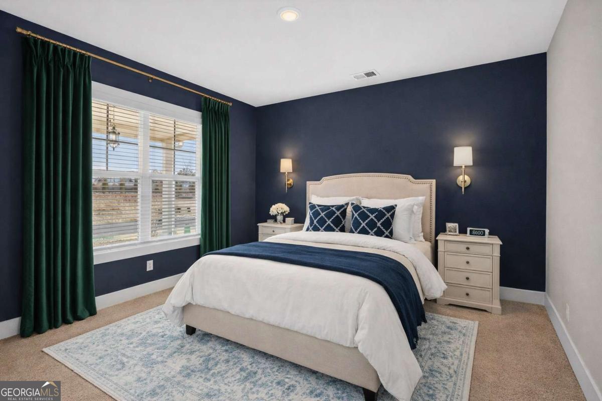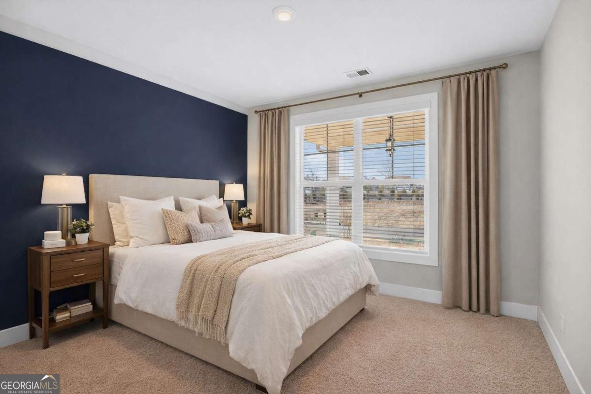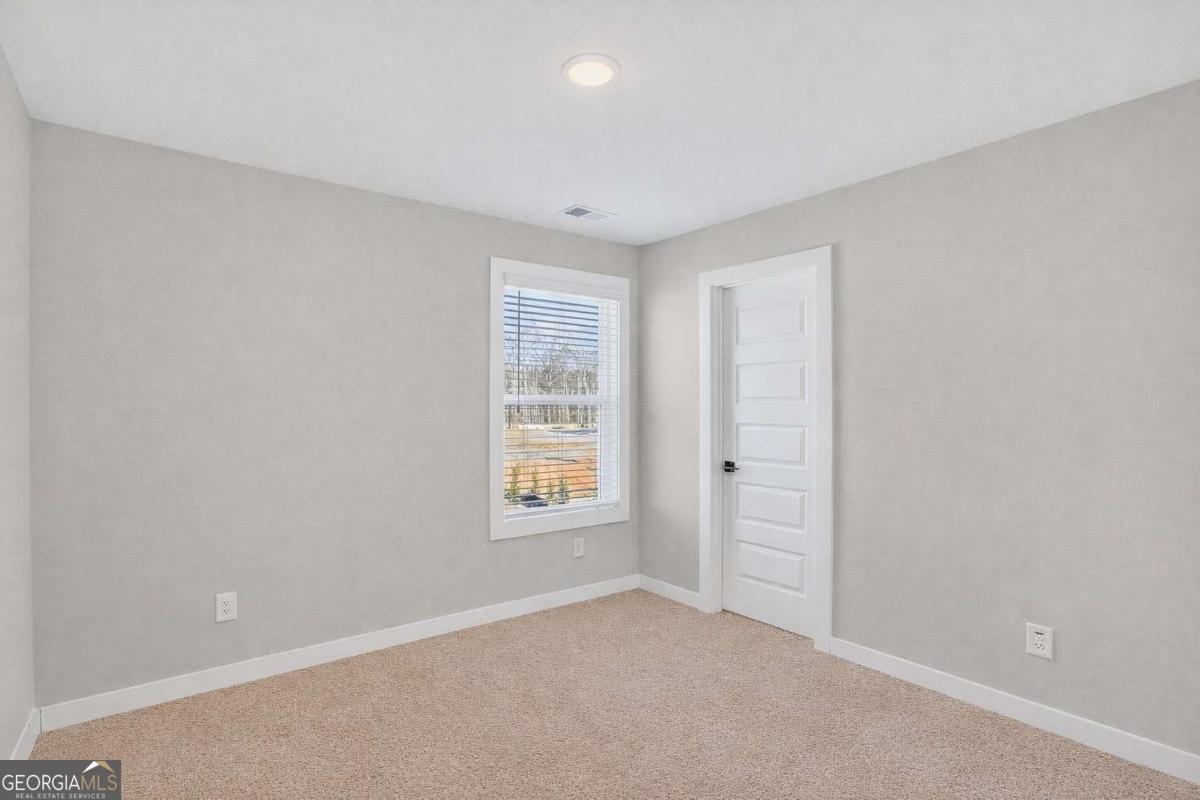 Built by Peachtree Building Group, Move-In Ready New Construction in Mirror Lake Golf Community! The Bedford floor plan on Lot 42 offers thoughtfully designed living space in the Mirror Lake community of Villa Rica. This new construction two-story home features 5 bedrooms and 3.5 bathrooms with a layout designed for both everyday living and entertainment. The open-concept main level connects the kitchen and family room, creating a comfortable gathering space. The kitchen features 42-inch soft close cabinets, granite countertops, double gas ovens, stainless steel sink with gooseneck faucet, tile backsplash, and a large island with seating and prep space. The family room includes a recessed linear electric fireplace for a modern focal point. A main-level guest suite with full bath and walk-in closet provides flexible space for visitors or additional household needs. Upstairs, the primary suite is spacious and filled with natural light from a bank of four large windows. A tray ceiling and ceiling fan add architectural detail while creating a relaxing retreat. The primary ensuite bath features a granite double vanity, soaking tub, tiled shower with frameless enclosure, and a spacious walk-in closet. Three additional bedrooms include walk-in closets, and the second-floor laundry room with linen storage adds everyday convenience. Additional features include luxury vinyl plank stair treads, open-rail stair detail with steel accents, upgraded lighting, black interior hardware, window screens throughout, and cordless blinds included throughout the home. The home also includes a two-car garage plus a separate golf-cart garage, featuring a Wi-Fi-enabled garage door opener that allows convenient access and monitoring from your smartphone. Builder is including a complimentary one-year golf membership to Mirror Lake and Chapel Hill Golf Clubs Mirror Lake amenities include two golf courses, tennis courts, pickleball courts, swimming pools, and walking trails. Conveniently located near The MILL Amphitheater, Clinton Nature Preserve, Pine Mountain Gold Museum, and historic downtown Villa Rica.