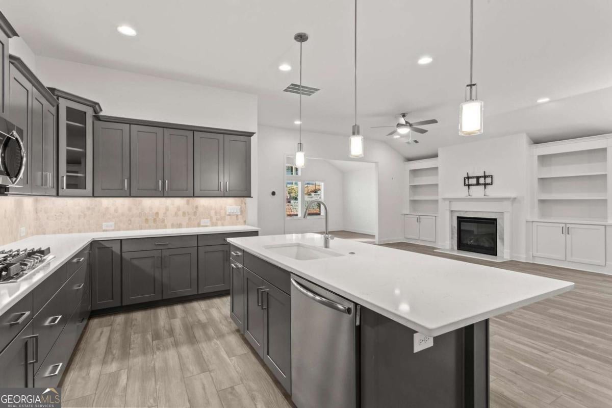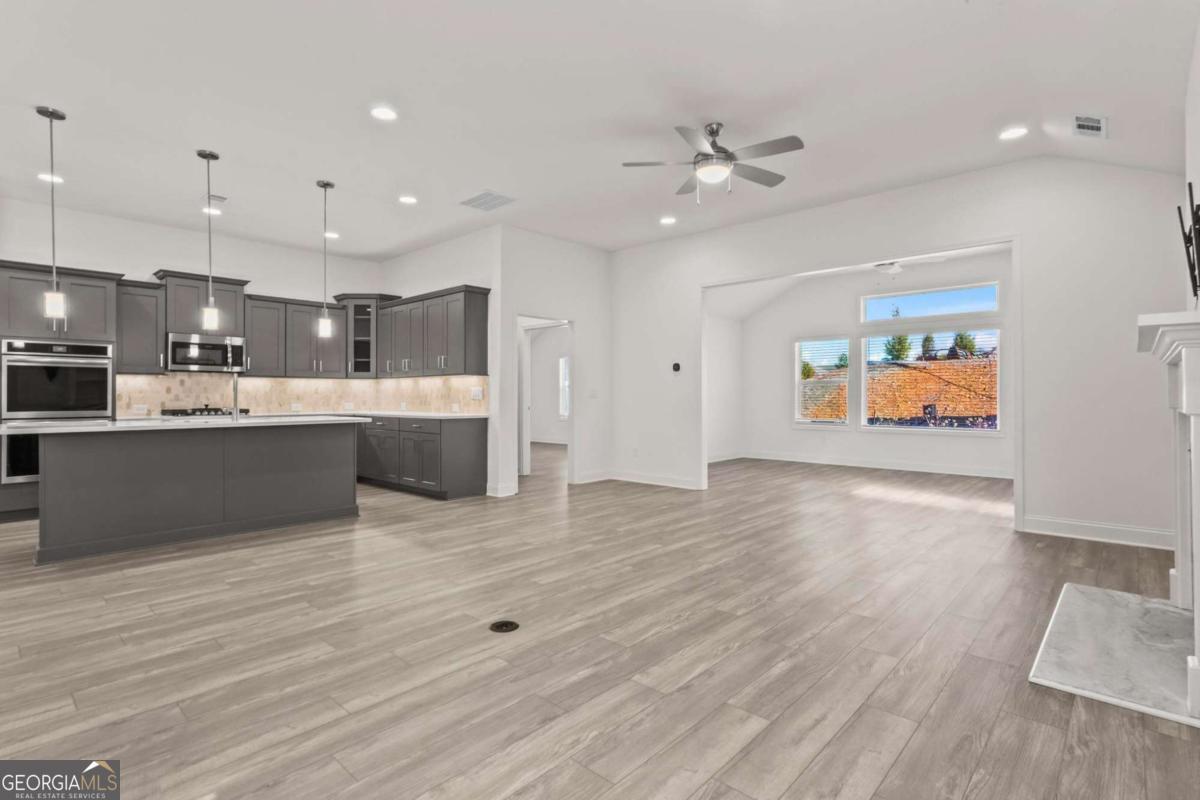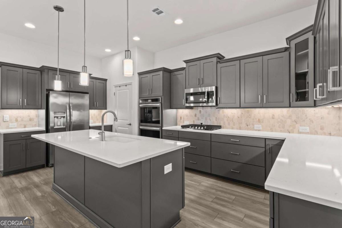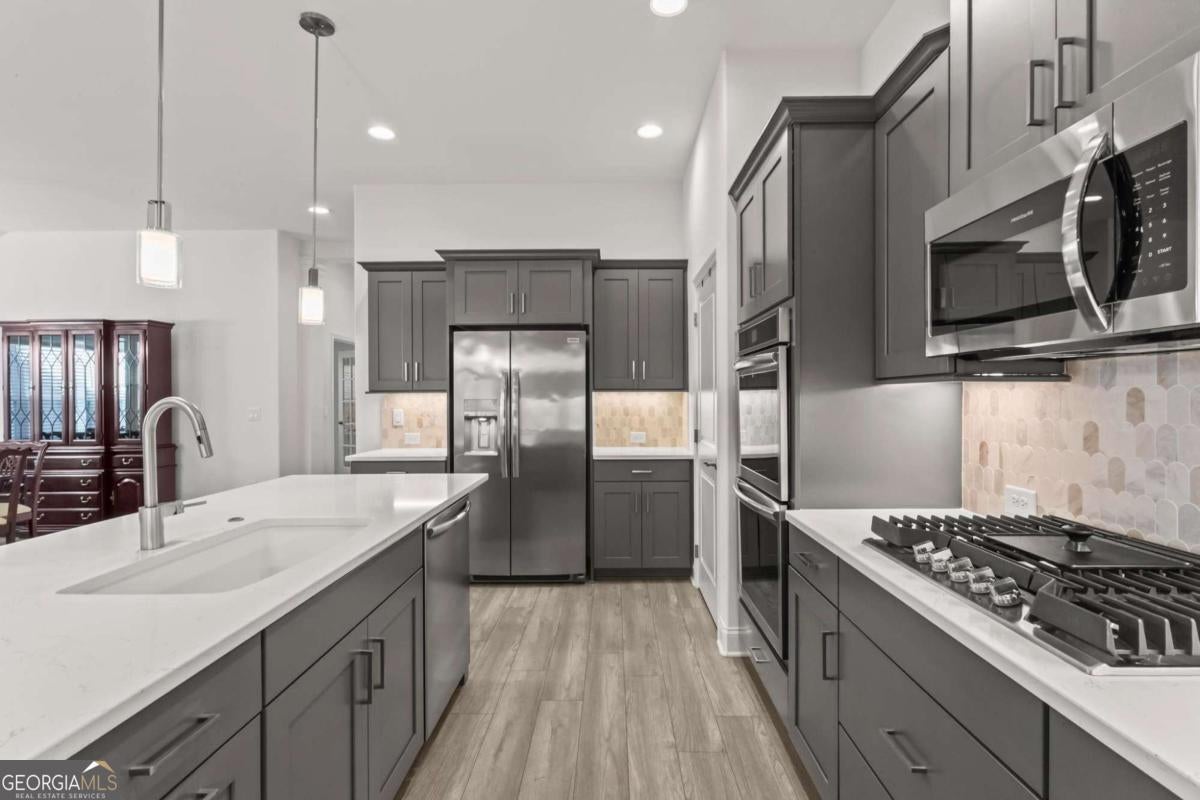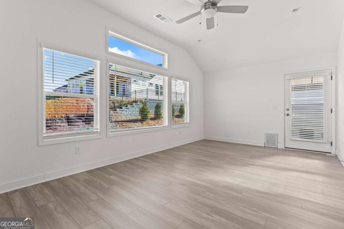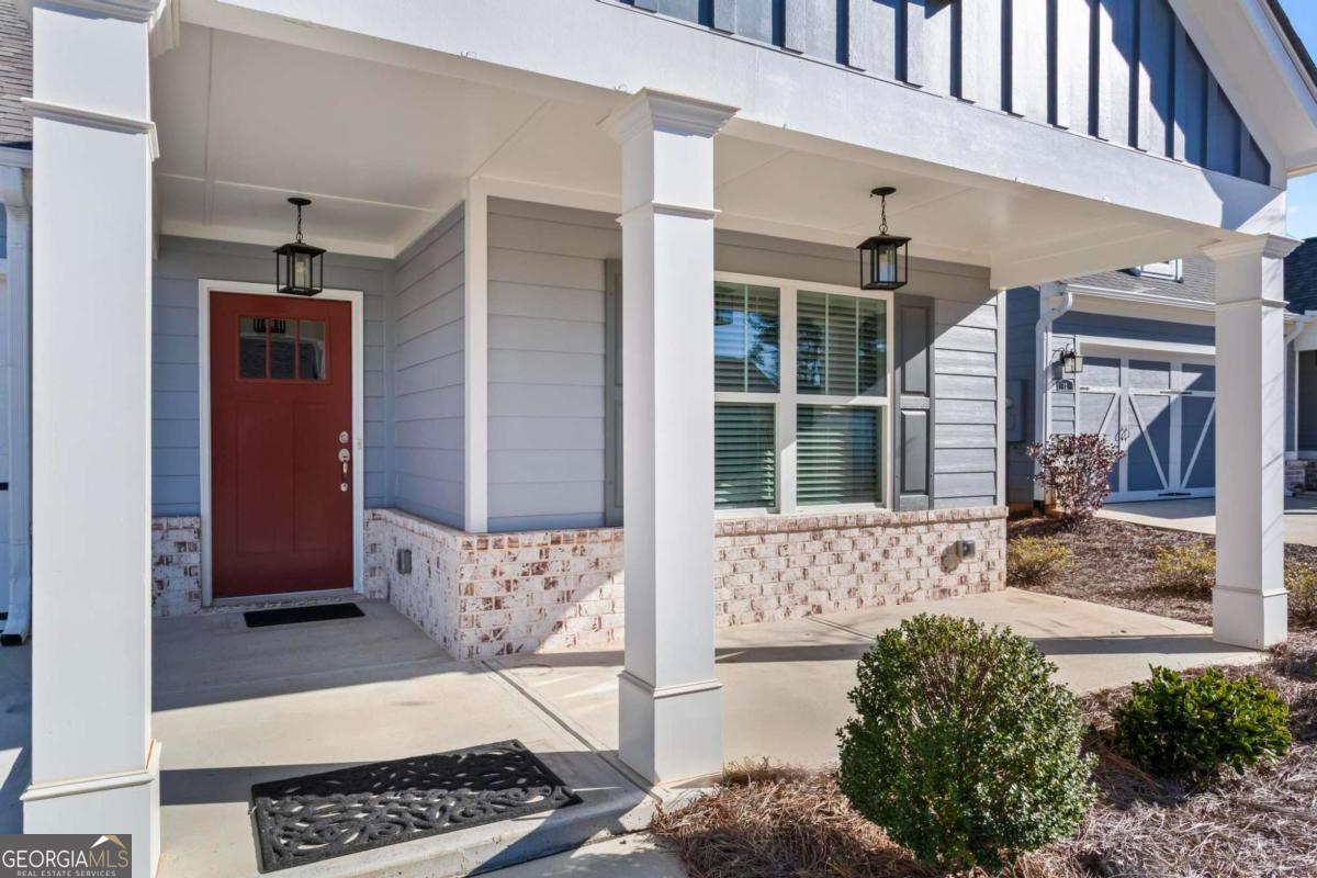 Like new (1 year old) Windsong home in beautiful Echols Farm. Featuring an oversized primary suite at the rear of the home with a spa like over-sized bathroom with generous walk-in shower, double vanities, a huge walk-in closet, and the luxury LVP was added to this room. Relax in the sunroom, or cozy up to a fire in the Great Room. Dining area will easily seat 12 people! HUGE chef's kitchen with double ovens, a gas cooktop, and a walk-in pantry! Soaring ceilings with a ton of windows make this home so welcoming. Finish the attic area for an extra room, or storage space. Laundry room has multiple custom cabinets, and a sink. The covered private rear patio is step-less to your outdoor living area, which is fenced with 2 gates and a covered area. Upon entering the gated community, you are greeted by beautiful landscaping surrounding the One-of-a-Kind Amenities, including a beautiful 2 Story clubhouse, which overlooks the lake with a fountain feature, walking trails, event area, where homeowners gather to share their love for arts and crafts. Join the activities any day or every day with homeowners as they play cards and games. Join the clubs, socials groups or just bring yourself to the covered outdoor patio at the Clubhouse or Event Barn to listen to the peaceful fountain as you relax!