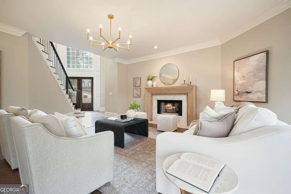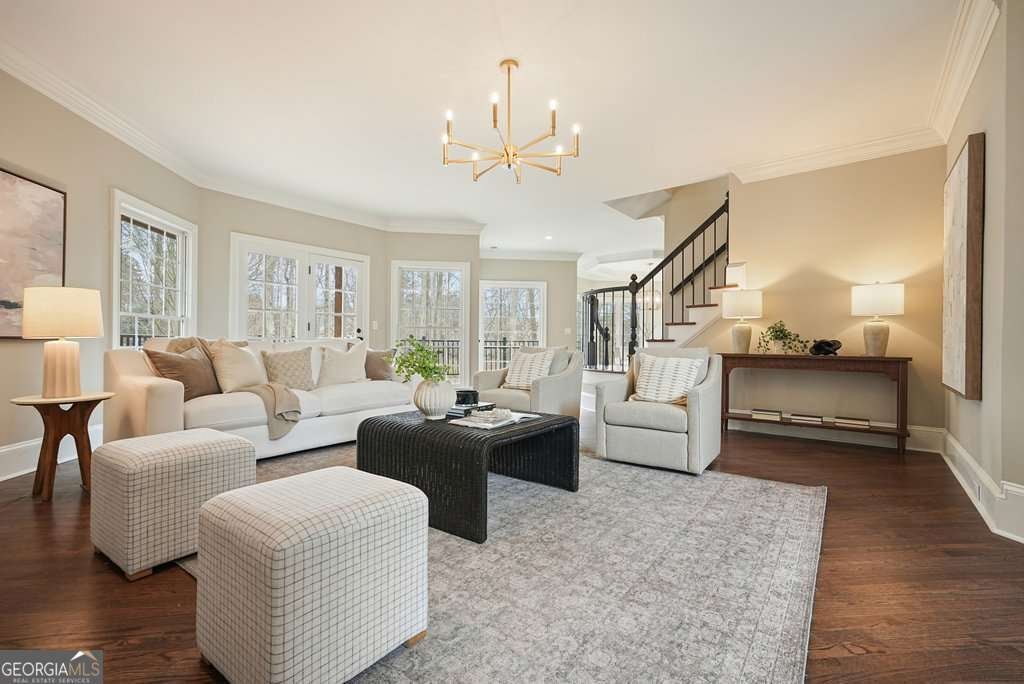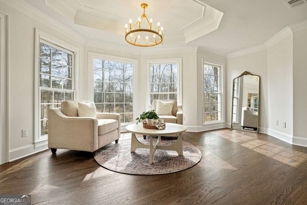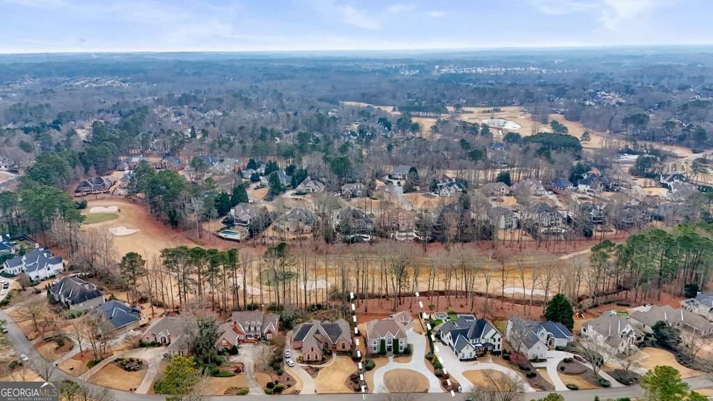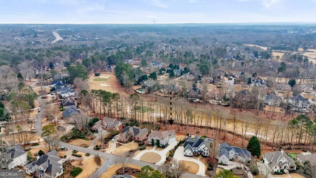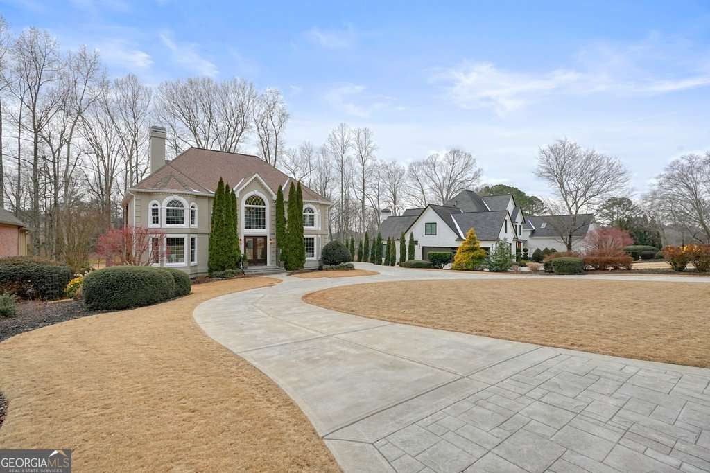 Exceptional opportunity to own on the 6th green in the prestigious Polo Golf & Country Club. This stunning estate offers sweeping golf course views and luxury living across three finished levels. Newly renovated with modern, high-end finishes, the home perfectly blends grand scale and timeless detail in one of Cumming's most sought-after golf communities. From the moment you arrive, the circular driveway and commanding 8-foot double entry doors create an undeniable presence. Inside, a breathtaking two-story foyer with a grand staircase and statement chandelier sets the tone for the entire home. Rich hardwood flooring flows throughout the main level and into the expansive primary suite. The main floor is thoughtfully designed for elevated, effortless living, featuring a private office, formal dining room with butler's pantry, chef's kitchen with island, breakfast area, walk-in pantry, laundry room, powder bath, and an inviting living room framed by panoramic golf course views. Both the living room and breakfast area open to the main-level covered porch, creating seamless indoor-outdoor living, while the office also enjoys access to this peaceful outdoor space overlooking the fairway. The primary suite is a retreat of its own. Spanning nearly 1,000 square feet, it serves as a private sanctuary with a sitting area, spa-inspired bath featuring dual vanities, soaking tub, and seamless glass shower with double shower heads, along with a generous walk-in closet featuring a custom closet system and space for the addition of a secondary washer and dryer. The suite extends onto a covered upper-level porch capturing sweeping golf course views and stunning sunsets. The home's upper level also includes three large secondary bedrooms, each with its own walk-in closet and direct bathroom access, including one with a private en-suite bath, while the remaining two share a Jack-and-Jill bath. The fully finished terrace level is designed for entertaining and flexible living, featuring a living area with dedicated sitting and dining spaces and a built-in bar. This level offers an additional bedroom and full bath, plus multiple rooms ideal for a gym, office, or flex space. The walk-out terrace level also provides direct backyard access. Outdoors, the property features a sodded front and backyard, elevated black aluminum fencing, and an irrigation system for easy maintenance. The expansive backyard offers ample space to add a pool, putting green, or design your own custom outdoor retreat while enjoying unmatched views. Don't miss this rare turnkey opportunity on one of the most desirable golf course lots.