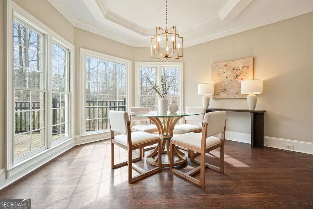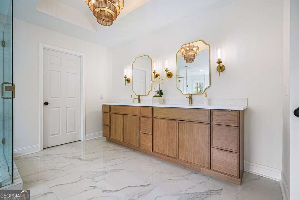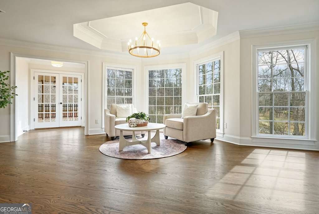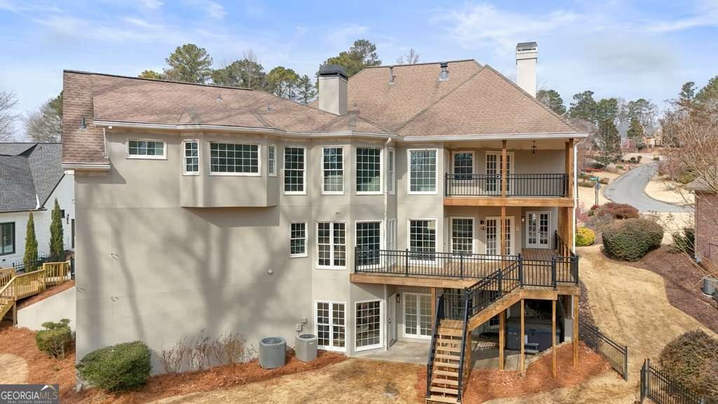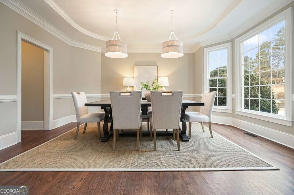 Exceptional opportunity to own on the 6th green in the prestigious Polo Golf & Country Club. This stunning estate offers sweeping golf course views and luxury living across three finished levels. Newly renovated with modern, high-end finishes, the home perfectly blends grand scale and timeless detail in one of Cumming's most sought-after golf communities. From the moment you arrive, the circular driveway and commanding 8-foot double entry doors create an undeniable presence. Inside, a breathtaking two-story foyer with a grand staircase and statement chandelier sets the tone for the entire home. Rich hardwood flooring flows throughout the main level and into the expansive primary suite. The main floor is thoughtfully designed for elevated, effortless living, featuring a private office, formal dining room with butler's pantry, chef's kitchen with island, breakfast area, walk-in pantry, laundry room, powder bath, and an inviting living room framed by panoramic golf course views. Both the living room and breakfast area open to the main-level covered porch, creating seamless indoor-outdoor living, while the office also enjoys access to this peaceful outdoor space overlooking the fairway. The primary suite is a retreat of its own. Spanning nearly 1,000 square feet, it serves as a private sanctuary with a sitting area, spa-inspired bath featuring dual vanities, soaking tub, and seamless glass shower with double shower heads, along with a generous walk-in closet featuring a custom closet system and space for the addition of a secondary washer and dryer. The suite extends onto a covered upper-level porch capturing sweeping golf course views and stunning sunsets. The home's upper level also includes three large secondary bedrooms, each with its own walk-in closet and direct bathroom access, including one with a private en-suite bath, while the remaining two share a Jack-and-Jill bath. The fully finished terrace level is designed for entertaining and flexible living, featuring a living area with dedicated sitting and dining spaces and a built-in bar. This level offers an additional bedroom and full bath, plus multiple rooms ideal for a gym, office, or flex space. The walk-out terrace level also provides direct backyard access. Outdoors, the property features a sodded front and backyard, elevated black aluminum fencing, and an irrigation system for easy maintenance. The expansive backyard offers ample space to add a pool, putting green, or design your own custom outdoor retreat while enjoying unmatched views. Don't miss this rare turnkey opportunity on one of the most desirable golf course lots.