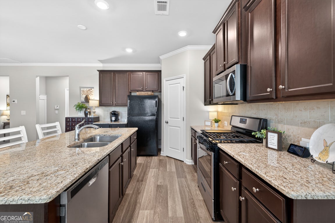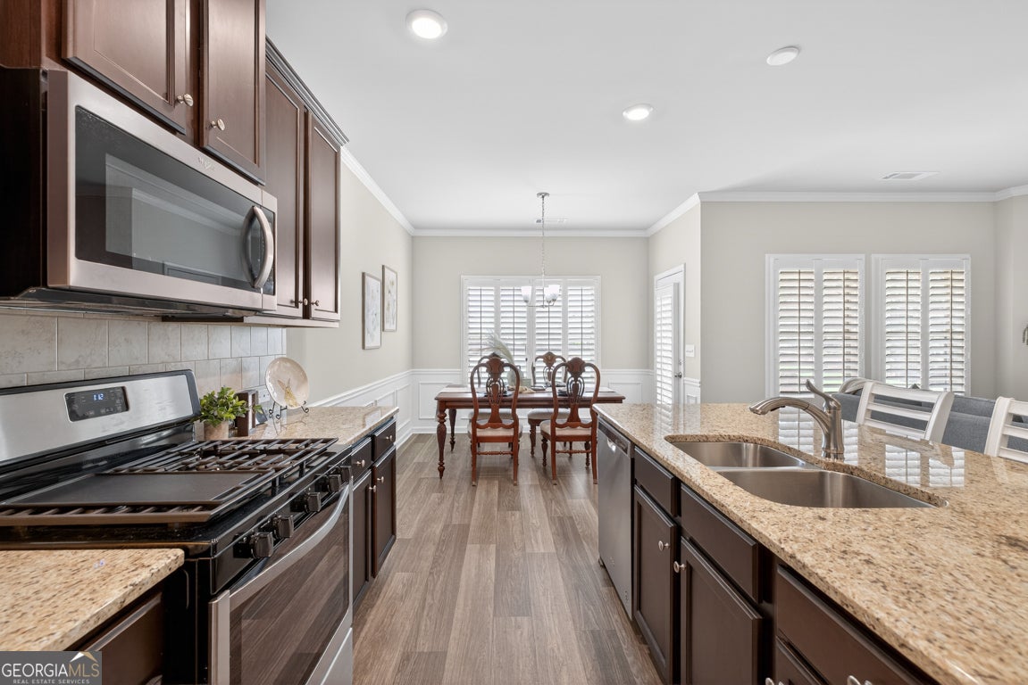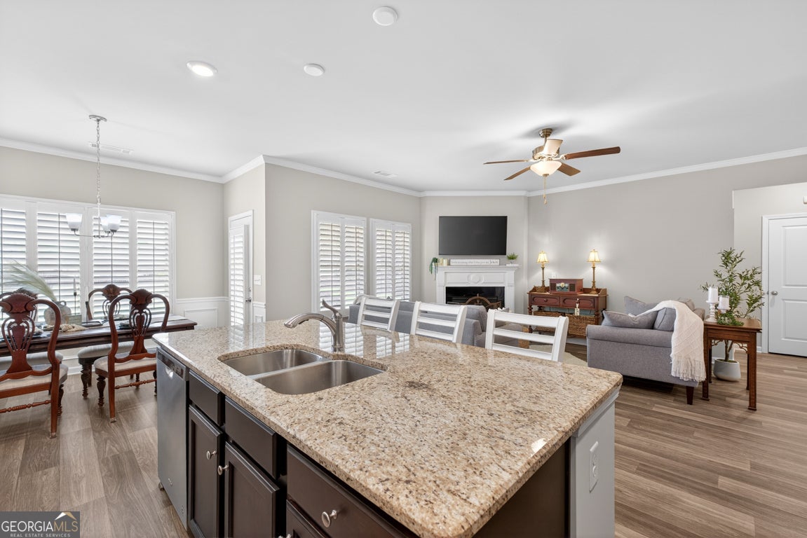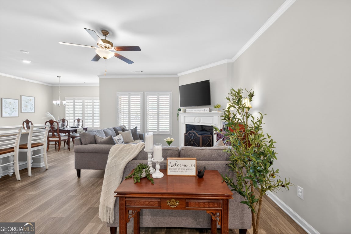 Welcome home to this beautifully maintained 3-bedroom, 2-bath Craftsman style Ranch home in the highly sought-after Brighton Park subdivision! This well-appointed home offers an inviting open-concept layout, enhanced by plantation shutters throughout and durable LVP flooring in the main living areas. The spacious kitchen is perfect for entertaining, featuring stained wood cabinetry, a center island with double sinks, a gas range, and a generous pantry. The adjoining living room showcases a cozy gas fireplace with a marble surround and classic mantle. Retreat to the oversized primary suite complete with trey ceilings, stunning crown molding, amazing natural light, and a massive walk-in closet. The en-suite bath offers a double vanity and a glass stand-up shower and private water closet! Bright and airy secondary bedrooms feature plush carpeting, crown molding, and plantation shutters, while the secondary bath includes a tub/shower combo and a stained wood vanity with ample storage and counter space. Enjoy outdoor living on the covered patio, perfect for relaxing in the shade on warm days. Such a wonderful community with great amenities like walking trails, playground, pool and more! Fantastic location near downtown Hoschton and Braselton for you to enjoy all the wonderful shopping, adorable coffee shops, dining, parks and so much more! This home offers comfort, style, and accessibility all in one!