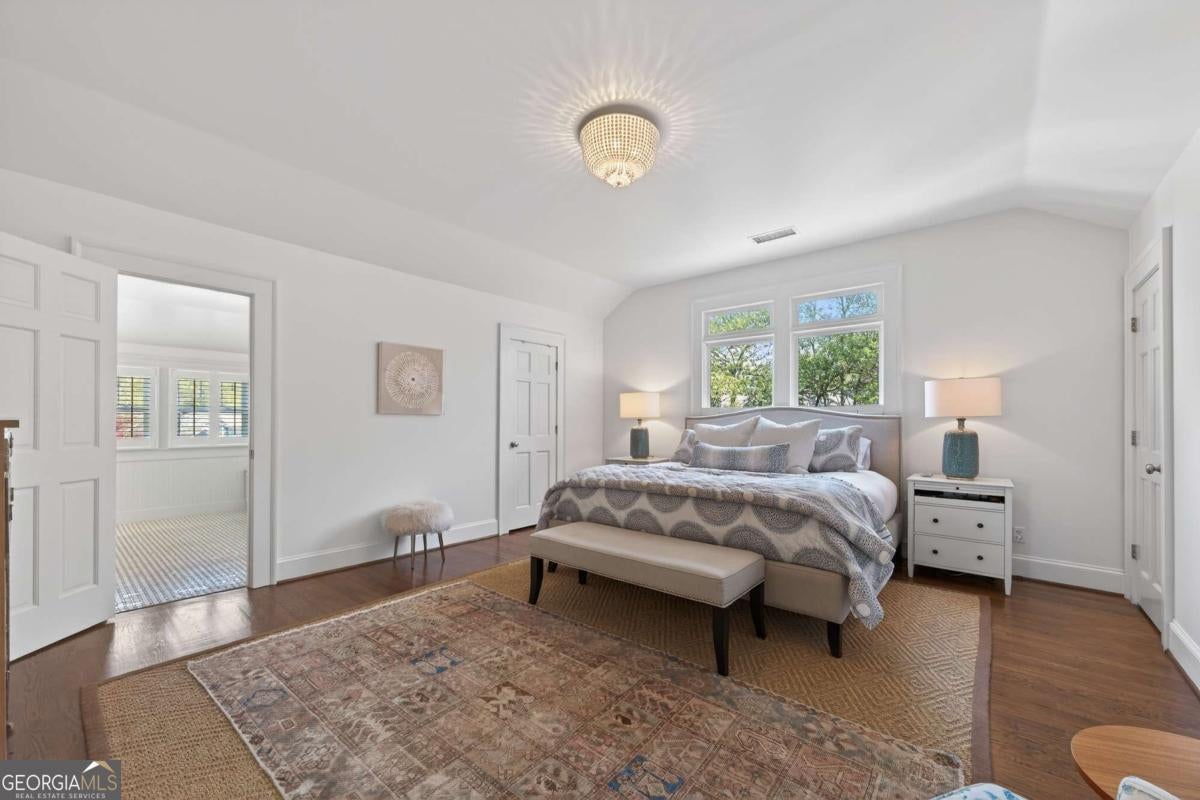 Tudor masterpiece in Decatur's Great Lakes neighborhood. Built in 1933 for local Judge Frank Guess, this 5BR/4BA home offers 3,100+ SF of sophisticated space on a private corner lot. Stately curb appeal with stone exterior, arched doorways, and Tudor-style windows. Formal living room w/ marble fireplace, original woodwork, plantation shutters, built-in bookshelves, and access to turret-shaped screened porch w/ haint blue ceiling. Spacious dining room w/ corner built-ins. Kitchen features 6-burner Bertazzoni Italian range w/ matching refrigerator, chevron tile backsplash, inset cabinetry, bountiful storage, and generous island seating. Den off kitchen w/ built-ins and abundant light. Guest suite on main. Elevated full bath w/ marble hexagon floors and glass shower. Every finish and detail is elevated - lighting, tile, faucets, countertops throughout. Primary suite upstairs is spacious and private w/ basket weave marble tile, walk-in shower, wainscoting details, marble countertops, and three deep closets. Two additional guest bedrooms, skylit bath w/ shiplap and chevron floors, light-filled landing ideal as media space, dedicated laundry room. Carriage house is a spacious two-car garage and EV charger below and beautifully finished apartment above w/ tall ceilings, full bath, and large storage closet - perfect guest suite, home office, teen hangout or studio. Private fenced yard w/ fresh sod, Japanese maple, string lights, and expansive back patio. Sophisticated exterior lighting and lush landscaping. Walk to downtown Decatur, Kimball House, Iberian Pig, Wednesday Farmers Market at First Baptist Church, and Glenlake Park (tennis, playground, seasonal pool). Coveted City Schools of Decatur. Quick commute to Emory, CDC, Midtown.