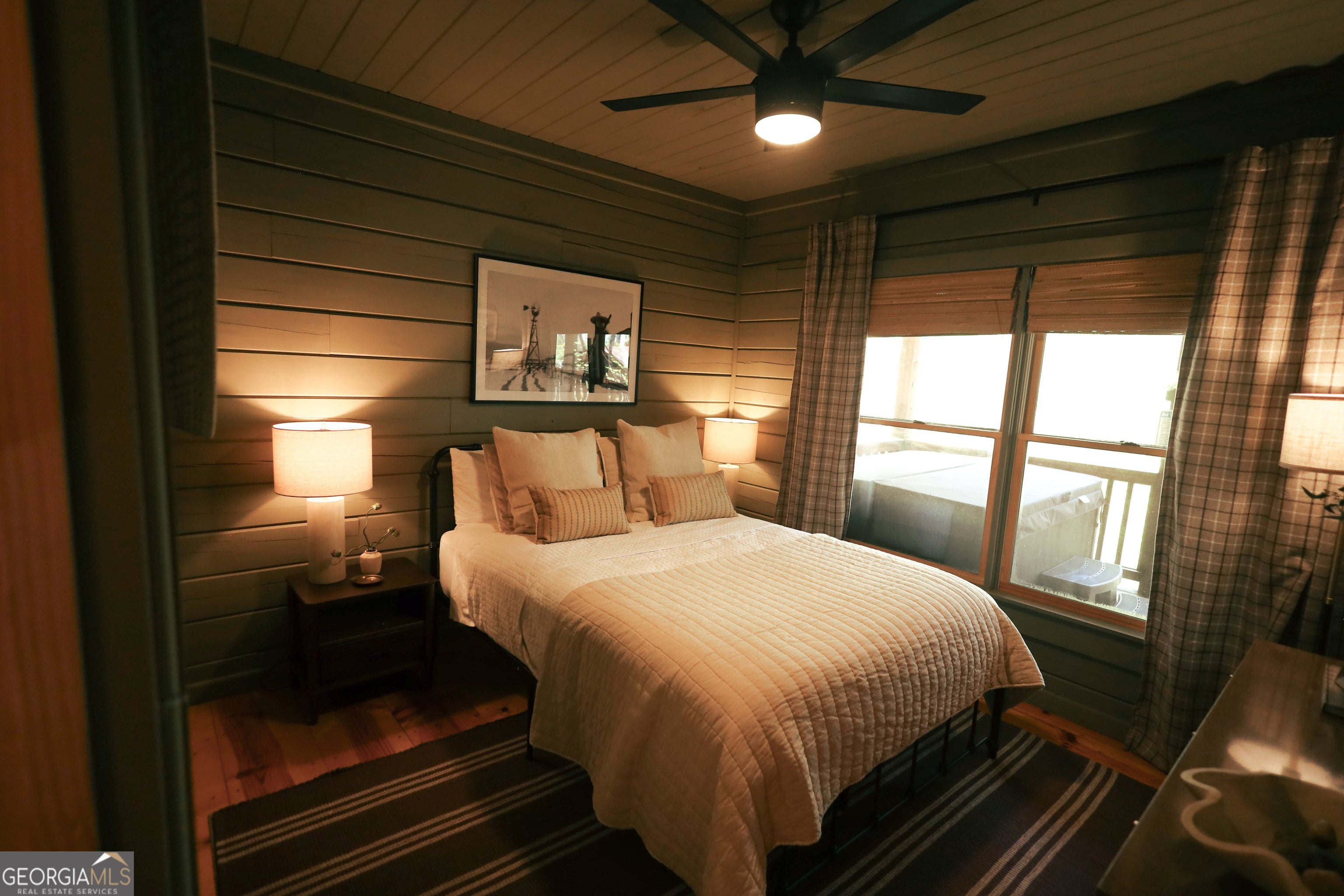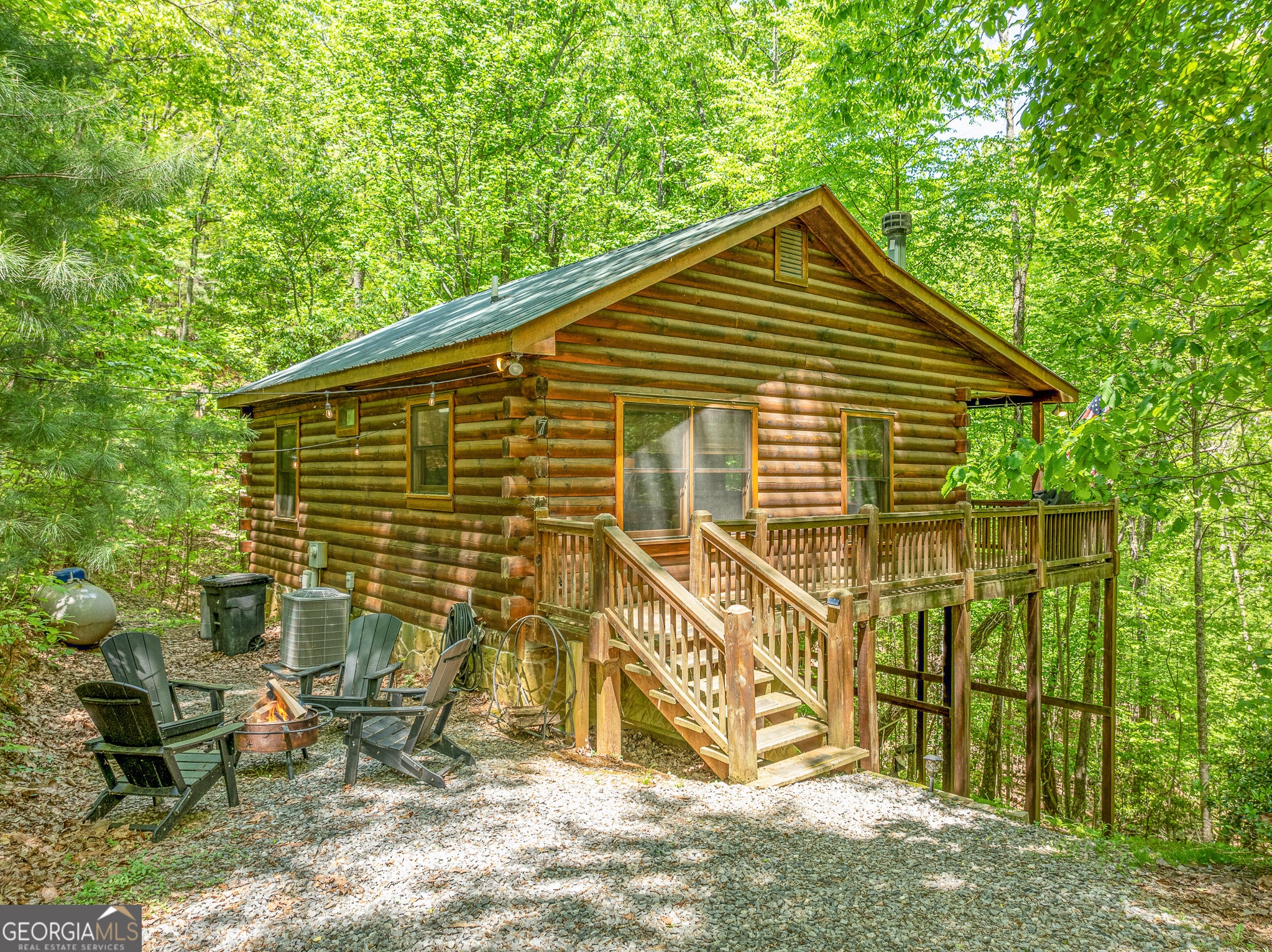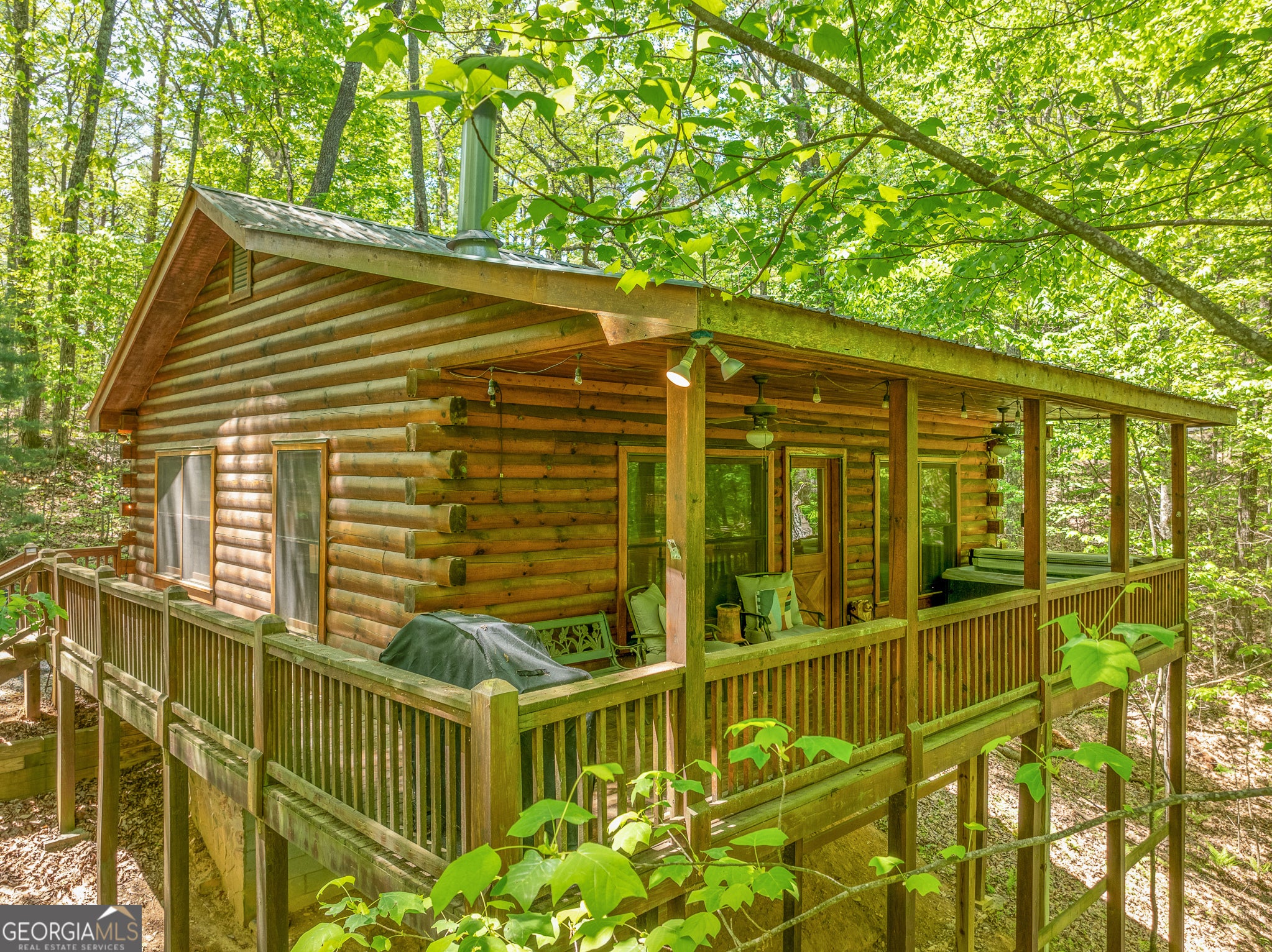 Freshly updated with new interior paint, stylish furnishings, and curated accessories, The Wildwood House is the perfect blend of rustic charm and stylish, modern comfort. Nestled on a serene 1.5+ acre corner lot in the scenic Cherry Lake subdivision, this true-log cabin invites you to unwind in style. Step inside to find a warm, inviting great room wrapped in rich tongue-and-groove wood finishes and anchored by a cozy, wood-burning fireplace - perfect for snuggling up on chilly mountain nights. The open-concept kitchen, featuring cheerful green cabinetry and modern appliances, flows seamlessly into a dining area with seating for four, making entertaining easy and relaxed. With 2 bedrooms, a full bath, and a laundry closet all on one level, the layout is smart and efficient-ideal for low-maintenance living or hosting guests comfortably. The bedrooms have been color drenched in soothing mountain tones to keep the rustic warmth yet still being modern. Step outside and embrace the mountain lifestyle on the expansive wrap-around porch. Soak your cares away in the private hot tub while listening to the sounds of nature or gather around the firepit under the stars with friends and family. Adirondack chairs, fireflies, and the peacefulness of the woods create the ultimate North Georgia experience. Located between the vibrant mountain towns of Blue Ridge and Ellijay, you're perfectly positioned for outdoor adventures like hiking and biking, visits to local wineries, or exploring boutique shops and farm-to-table dining. This turn-key cabin is ready for whatever you envision-whether it's a money-making investment, your weekend getaway, or a peaceful full-time home. Don't miss your chance to own this refreshed, rustic-meets-modern retreat. The Wildwood House is calling-come see it today!