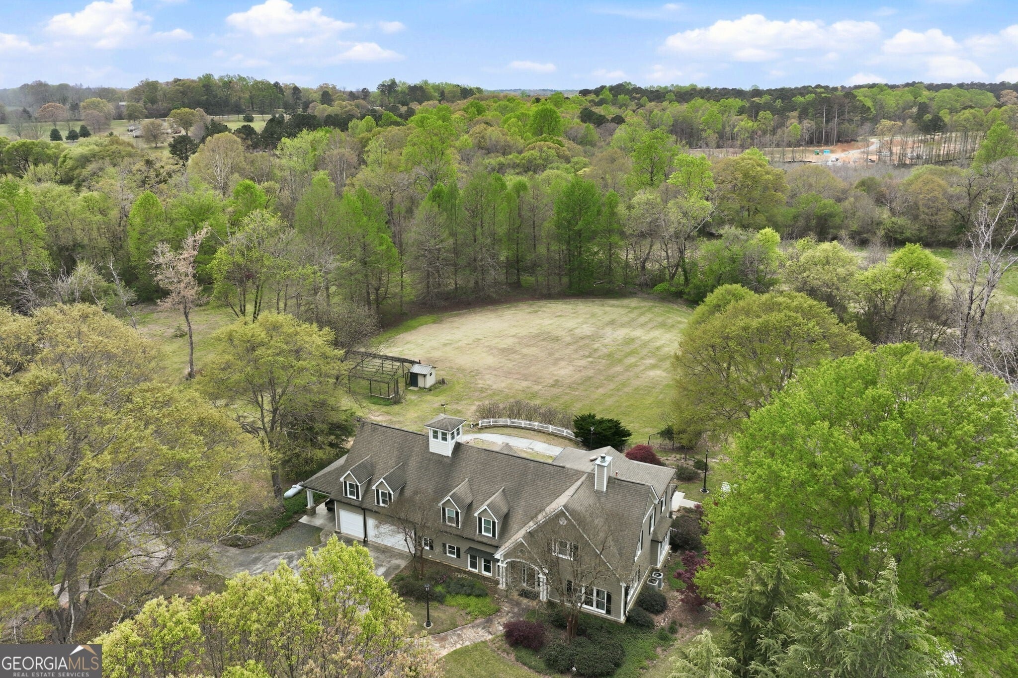 Discover a stunning and private oasis in Hoschton, Georgia, situated on just over 20 intentiuonally designed acres. This exceptional gated property offers an abundance of amenities. The expansive, custom built residence located at the end of a winding drive features four bedrooms, four bathrooms, a media/bonus room, formal dining room and a family room with a cozy fireplace, encompassing over 4,300 square feet of living space. Additionally, a separate detached office with its own entrance, a full bath, a garage and a storage area present an ideal setting for a home-based business, a workshop or the potential to convert into a guest or in-law cottage. Further enhancing this remarkable property are a second detached garage, a netted greenhouse, a potting shed, a private pond, a creek, a 50-yard putting green, and several expansive fields that offer excellent opportunities for outdoor sports. If you're considering options for expansion into a family compound, this property also includes multiple prime building sites suitable for future homes or structures.
