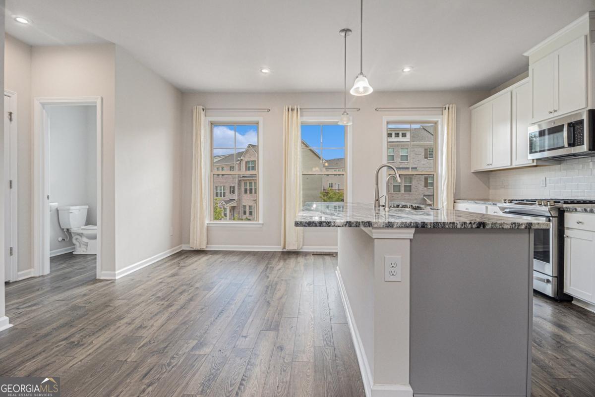 Beautiful newly built townhouse located in Lawrenceville near Bethesda Park. This 3-bedroom corner lot offers 3.5 bathrooms and 2,000 square feet of living space. The home features an open floor plan with a spacious kitchen overlooking the family area. The eat-in kitchen boasts all-white cabinetry with marble countertops and stainless appliances. Oversized windows throughout main level with hardwood floors. Upstairs,the primary suite and secondary bedroom each have their own bathrooms for privacy. The third bedroom,also a suite,is located on the first floor. The property is conveniently accessible to major highways,grocery stores,aquatic center and more.