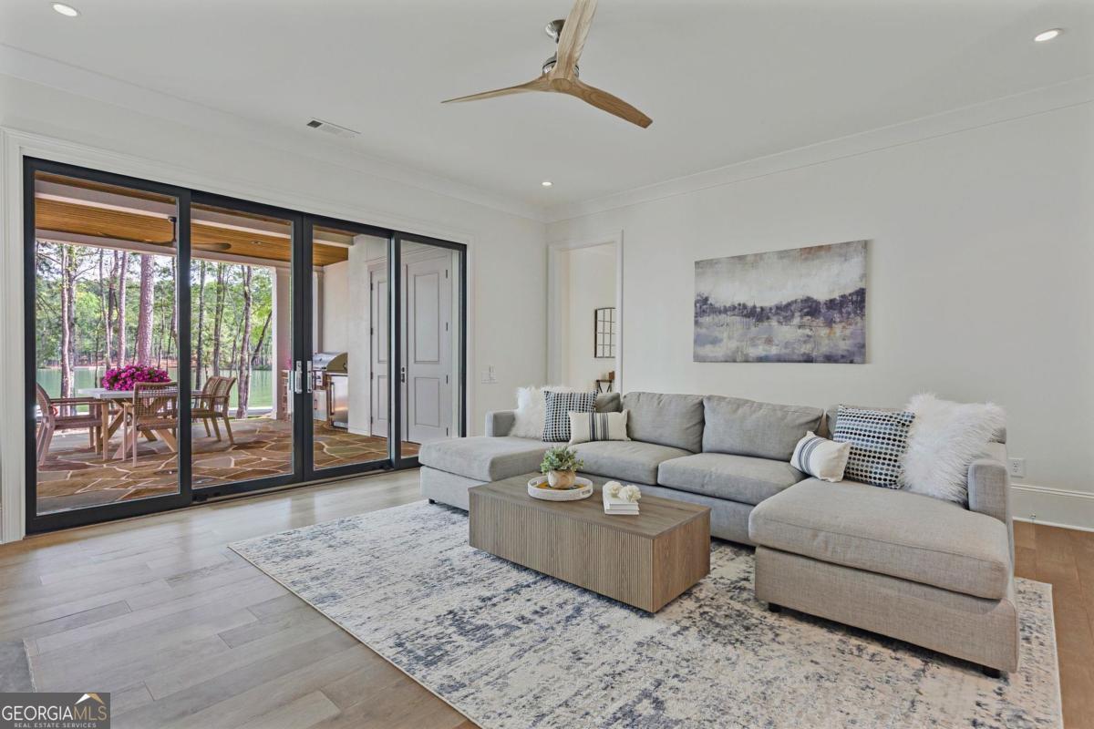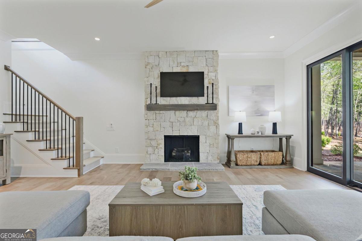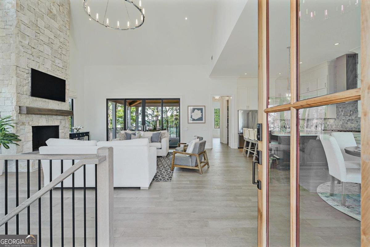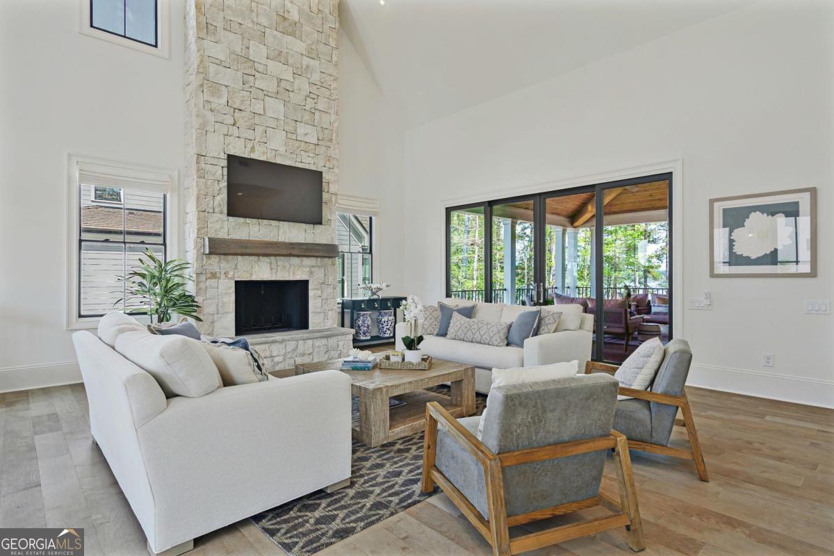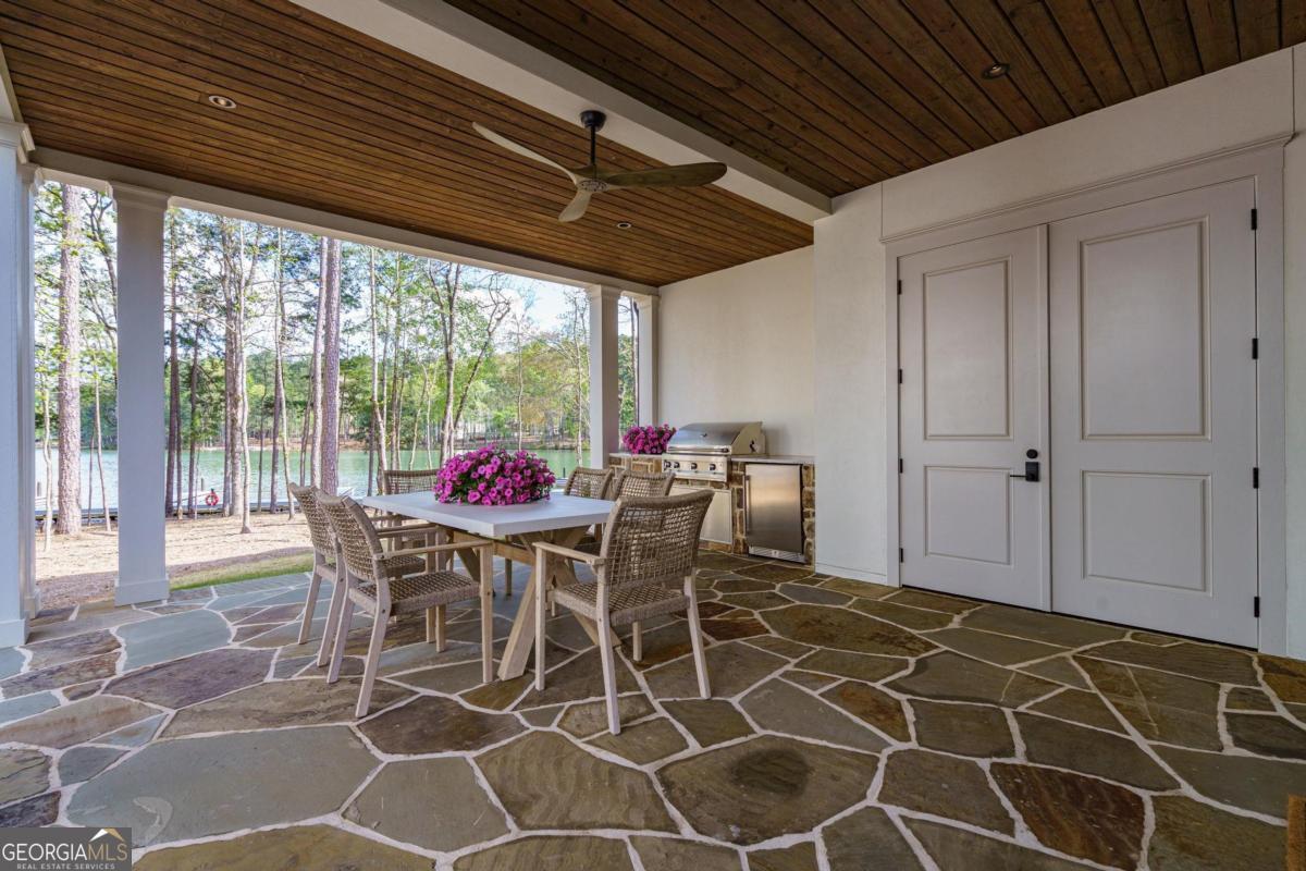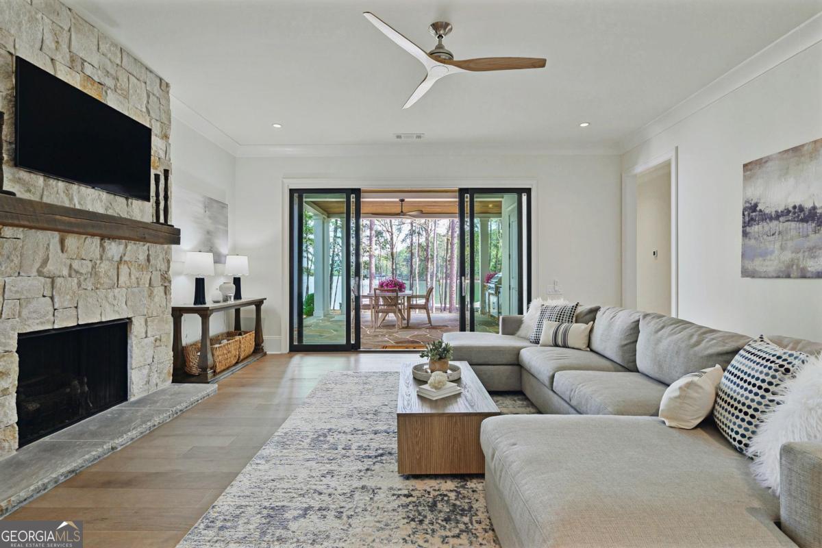 LAKEFRONT LIFESTYLE IN RICHLAND POINTE VILLAGE STEPS FROM THE WATER AND RESORT STYLE AMENITIES WITH LAKE VIEWS FROM ALMOST EVERY ROOM. Nestled in the heart of Richland Pointe, this thoughtfully crafted home blends an inviting, elevated style with one of the most walkable settings in Reynolds Lake Oconee, just steps from the Richland Pointe marina, restaurant, pool, and wellness amenities. The main level wows you with big lake views and an open-concept layout anchored by a great room with vaulted ceilings and a stacked stone fireplace, flowing seamlessly into the chef's kitchen. The kitchen is centered around an expansive eat-in island, complemented by a premium appliance package and striking tilework that adds texture and visual interest to the naturally bright space. A centrally located dining area allows for easy entertaining and connects to a wet bar with additional refrigeration and prep space. Clean lines, soft tones, and thoughtful material selections give the home a polished, inviting feel. Outdoor living extends directly from the great room through sliding French doors to the covered patio, where a stacked stone fireplace and wood-lined ceiling create a true extension of the interior, well suited for secondary dining space, entertaining, and taking in the water views. The primary suite is set on the main level and captures long lake views through a wall of windows, with vaulted ceilings and a wood beam accent adding architectural interest. The bath is bright and clean, finished with dual vanities, generous storage, and a layout that feels both open and functional. Direct access to the laundry room adds convenience. The terrace level is centered around a spacious secondary living area with a third fireplace and walkout access to the outdoor living space, where a built-in grill and flagstone patio create a natural setting for entertaining. Three additional en suite bedrooms offer privacy for guests, each with its own distinct combination of tile and cabinetry, giving every space a tailored, individual feel. Enjoy access to boat slips just steps from the home, along with the convenience of storing your boat at the Richland Pointe Marina next door. A must-see home that brings together indoor-outdoor living, thoughtful design, and a location that can't be beat! It is rare to find a lakefront home steps from the new Richland amenities. This is more than a lake home, it is the ultimate lake lifestyle! Seller makes membership available.