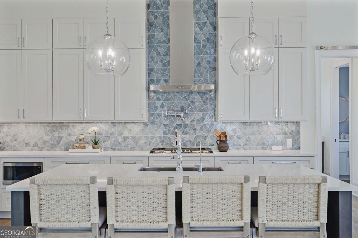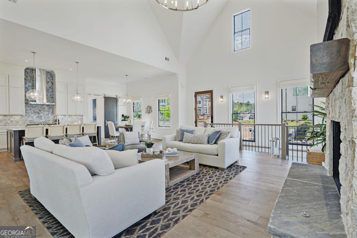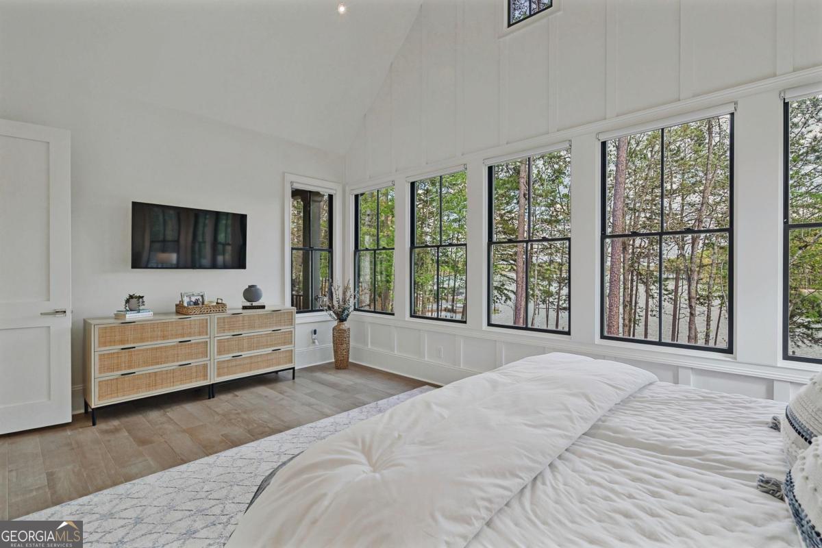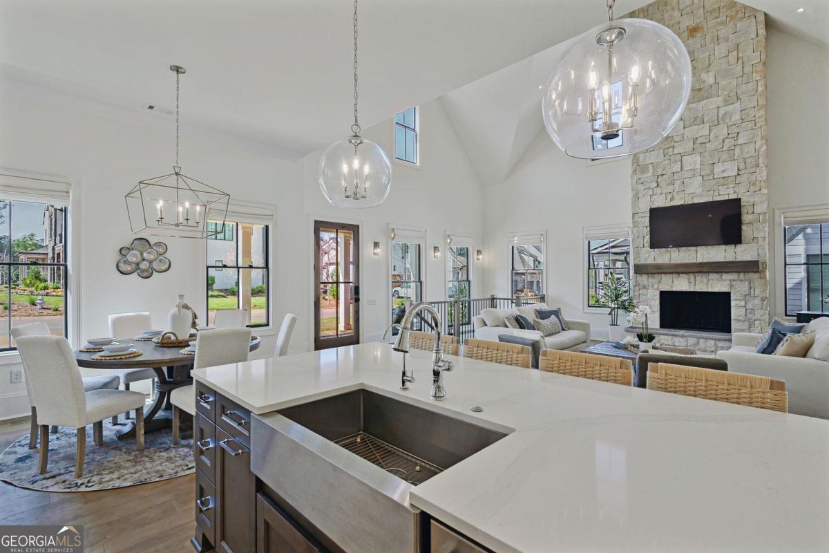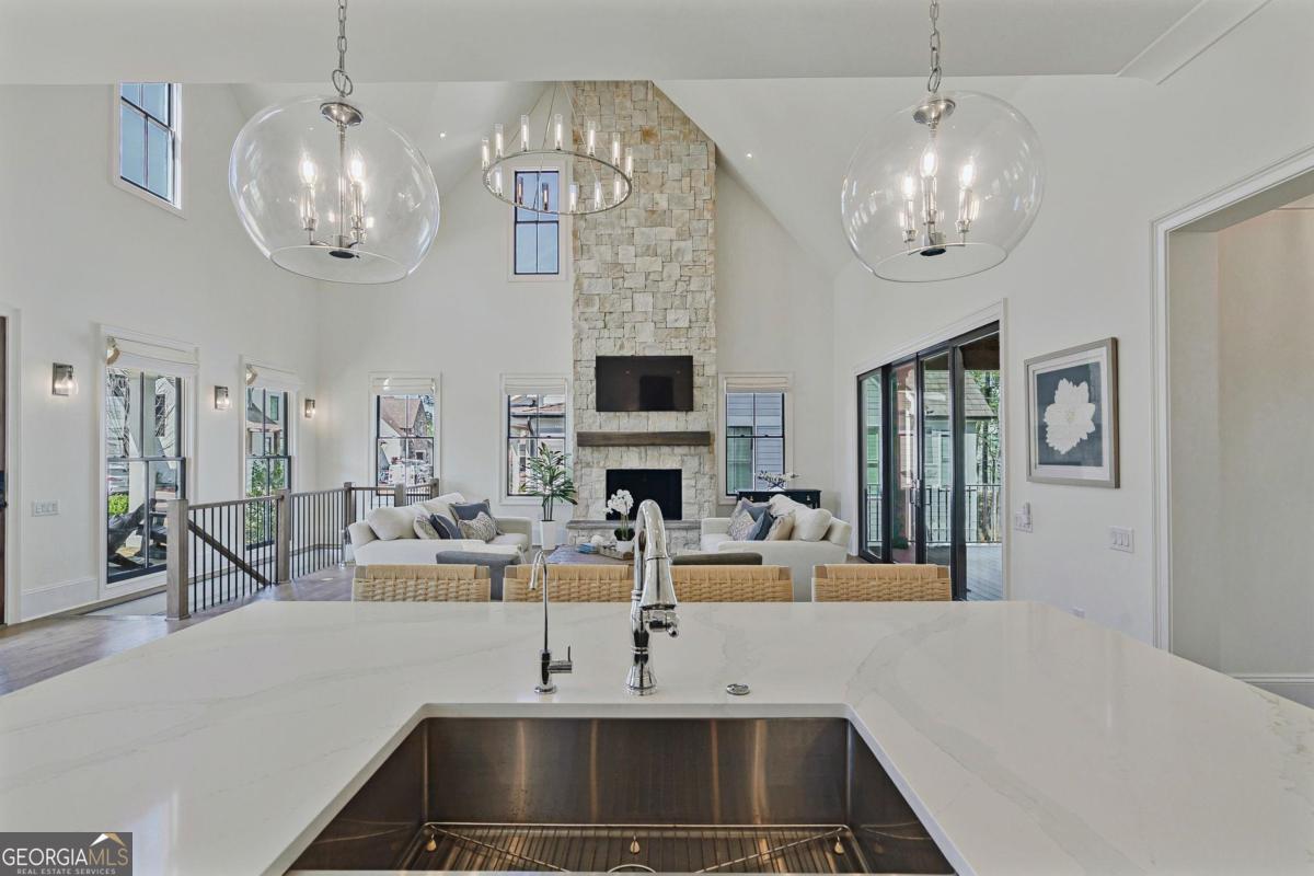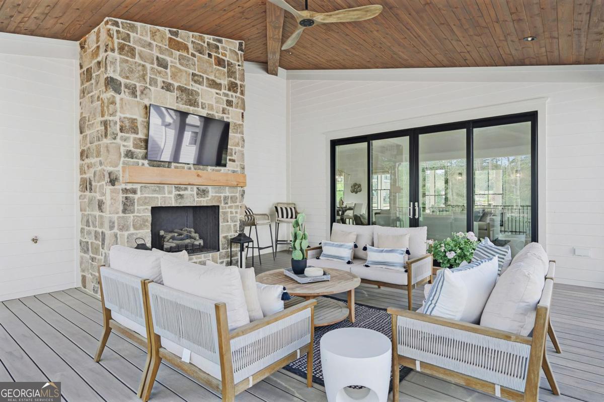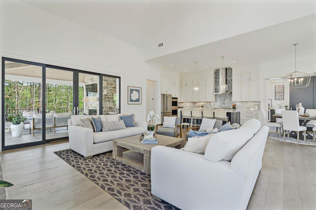 LAKEFRONT LIFESTYLE IN RICHLAND POINTE VILLAGE STEPS FROM THE WATER AND RESORT STYLE AMENITIES WITH LAKE VIEWS FROM ALMOST EVERY ROOM. Nestled in the heart of Richland Pointe, this thoughtfully crafted home blends an inviting, elevated style with one of the most walkable settings in Reynolds Lake Oconee, just steps from the Richland Pointe marina, restaurant, pool, and wellness amenities. The main level wows you with big lake views and an open-concept layout anchored by a great room with vaulted ceilings and a stacked stone fireplace, flowing seamlessly into the chef's kitchen. The kitchen is centered around an expansive eat-in island, complemented by a premium appliance package and striking tilework that adds texture and visual interest to the naturally bright space. A centrally located dining area allows for easy entertaining and connects to a wet bar with additional refrigeration and prep space. Clean lines, soft tones, and thoughtful material selections give the home a polished, inviting feel. Outdoor living extends directly from the great room through sliding French doors to the covered patio, where a stacked stone fireplace and wood-lined ceiling create a true extension of the interior, well suited for secondary dining space, entertaining, and taking in the water views. The primary suite is set on the main level and captures long lake views through a wall of windows, with vaulted ceilings and a wood beam accent adding architectural interest. The bath is bright and clean, finished with dual vanities, generous storage, and a layout that feels both open and functional. Direct access to the laundry room adds convenience. The terrace level is centered around a spacious secondary living area with a third fireplace and walkout access to the outdoor living space, where a built-in grill and flagstone patio create a natural setting for entertaining. Three additional en suite bedrooms offer privacy for guests, each with its own distinct combination of tile and cabinetry, giving every space a tailored, individual feel. Enjoy access to boat slips just steps from the home, along with the convenience of storing your boat at the Richland Pointe Marina next door. A must-see home that brings together indoor-outdoor living, thoughtful design, and a location that can't be beat! It is rare to find a lakefront home steps from the new Richland amenities. This is more than a lake home, it is the ultimate lake lifestyle! Seller makes membership available.