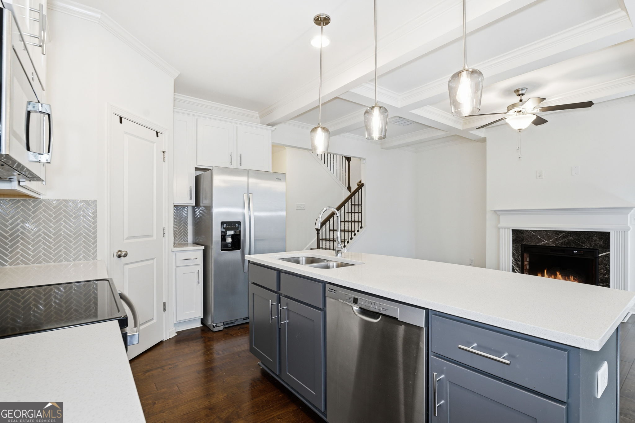 Immaculate corner-unit townhome that looks and feels brand new. Lightly lived in and beautifully upgraded, this 3-bedroom, 2.5-bath home features coffered ceilings in Family Room, gas fireplace with TV connections above, and a bright open layout that flows into an eat-in dining area. The stylish kitchen is perfect for entertaining with stainless steel appliances, including a brand-new stainless steel side-by-side refrigerator, and a upgraded quartz island that seats four. Upstairs, a versatile loft offers the perfect space for a home office, private gym, or second family room. The spacious owner's suite features a custom-tiled, spa-style shower. Quartz countertops are carried throughout the home, including all bathrooms. Washer, dryer, and garage door openers are included. Located in the sought-after Seaboard Township community near shopping, dining, and walking distance to the Silver Comet Trail, with HOA amenities including yard maintenance and a community pool.