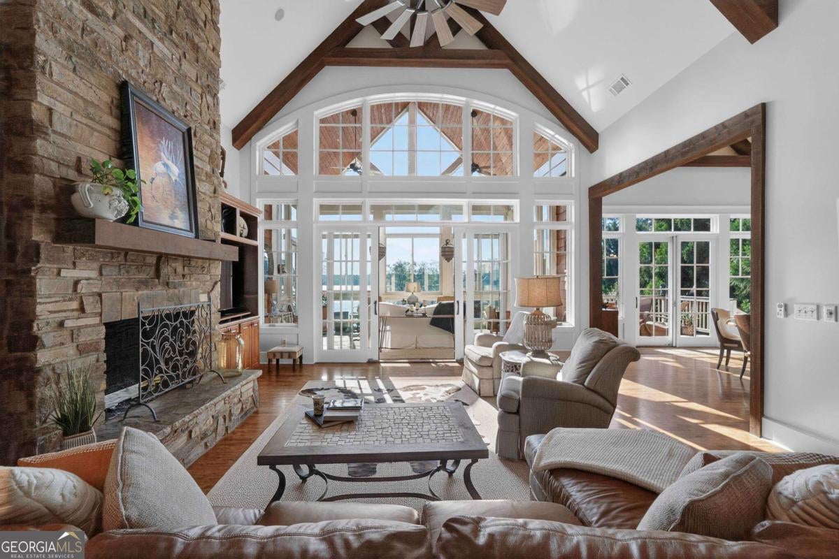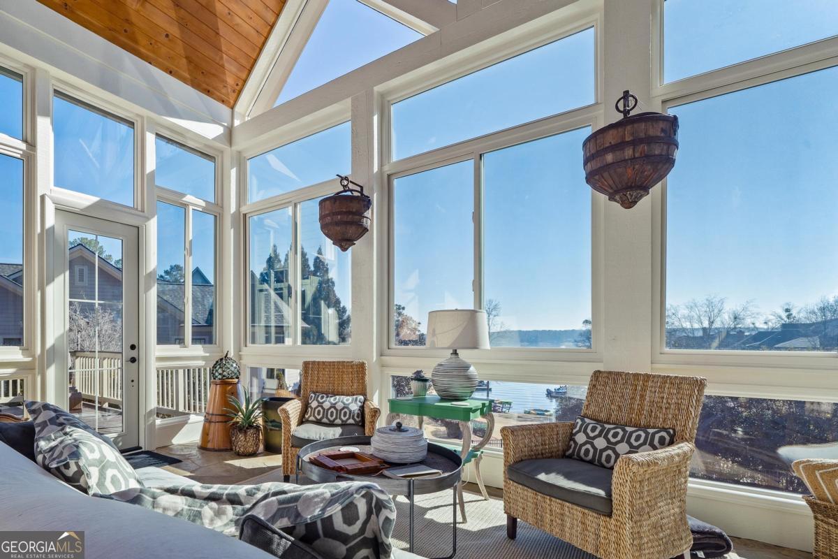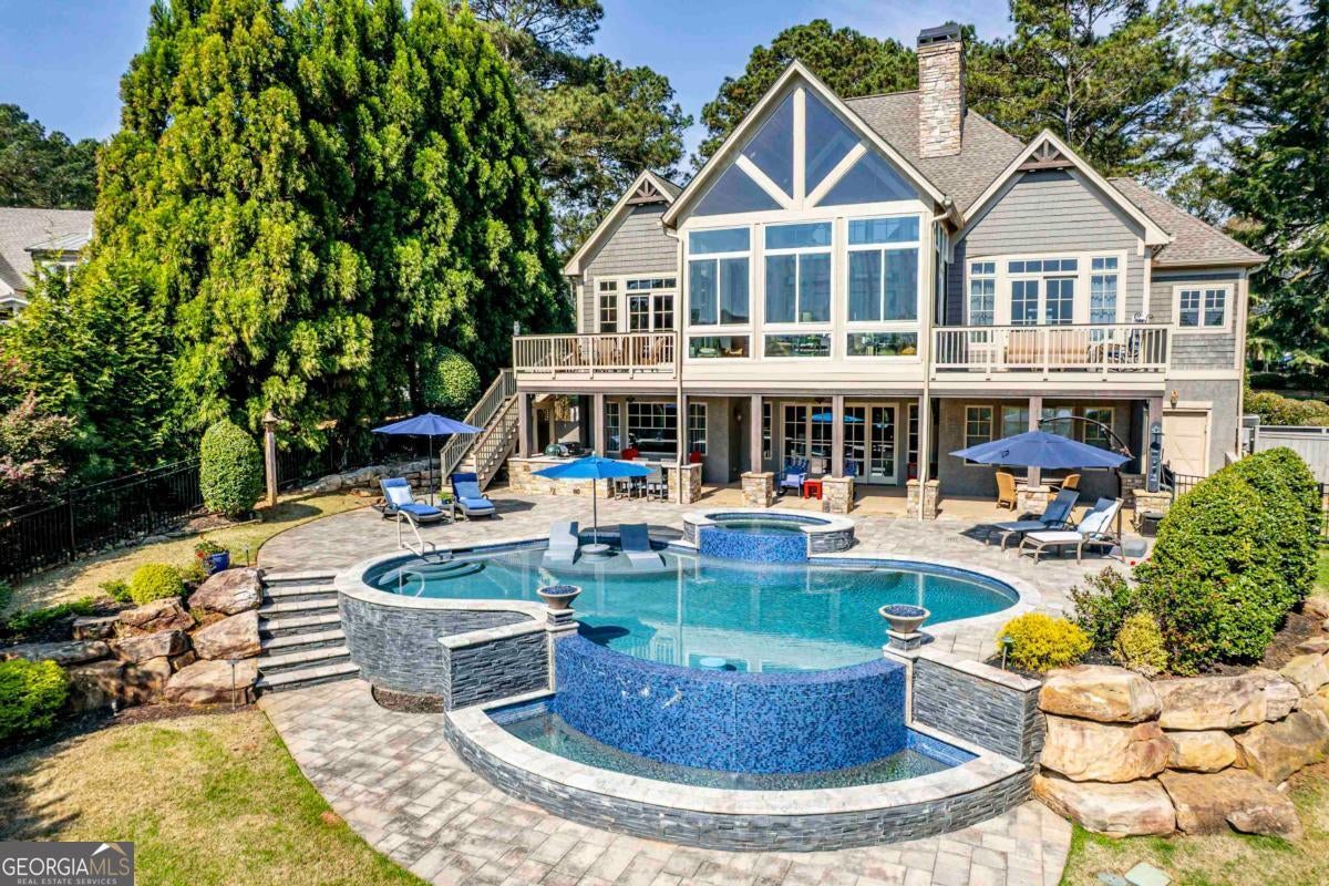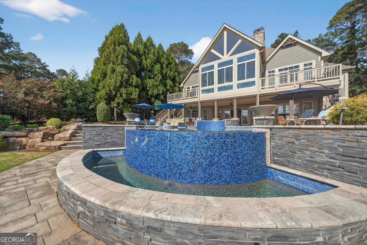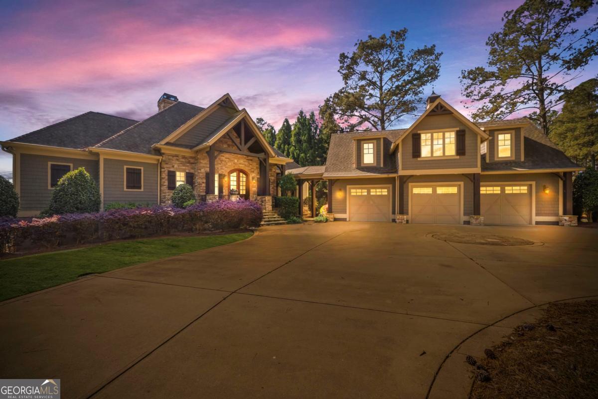 Enjoy breathtaking lake views and front-row spectacular holiday fireworks from this stunning Craftsman-style retreat in the private golf course community of Cuscowilla on Lake Oconee. This beautifully designed 4 bedroom, and 3.5 bath (main home) perfectly captures the essence of refined lake living. At the heart of the home is a chef's kitchen featuring large island, spacious dining area, and a dramatic vaulted family room w/soaring floor to ceiling stone fireplace and a charming loft above. The main living area flows seamlessly into a sun-drenched sunroom with all new windows, offering tranquil lake views. The spacious primary suite on the main level is a peaceful sanctuary, with its own fireplace an private porch-an idyllic setting for morning coffee or sunset lake views. Terrace level is designed for entertaining, featuring a generous great room w/fireplace and bar along with 3 additional bedrooms. The terrace level includes an infinity pool, hot tub and outdoor kitchen. The property includes an assigned boat slip is just steps from the yard. The over the garage guest quarters with bath is ideal for sleeping 6 to 8 extra people. Great for entertaining. Professionally landscaped grounds . Assigned Slip. Tritoon, golf cart and furnishings are negotiable. Golf membership is available.