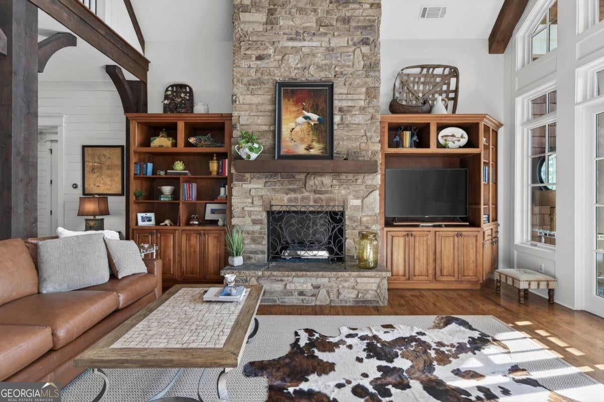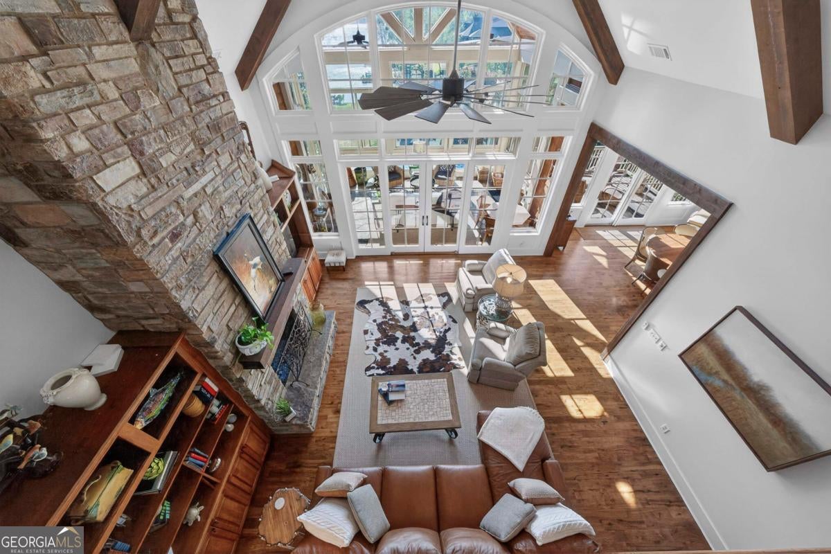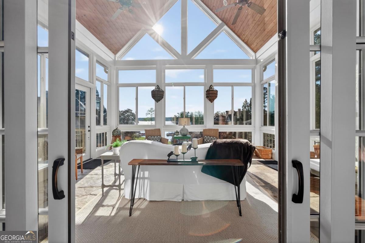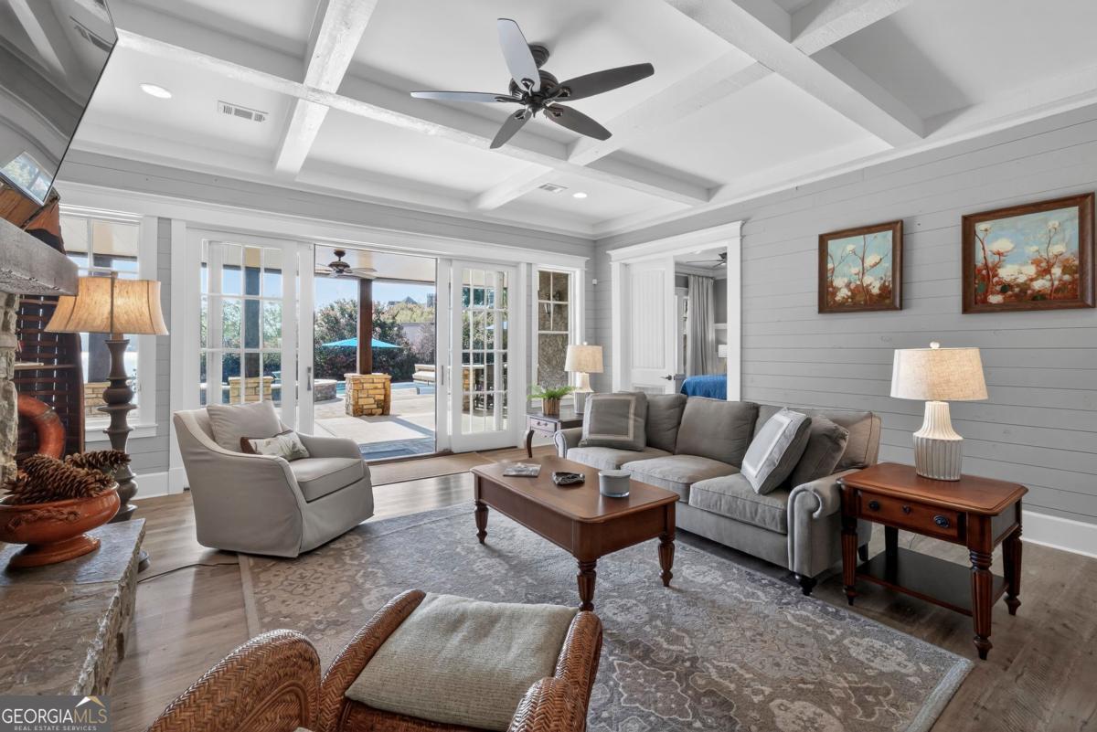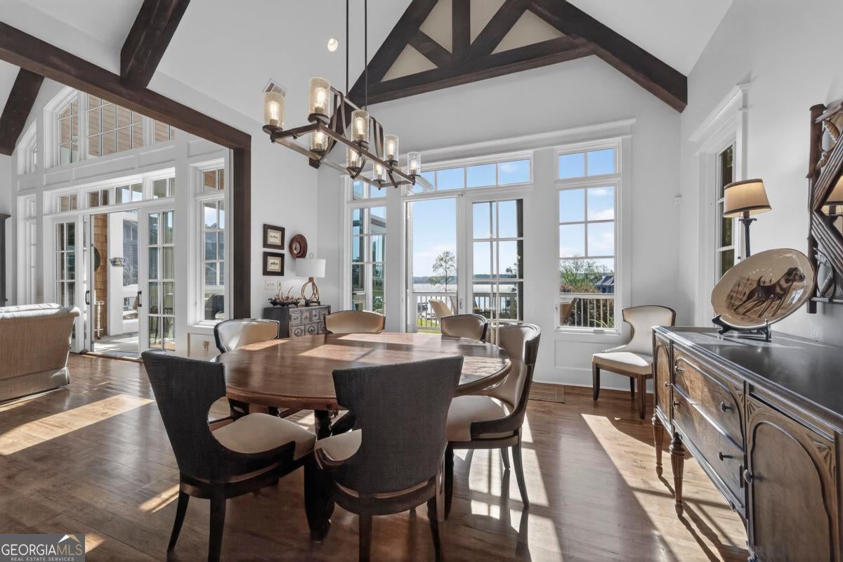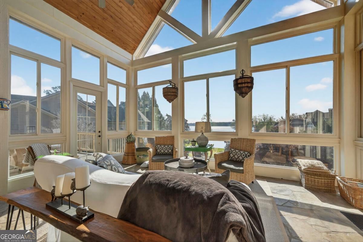Enjoy breathtaking lake views and front-row spectacular holiday fireworks from this stunning Craftsman-style retreat in the private golf course community of Cuscowilla on Lake Oconee. This beautifully designed 4 bedroom, and 3.5 bath (main home) perfectly captures the essence of refined lake living. At the heart of the home is a chef's kitchen featuring large island, spacious dining area, and a dramatic vaulted family room w/soaring floor to ceiling stone fireplace and a charming loft above. The main living area flows seamlessly into a sun-drenched sunroom with all new windows, offering tranquil lake views. The spacious primary suite on the main level is a peaceful sanctuary, with its own fireplace an private porch-an idyllic setting for morning coffee or sunset lake views. Terrace level is designed for entertaining, featuring a generous great room w/fireplace and bar along with 3 additional bedrooms. The terrace level includes an infinity pool, hot tub and outdoor kitchen. The property includes an assigned boat slip is just steps from the yard. The over the garage guest quarters with bath is ideal for sleeping 6 to 8 extra people. Great for entertaining. Professionally landscaped grounds . Assigned Slip. Tritoon, golf cart and furnishings are negotiable. Golf membership is available.