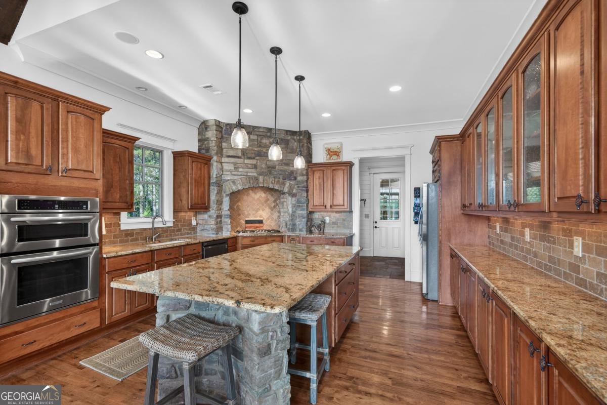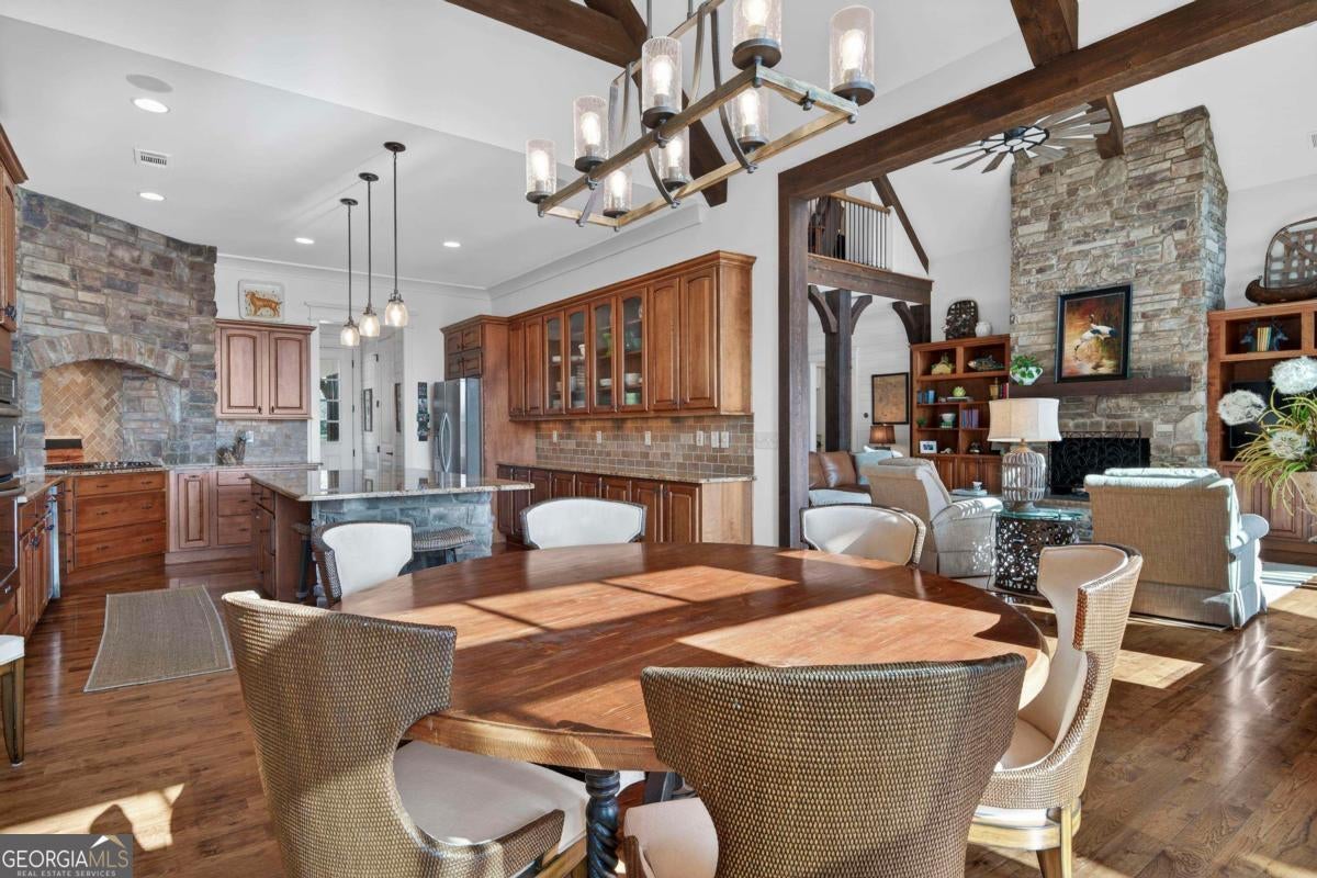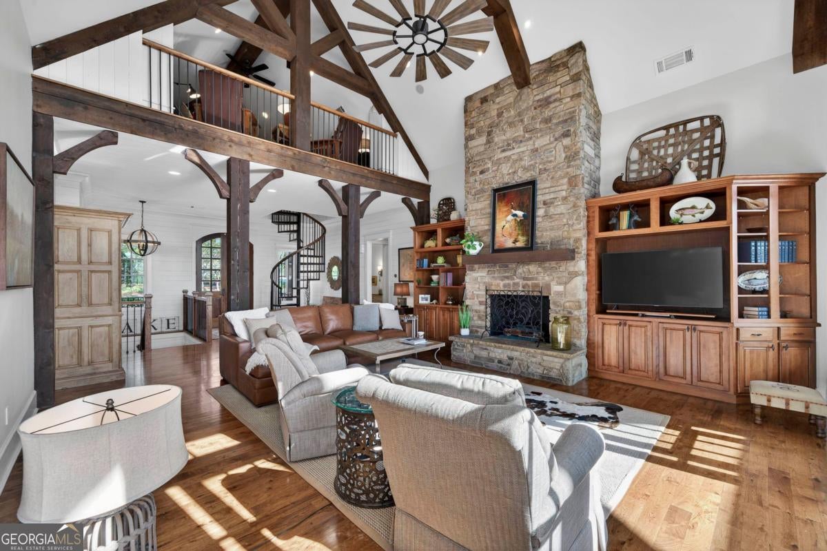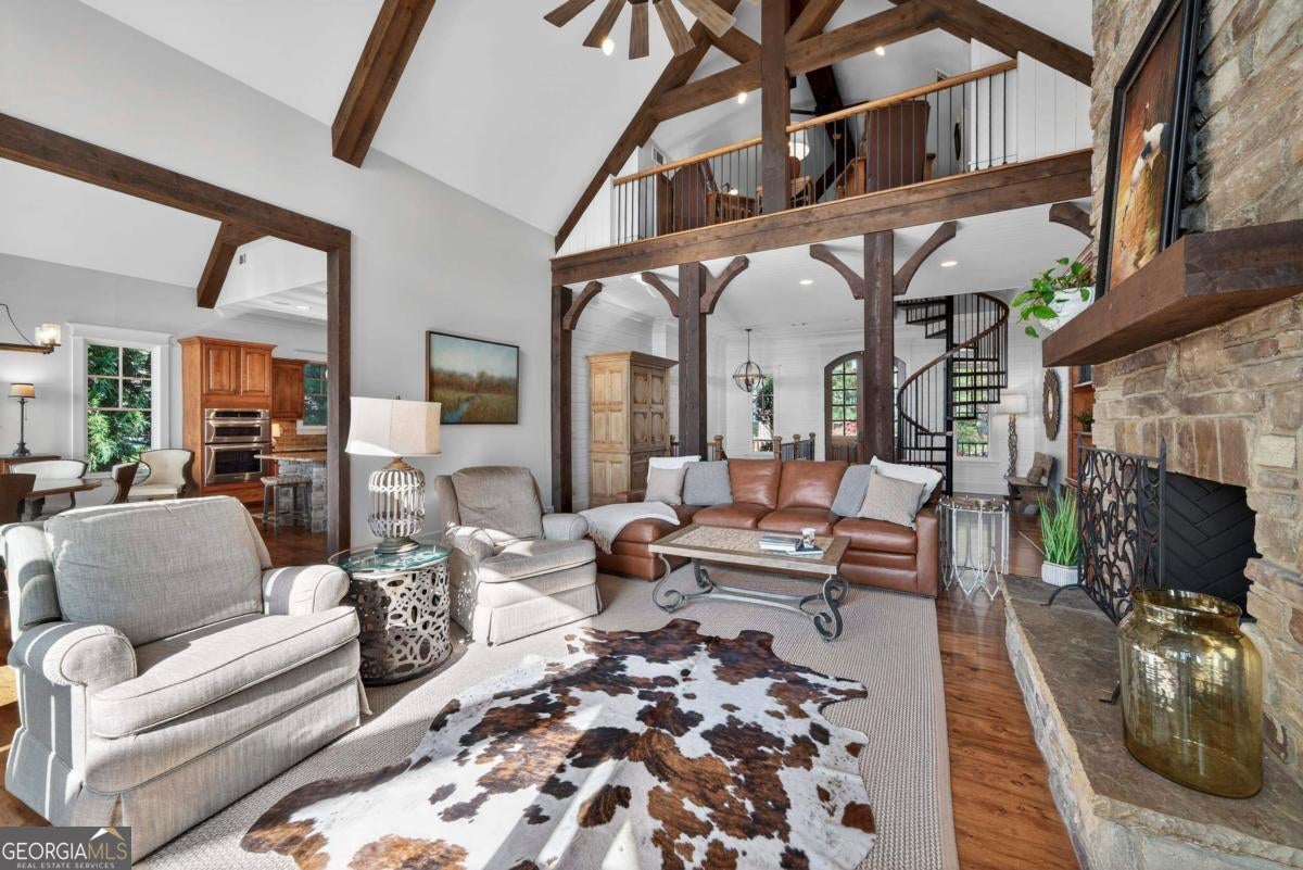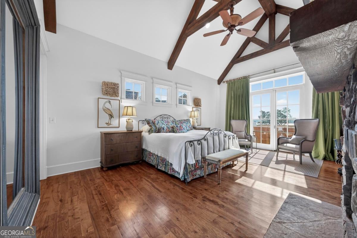Enjoy breathtaking lake views and front-row spectacular holiday fireworks from this stunning Craftsman-style retreat in the private golf course community of Cuscowilla on Lake Oconee. This beautifully designed 4 bedroom, and 3.5 bath (main home) perfectly captures the essence of refined lake living. At the heart of the home is a chef's kitchen featuring large island, spacious dining area, and a dramatic vaulted family room w/soaring floor to ceiling stone fireplace and a charming loft above. The main living area flows seamlessly into a sun-drenched sunroom with all new windows, offering tranquil lake views. The spacious primary suite on the main level is a peaceful sanctuary, with its own fireplace an private porch-an idyllic setting for morning coffee or sunset lake views. Terrace level is designed for entertaining, featuring a generous great room w/fireplace and bar along with 3 additional bedrooms. The terrace level includes an infinity pool, hot tub and outdoor kitchen. The property includes an assigned boat slip is just steps from the yard. The over the garage guest quarters with bath is ideal for sleeping 6 to 8 extra people. Great for entertaining. Professionally landscaped grounds . Assigned Slip. Tritoon, golf cart and furnishings are negotiable. Golf membership is available.