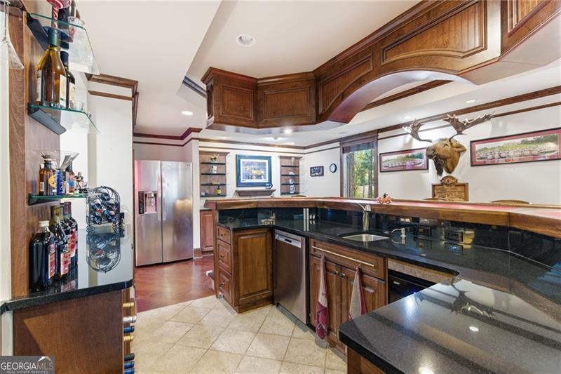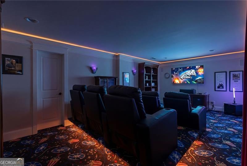 You feel it the moment you walk in-warm, inviting, and effortlessly elegant-this private 2-acre estate in gated Blackberry Ridge redefines what luxury living should feel like. Warmth and timeless design define this exceptional 4-sided brick estate on 2 private acres in gated Blackberry Ridge. Located in Cherokee County (lower taxes) and zoned for Creekview High School, this home offers luxury, privacy, and convenience just minutes from Milton, Crabapple, and Downtown Alpharetta. Inside, you'll find substantial custom millwork throughout-rich, architectural trim that sets this home apart-paired with mahogany hardwood floors, soaring ceilings, and 5 interior fireplaces. The main level features an oversized primary suite with sitting room, stacked stone fireplace, and custom built-ins, plus an additional bedroom and full bath-ideal for multigenerational living or a home office. The gourmet kitchen with granite countertops, gas range, walk-in pantry, and butler's pantry opens to the fireside keeping room-the true heartbeat of the home. Upstairs offers multiple ensuite bedrooms and flexible living space. The terrace level is a true extension of the home-finished to the same high standard as the main level and designed for entertaining. Highlights include a one-of-a-kind hand-built custom bar, an elevated theater room with ambient lighting entry, game areas, and multiple exterior access points. With abundant windows and doors, the space feels bright, open, and connected-not like a basement. Additional features include: 3 laundry rooms (one on each level),Oversized 3-car side-entry garage, level, private backyard-ideal for a future pool, Expansive 2-acre setting with exceptional privacy. A rare opportunity to own a private, move-in ready luxury estate in one of the area's most desirable gated communities.
