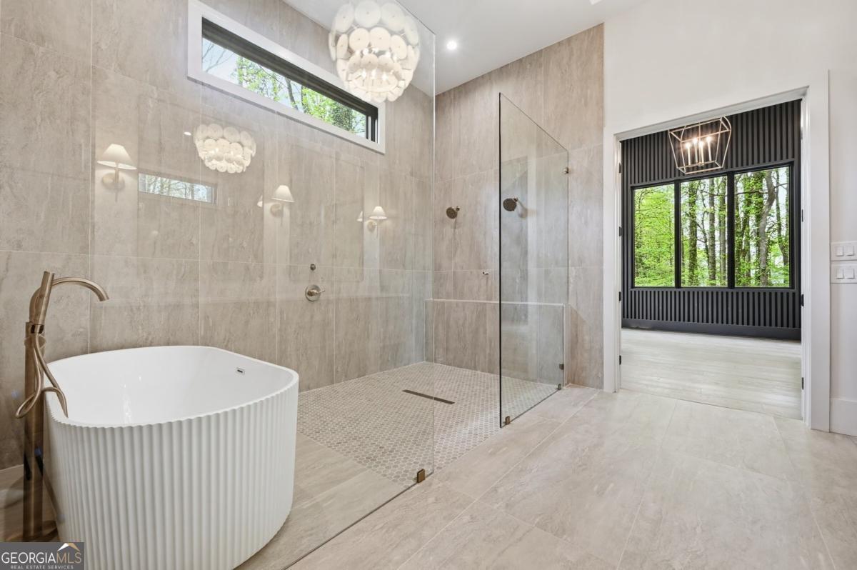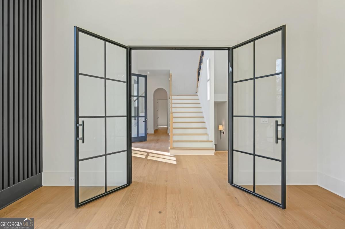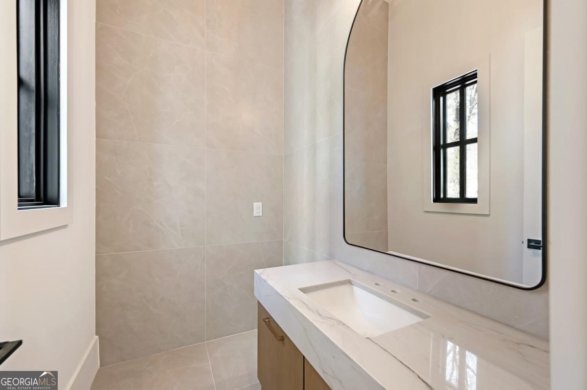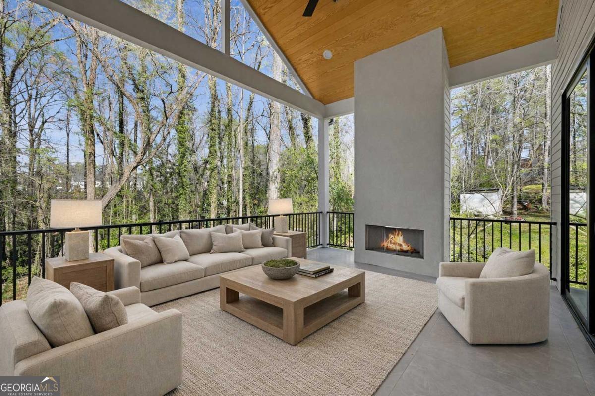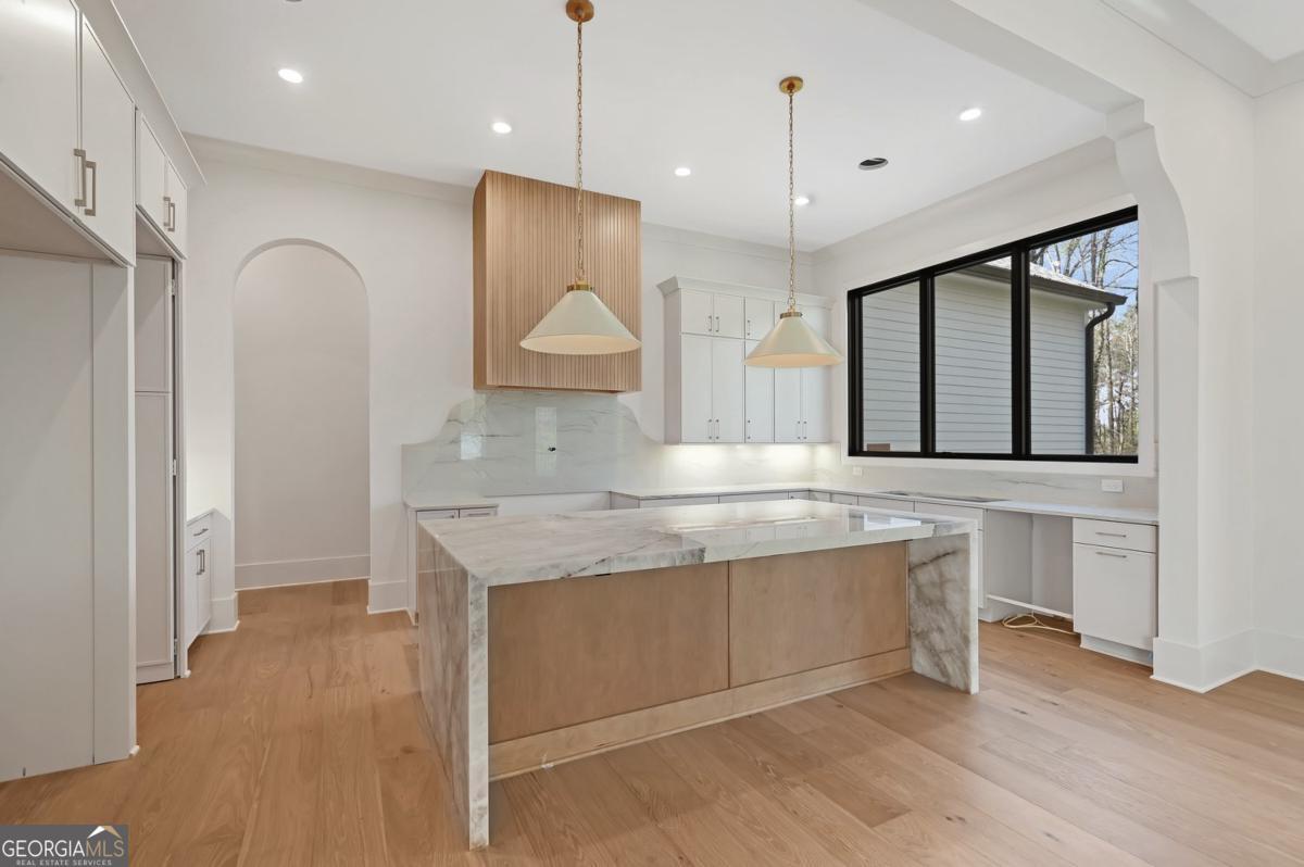 ** READY NOW ** ANOTHER EXCEPTIONAL NEW CONSTRUCTION HOME BY MODERNIZE PROPERTIES - WALKABLE TO DOWNTOWN ALPHARETTA. Experience refined luxury and effortless living in this stunning new home on a full unfinished basement, perfectly situated on a private, pool-ready lot just steps from the shops and restaurants of downtown Alpharetta. Soaring 12-foot ceilings define the main level, highlighted by an open, light-filled floor plan and designer finishes throughout. The chef's kitchen features an oversized quartzite waterfall island, hidden walk-in pantry, and abundant custom cabinetry. A dramatic vaulted primary suite on the main level offers serenity and style, complemented by a luxurious spa bath. A private guest suite with en-suite bath and a private home office with glass and steel double doors complete the main floor. Expansive sliding doors open from the family room to a covered outdoor living space with fireplace - ideal for year-round entertaining. Upstairs offers a spacious loft, three additional bedrooms each with private baths, and a full laundry room. Additional features include a 3-car garage with 9' tinted glass doors, full paver driveway, spray foam insulation, tankless water heater, and a full daylight basement ready to finish.