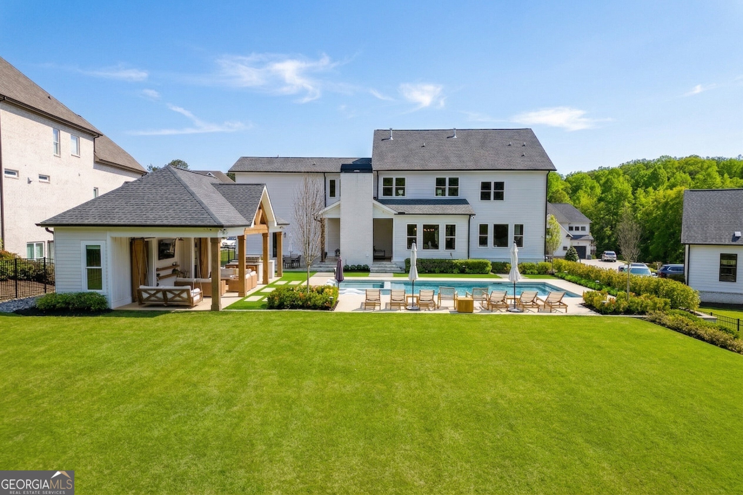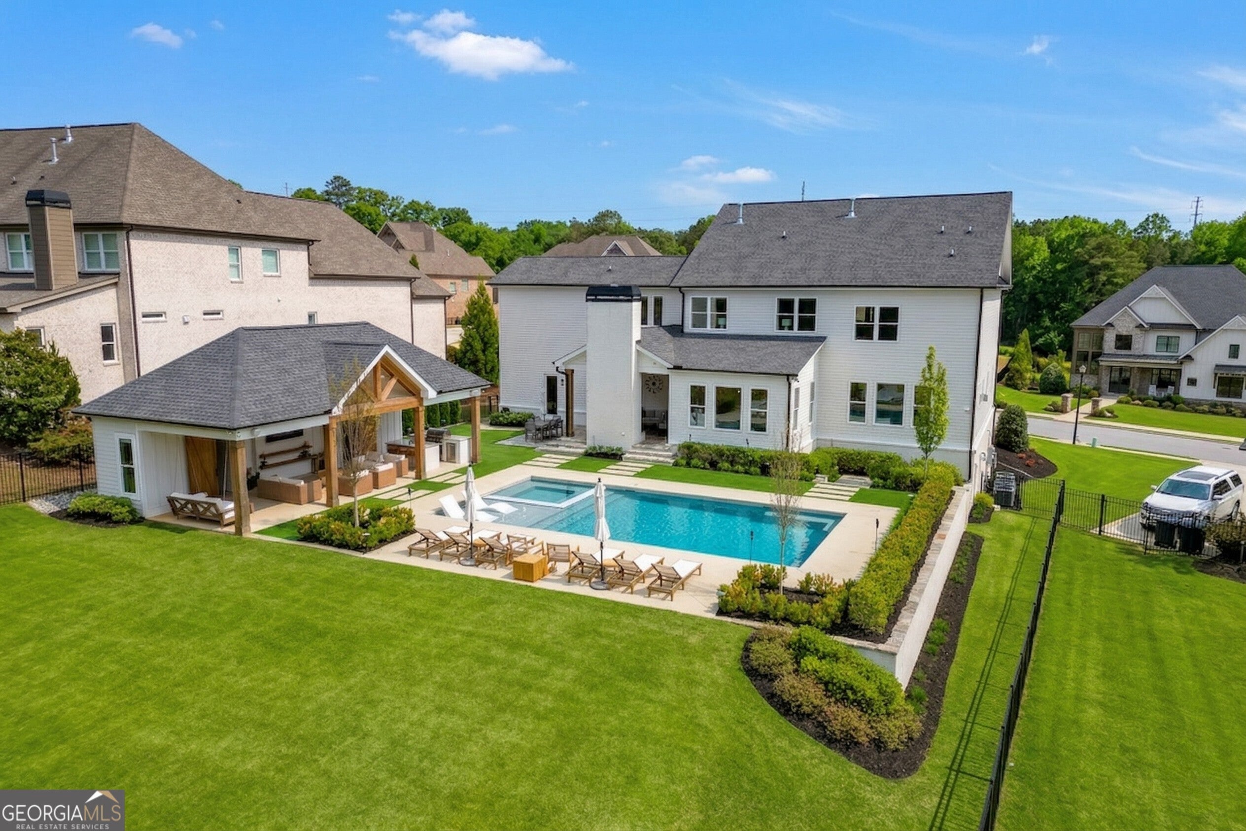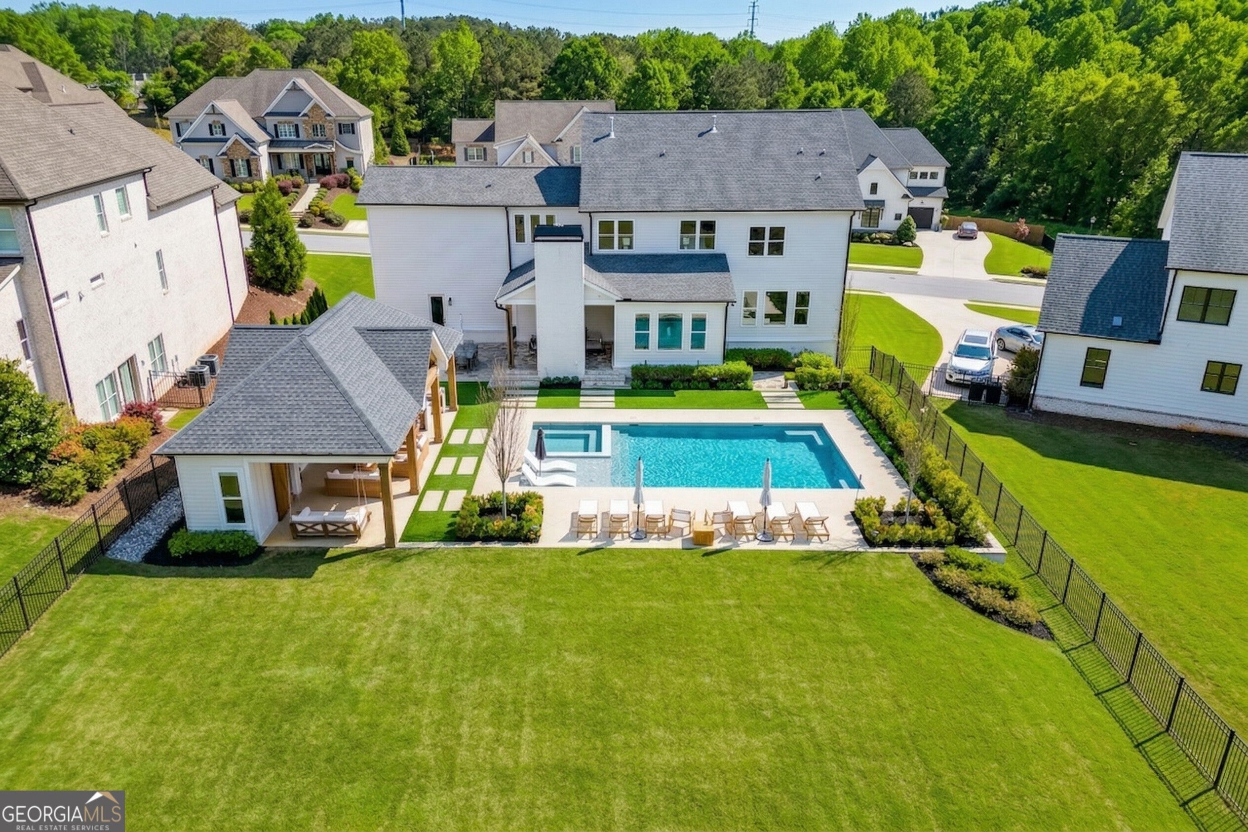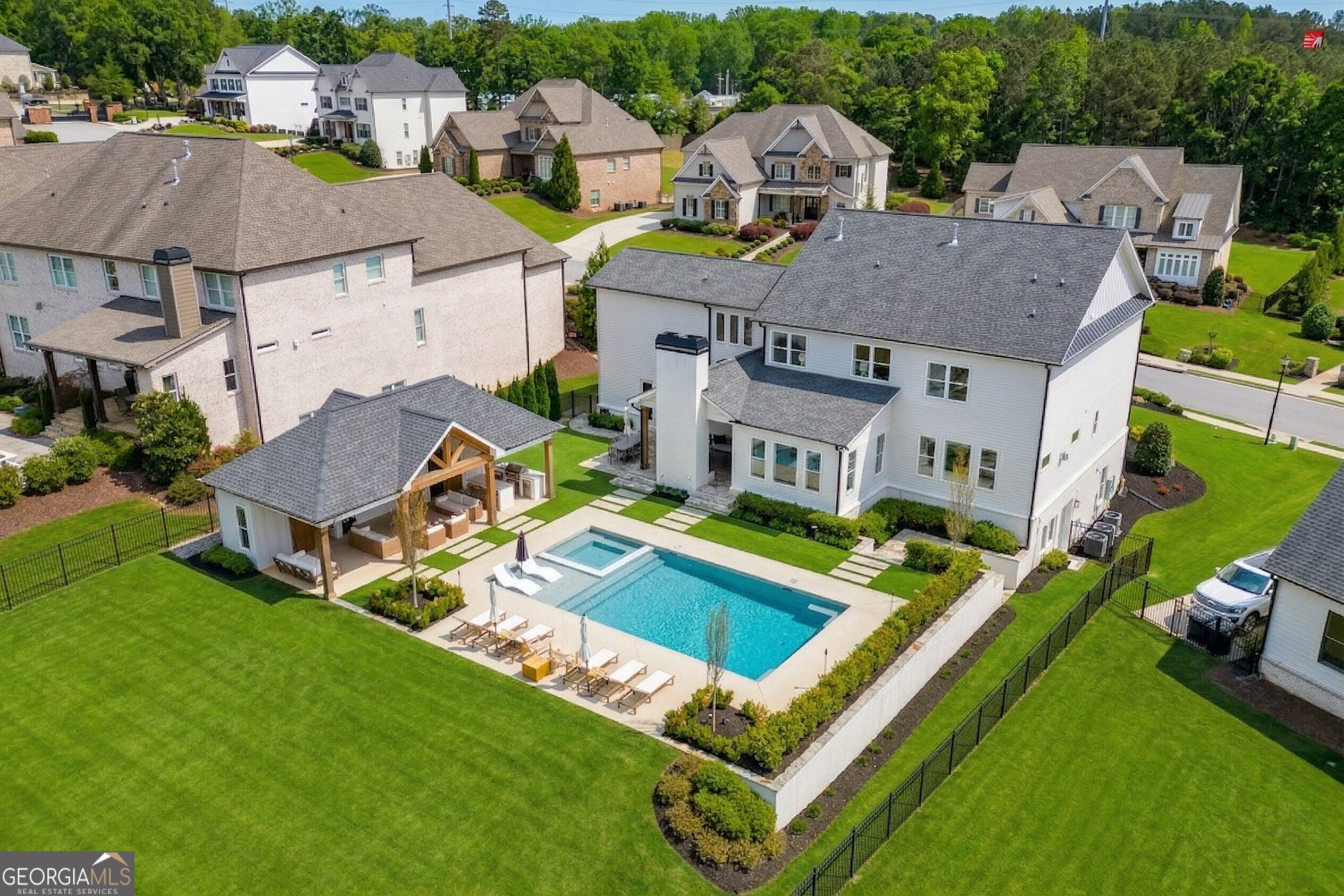 Incredible describes this opportunity on a nearly new custom-built home with a finished basement, gunite pool, hot tub, huge pool pavilion with bathroom and grilling station on one of the best private level lots in the City of Buford, tucked away in a beautiful, gated community! This open concept floor plan offers a large kitchen with loads of custom-built cabinetry, oversized island, quartz countertops, double ovens, gas cook-top, drawer-level microwave, and a huge walk-in pantry with wood shelving. Stained coffered ceiling beams extend from the kitchen to the family room. The large breakfast room is loaded with windows for maximum daylight. Family room with granite surround fireplace and built-in cabinet bases with transom windows above. Spacious office off the foyer with plenty of natural daylight, shiplap accent wall, and corner barn doors. Guest suite on the main floor with a walk-in closet and a private bath with a walk-in shower. Powder room tucked off the rear hallway for guest privacy. Drop zone area with bench seating and cubbies, along with a separate "friends entry door" off the rear hallway. Hardwood floors throughout the main level, except the main level guest suite. Split stairway with horizontal metal pickets leads upstairs where the landing features a loft/flex space with hardwoods. Oversized master suite with tray ceiling. Luxurious master bath features a large walk-in shower with dual showerheads, separate soaking tub, his and hers vanities, and an enormous walk-in closet with built-in hanging and adjustable shelving plus dressing island. Three additional spacious secondary bedrooms, all with walk-ins & private baths. The upstairs laundry room has a sink basin and wall cabinets. Professionally finished terrace level with a complete in-law suite featuring a kitchen with custom cabinets, floating shelves with accent lighting, a large island and quartz c-tops. Family/media room with surround sound and pre-wired for a projector. Stained ceiling beams extend from the kitchen to the family room. Custom gym with built-ins and wall mirrors. Separate office with French doors and built-ins. Guest bedroom with full bath featuring a stand-up shower. An additional powder room that has a cabinet paneled washer/dryer niche to keep out of sight. Hardwood floors throughout. There is also a playroom area under the stairs. The outdoor entertainment area is an incredible space that includes a rear covered porch with a fireplace and flagstone floor covering, an additional open flagstone patio area for larger gatherings, heated saltwater pool with hot tub and tanning ledge surrounded by an artificial turf perimeter. The large pool pavilion has a vaulted media area, a built-in grilling station with stainless steel accessories and sink, a powder room bath, and a large storage room for pool items. Additionally, you have a huge level rear yard that is so hard to find, plus extensive landscaping. Numerous additional details featuring 10' ceilings on the main level with 8' doors, four-sided brick, 3-car garage with oversized driveway, fully automated blinds, leak-detection and camera systems, tankless water heater, water-filtration system, built-in speakers, irrigation, landscape lighting, and so much more. This home has been incredibly maintained with no expense spared so don't miss it!