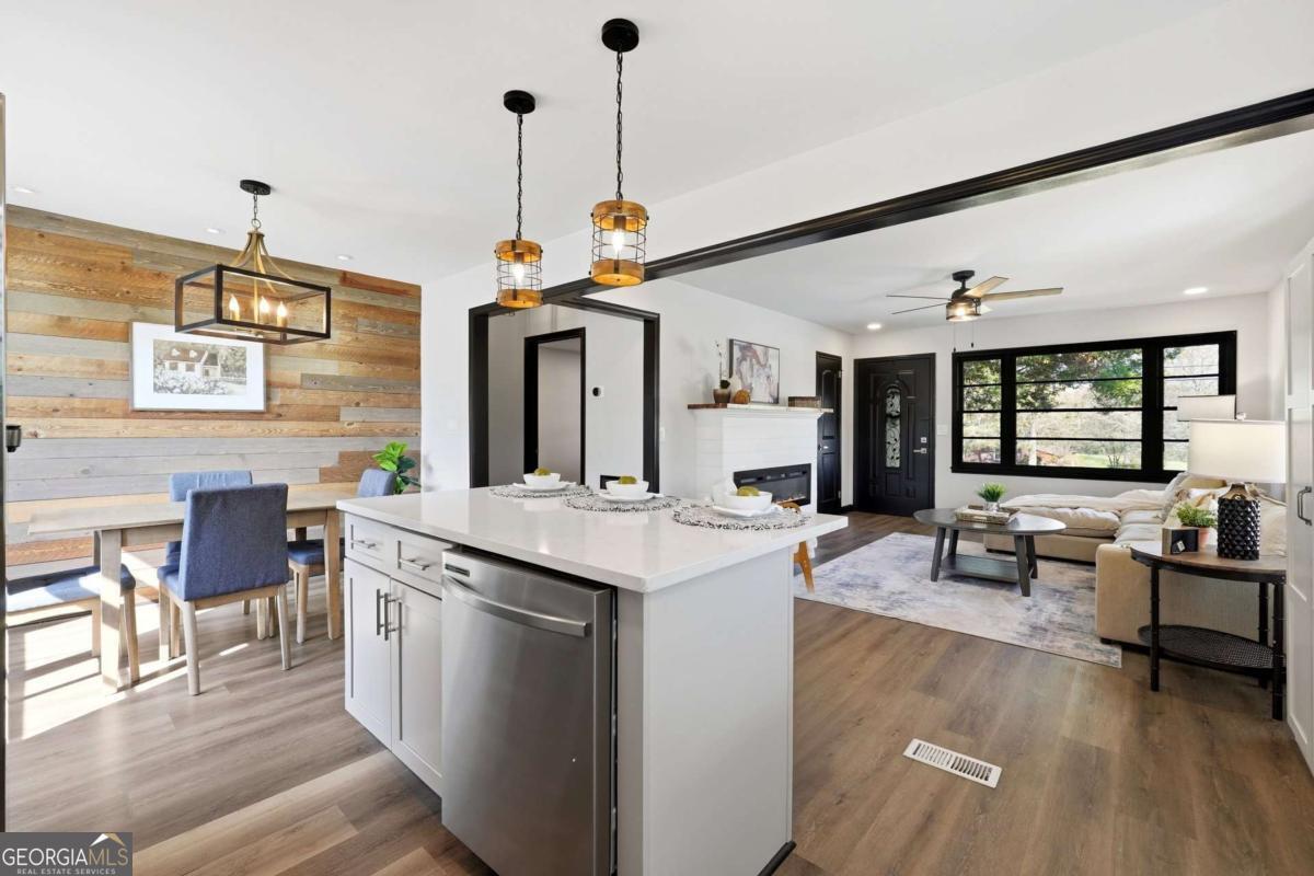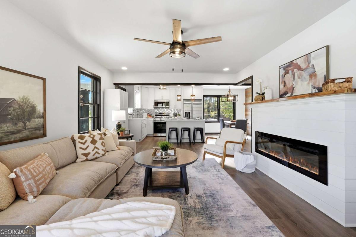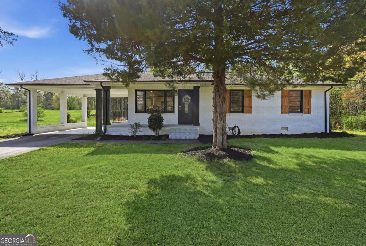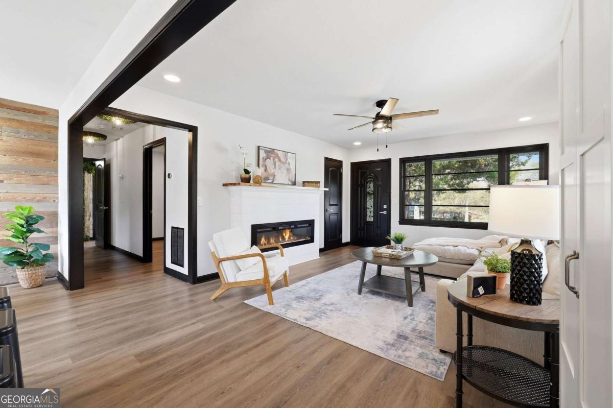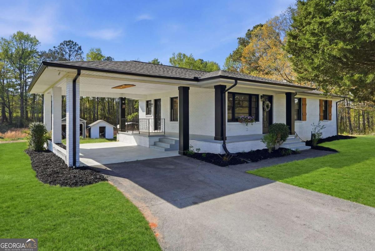 A rare find in Gainesville-completely reimagined and truly one-of-a-kind. This beautifully renovated RANCH is perfectly positioned to capture the morning sun with its desirable eastern exposure. The exterior makes a striking statement with crisp white brick, sharp black trim, and an expansive wrap-around porch. Inside, the open-concept main level features a sleek fireplace, warm wood-plank accent walls, and a designer kitchen with a large central island and stainless steel appliances. The primary suite offers a spa-inspired ensuite with a frameless glass shower and a standalone soaking tub. The newly finished basement includes a full bath and direct access to the backyard, providing the perfect setup for a guest suite, home office, or media room. Situated on hard-to-find acreage with endless possibilities, this turn-key property offers modern style and rare privacy in a peaceful setting.