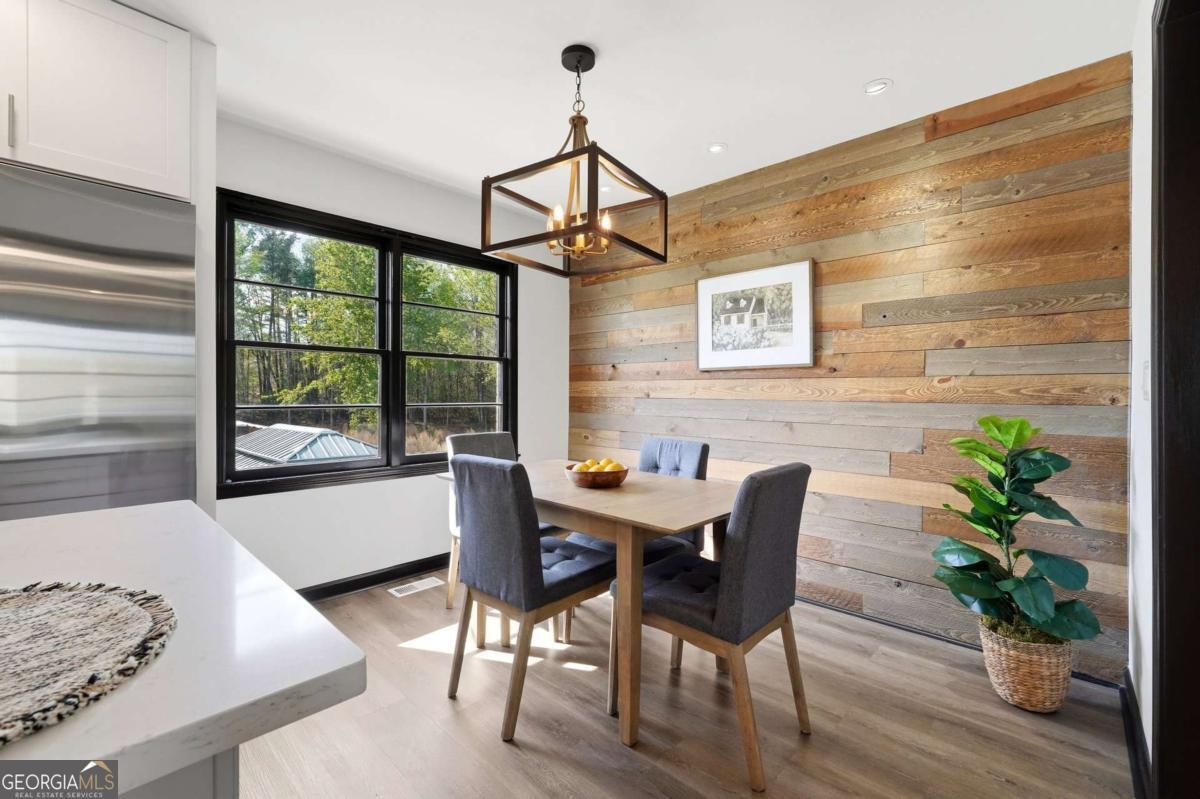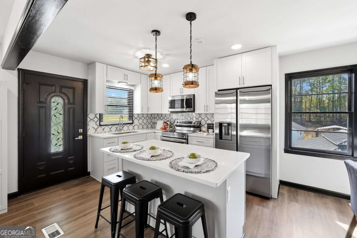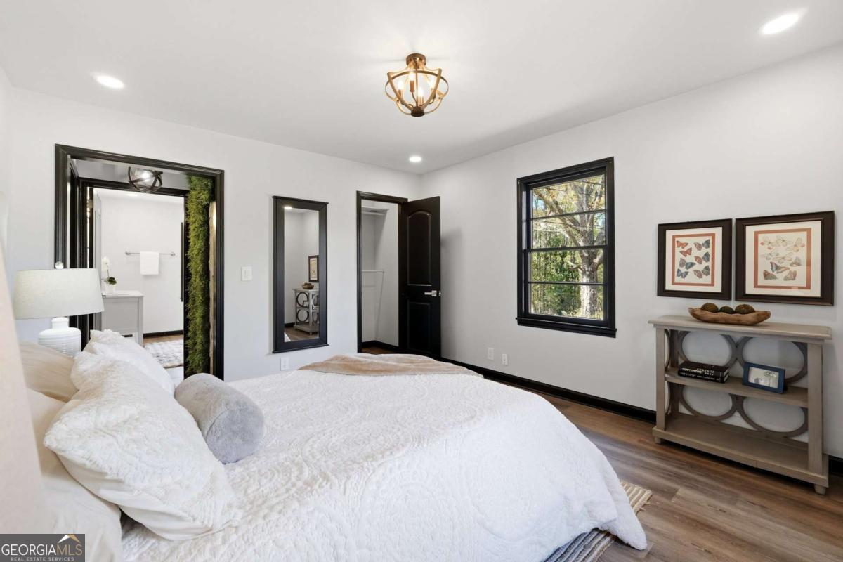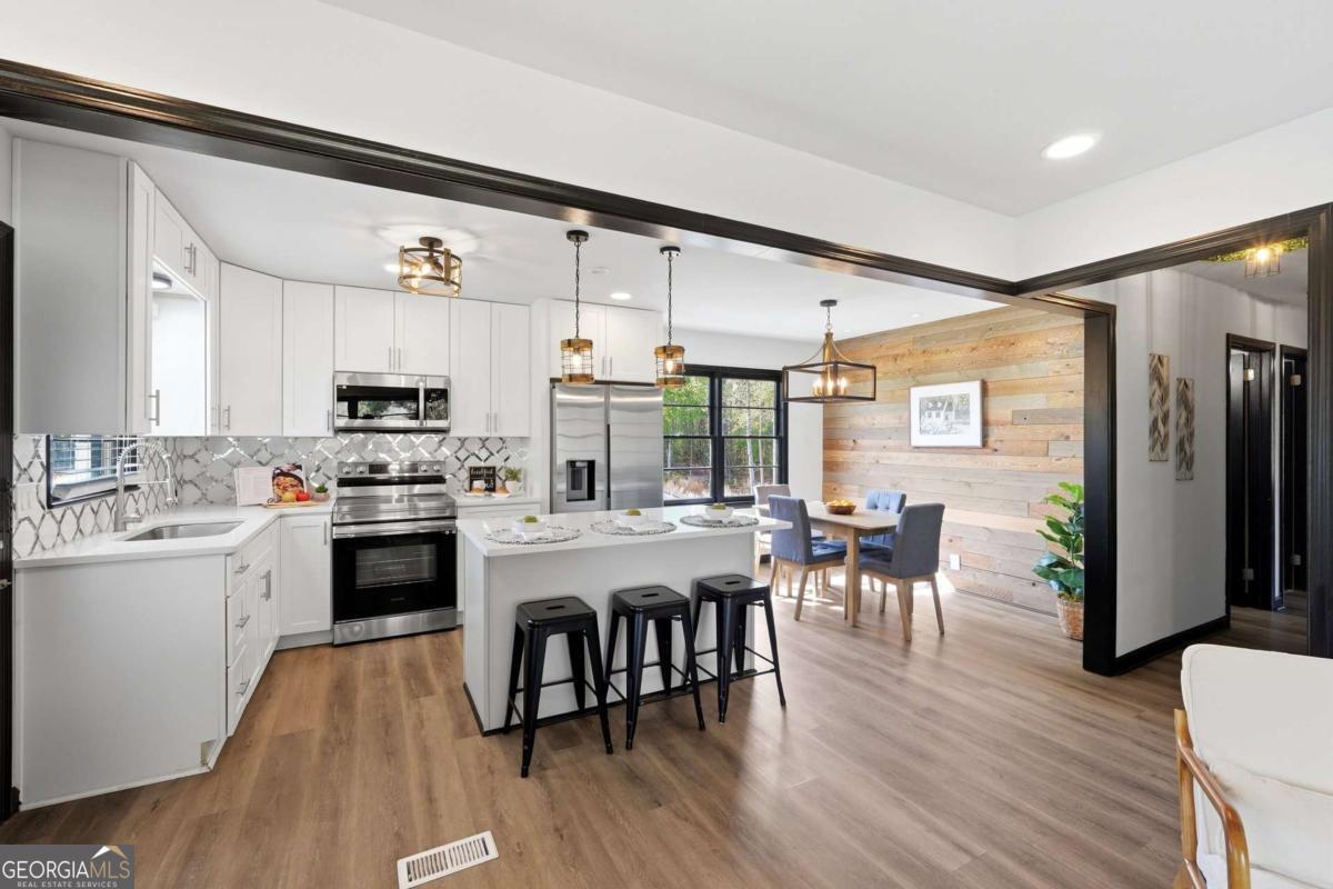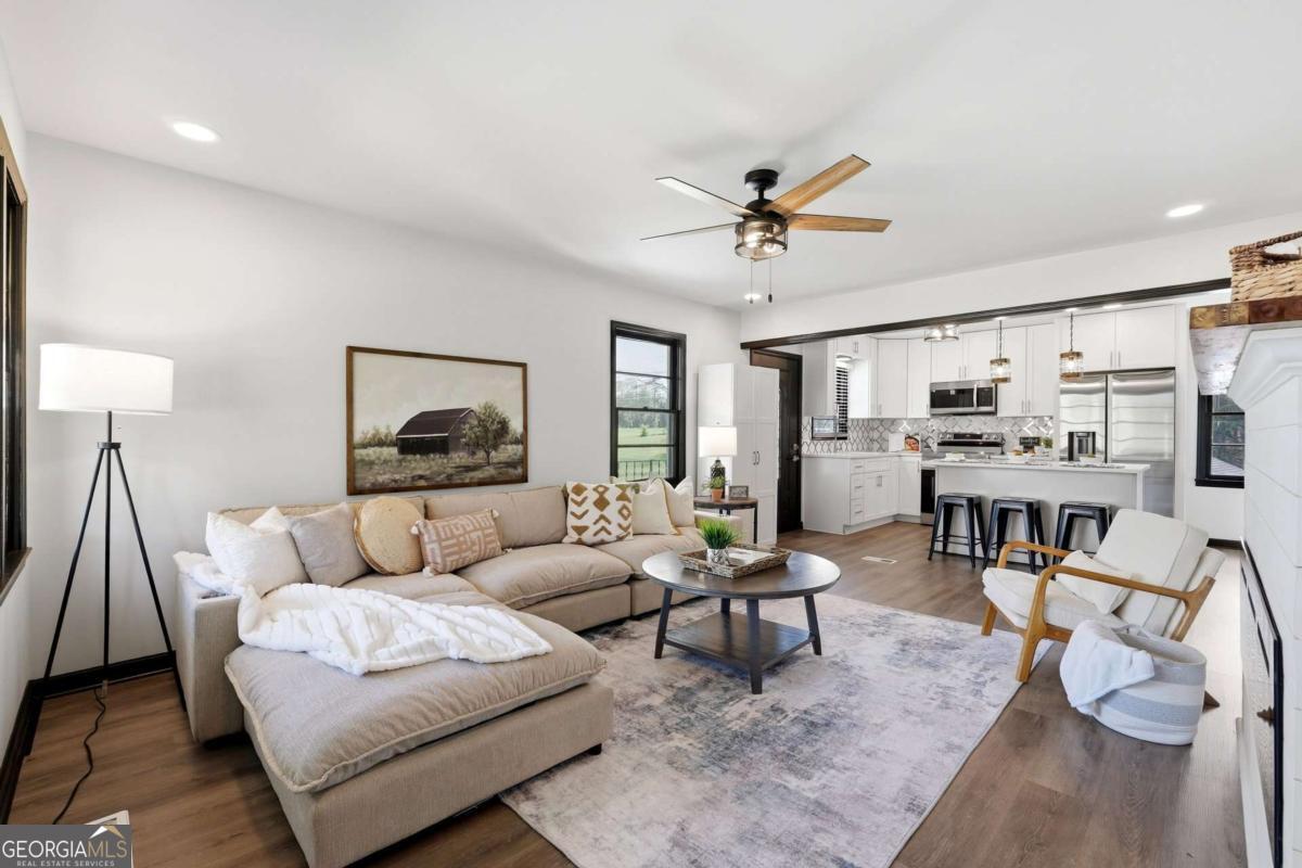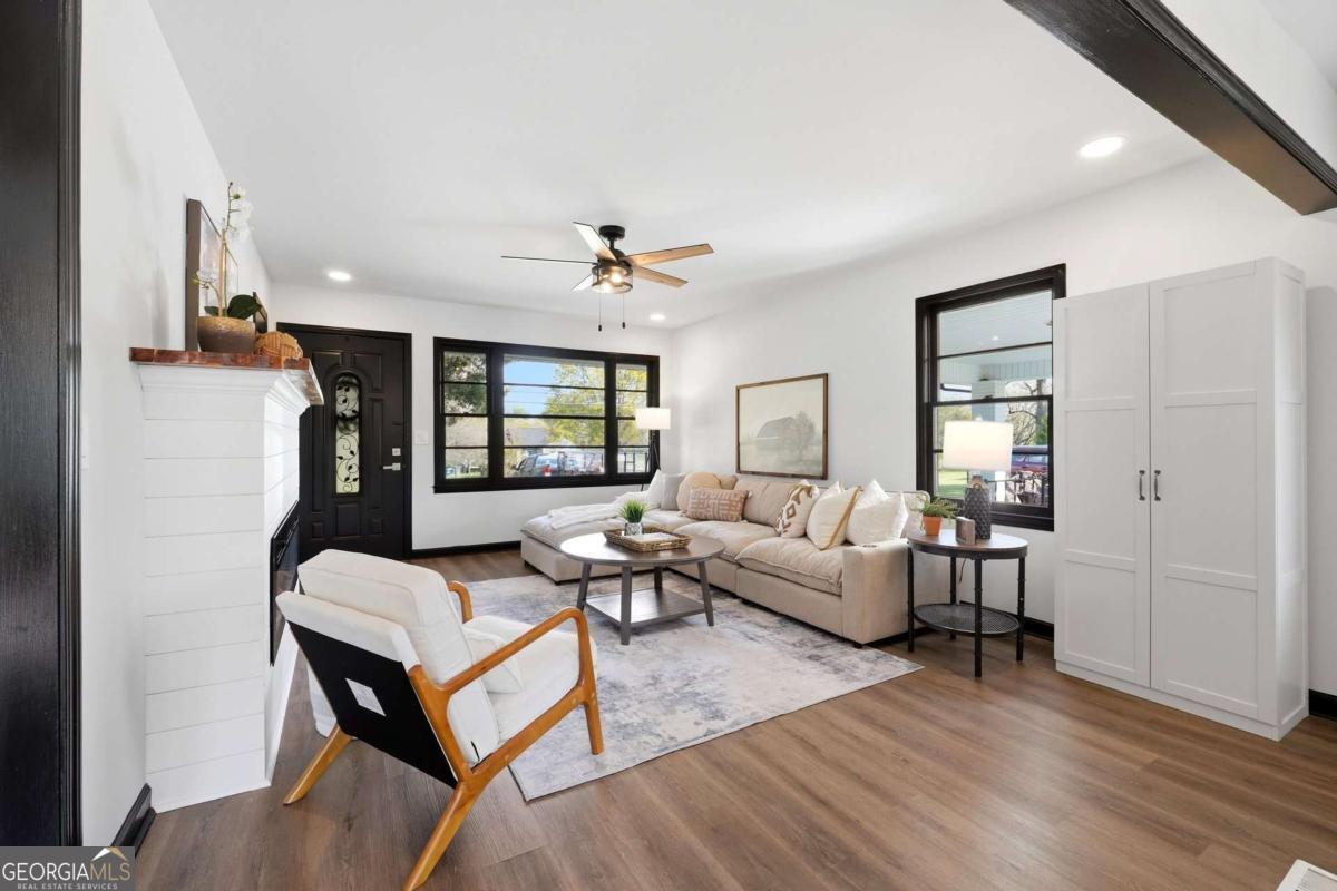 A rare find in Gainesville-completely reimagined and truly one-of-a-kind. This beautifully renovated RANCH is perfectly positioned to capture the morning sun with its desirable eastern exposure. The exterior makes a striking statement with crisp white brick, sharp black trim, and an expansive wrap-around porch. Inside, the open-concept main level features a sleek fireplace, warm wood-plank accent walls, and a designer kitchen with a large central island and stainless steel appliances. The primary suite offers a spa-inspired ensuite with a frameless glass shower and a standalone soaking tub. The newly finished basement includes a full bath and direct access to the backyard, providing the perfect setup for a guest suite, home office, or media room. Situated on hard-to-find acreage with endless possibilities, this turn-key property offers modern style and rare privacy in a peaceful setting.