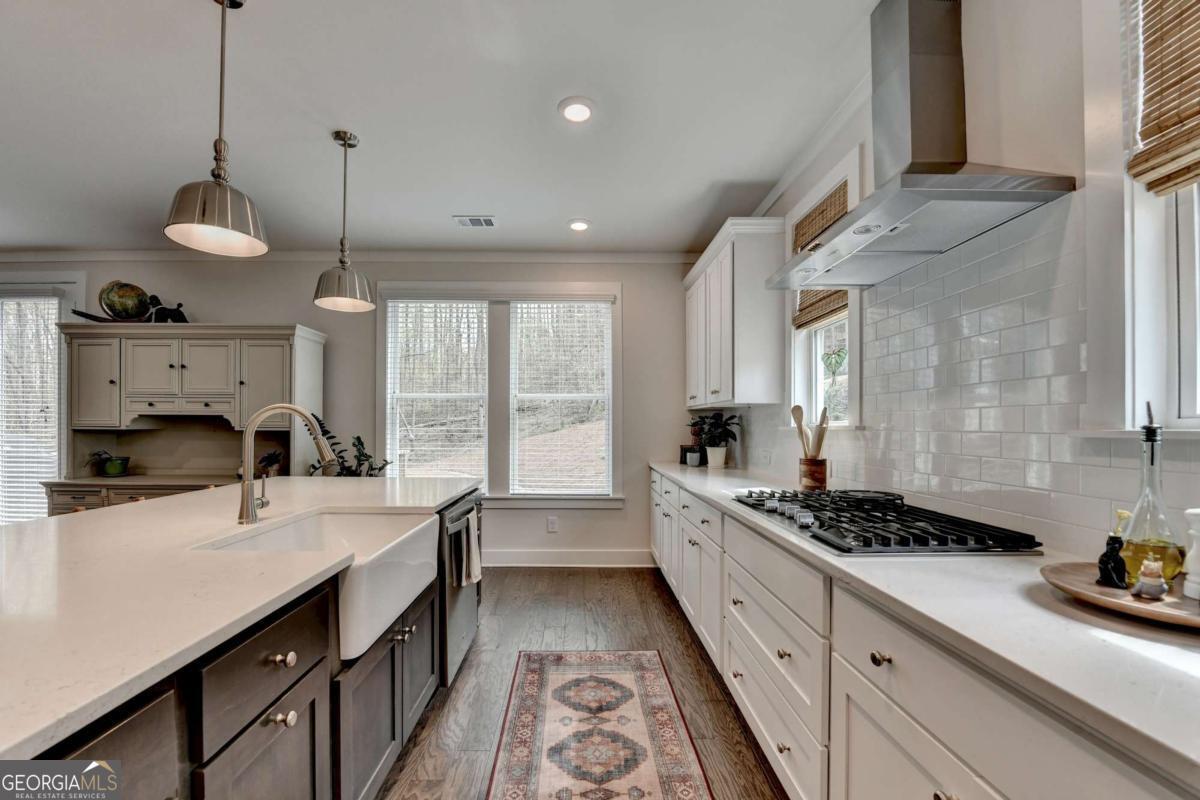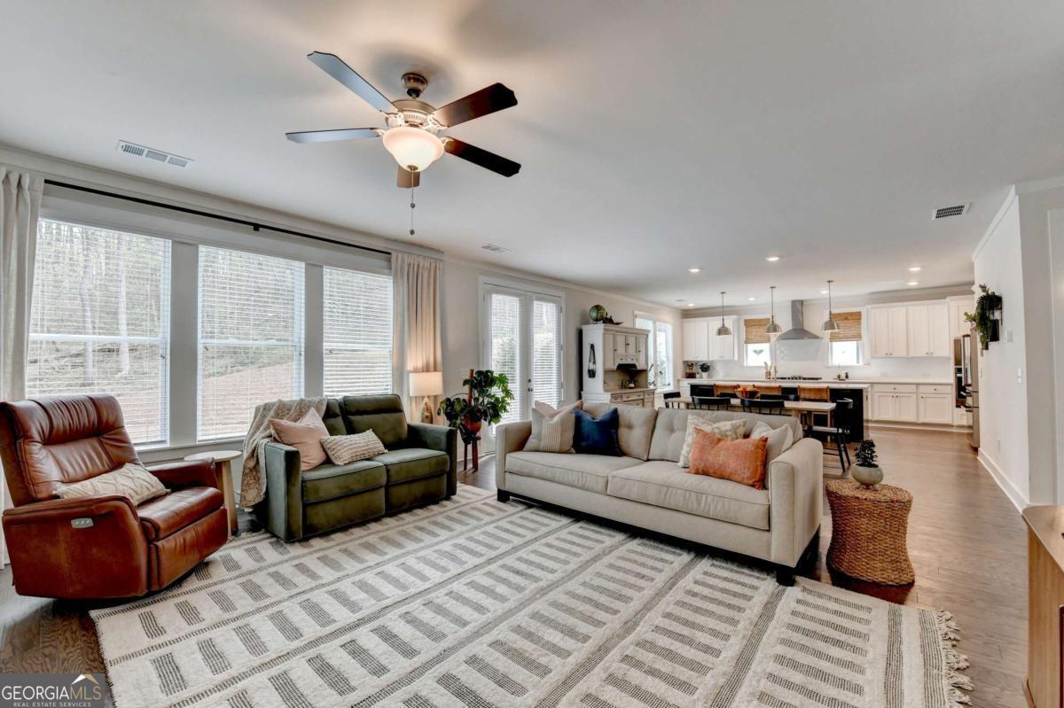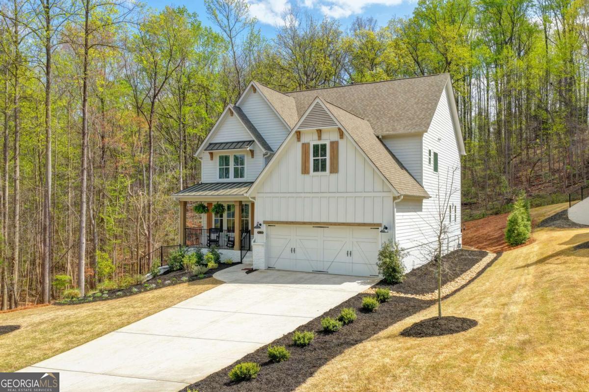 Welcome to Long Hollow Landing at Lake Lanier! Beautiful 2 1/2 year old farmhouse style home built by David Patterson Homes is situated on a 2+ acre cul-de-sac lot; Relax on the covered front porch overlooking a wooded area; A light filled foyer leads you into this open-concept home with a private home office at the front of the house; The large great room with gas fireplace & wall of windows flows into the eating area and also into a gorgeous chef's kitchen with a huge quartz island/farm sink, stainless appliances including a gas stove top, built-in oven & microwave plus tons of white cabinets; A mudroom with built-in bench is located next to the kitchen & across from a large walk-in pantry; Powder room is private, located off foyer; There is 5-inch plank wood flooring on main floor & wood treads on stairs leading to the upstairs; Enter the 2nd floor to a loft; Owner's suite features a vaullted ceiling, large bathroom with frameless shower, garden tub, double sink vanity and a spacious walk-in closet that offers convenient access to the laundry room; Three additional upstairs bedrooms include one with an ensuite bath while the other two share a Jack & Jill bath, all baths have stone countertops; An unfinished side daylight basement has 10' ceilings & is ready for you to customize to suit your needs/stubbed for a bath; Private backyard has a level area with deck; Bonus of a wooded area to left of home has trails where you can explore nature; Community amenities include an outdoor gathering area with pavillion/gazebo, fireplace, restrooms, access to Lake Lanier, and day use of community swim/sun/fishing platform on each of the two docks; Located in sought after East Forsyth HS district, close to marinas, restaurants, shopping including the North GA Premium Outlet. Seller is relocating due to a new job.