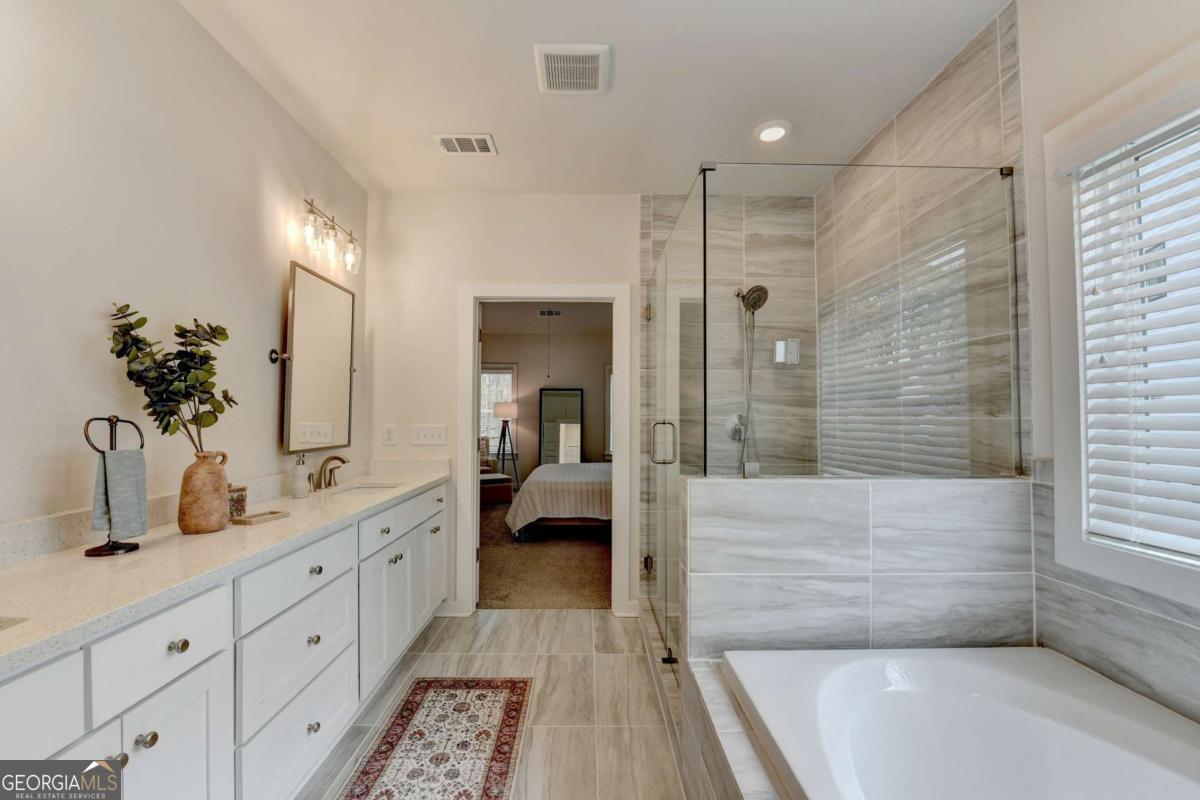 - Interior FeaturesDouble Vanity, High Ceilings, Pulldown Attic Stairs, Separate Shower, Tile Bath, Vaulted Ceiling(s)