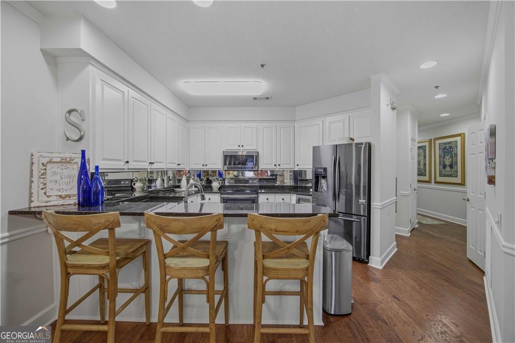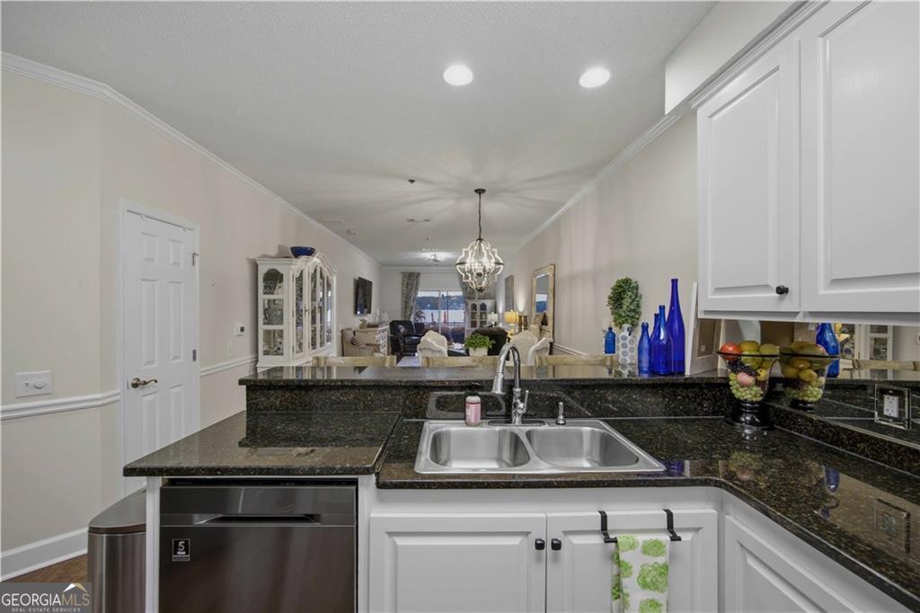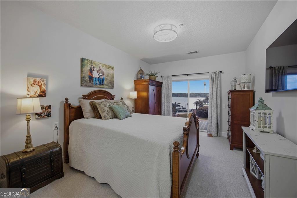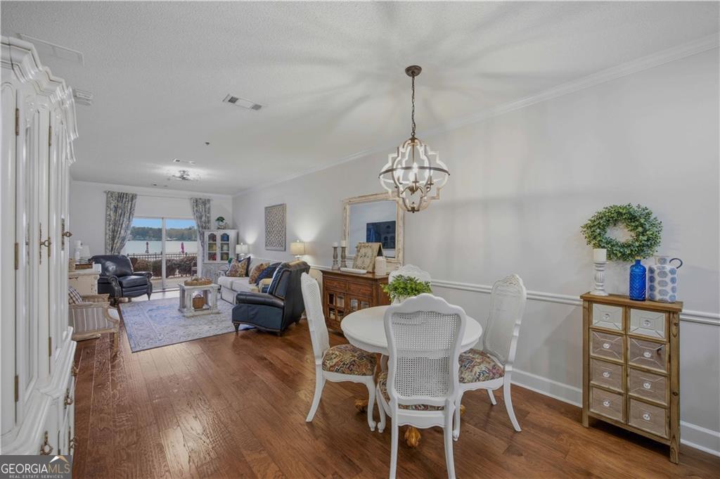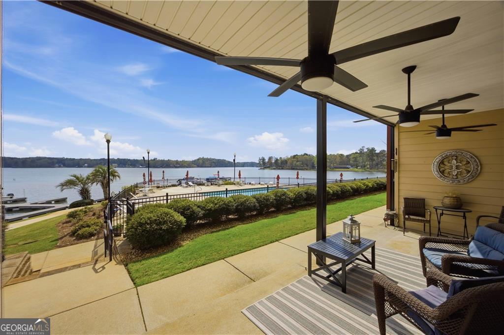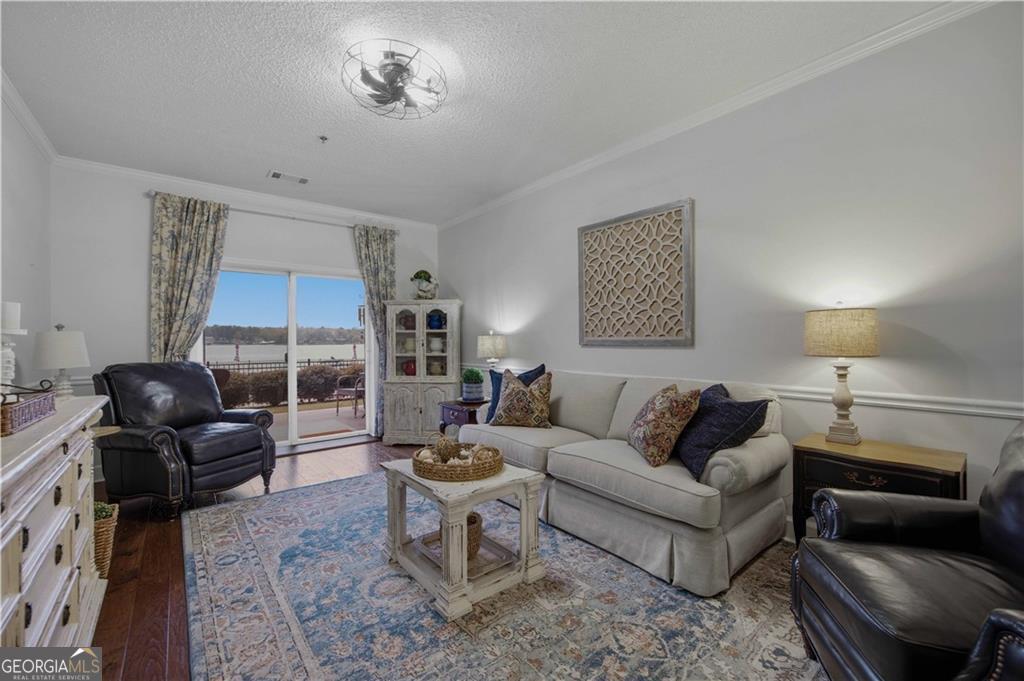 Waterfront ground-floor walk-out condo, beautifully updated and handicap accessible! Features include crown molding, hardwood floors, and an open-concept layout. The kitchen offers granite countertops, white cabinetry, pantry, updated appliances, and a wine fridge. The spacious primary suite overlooks the lake and includes a renovated ensuite bath with custom tile shower, separate soaking tub, and walk-in closet. Additional guest bedroom, full guest bath, and laundry room. Enjoy a covered patio that walks out to the waterfront and pool area, complete with retractable sunshades. Community amenities include pool, tennis courts, boat storage, boat ramp, fire pit and a designated boat slip.