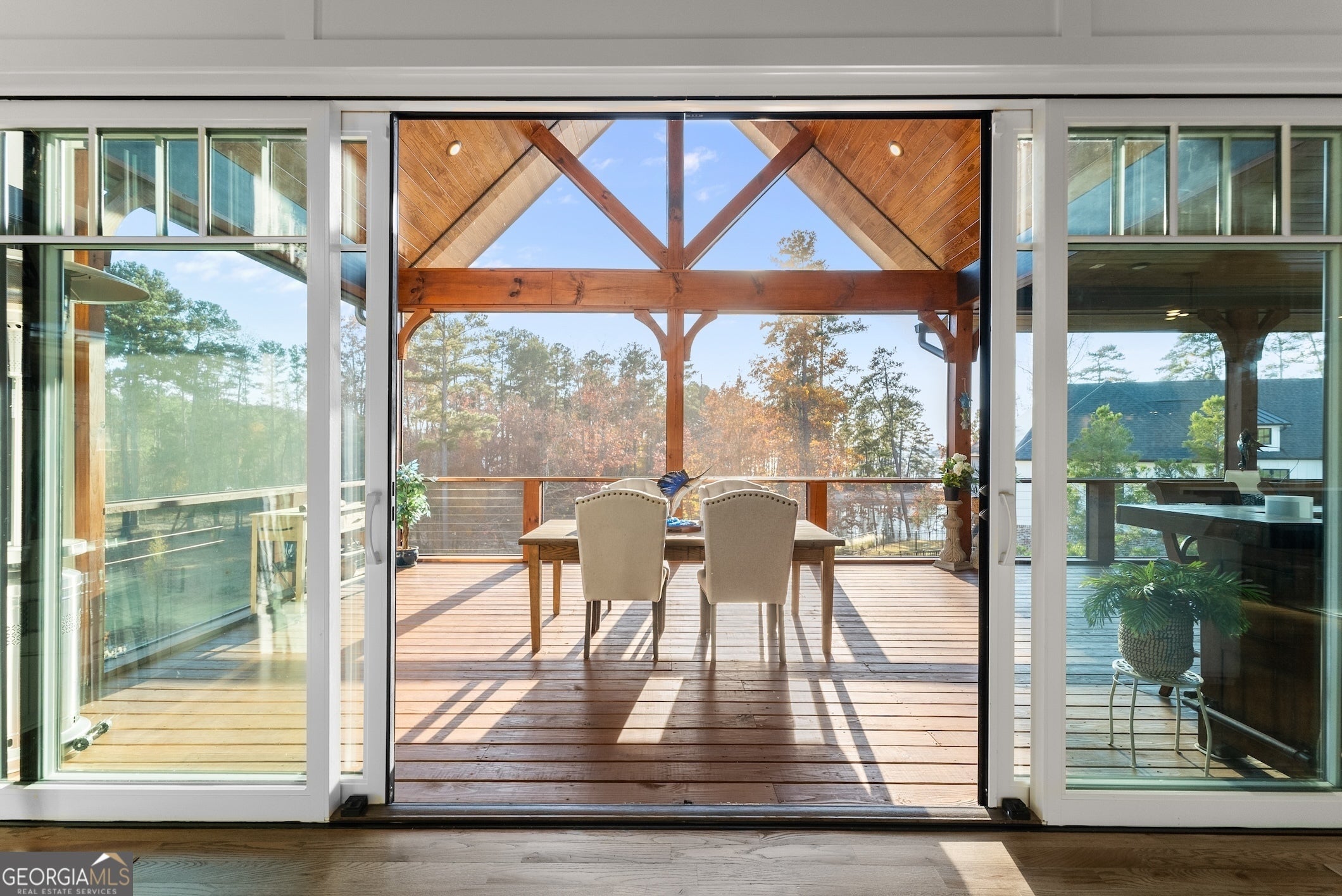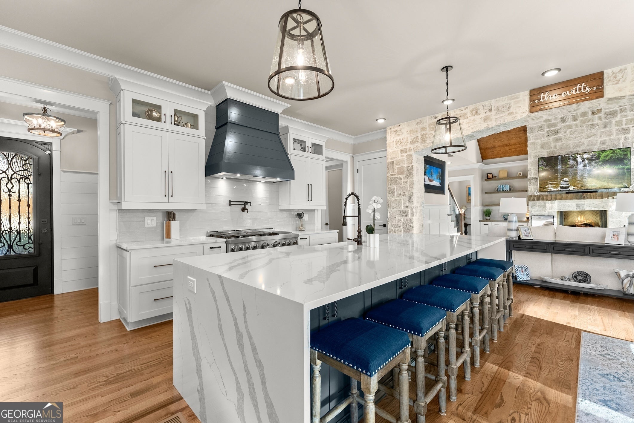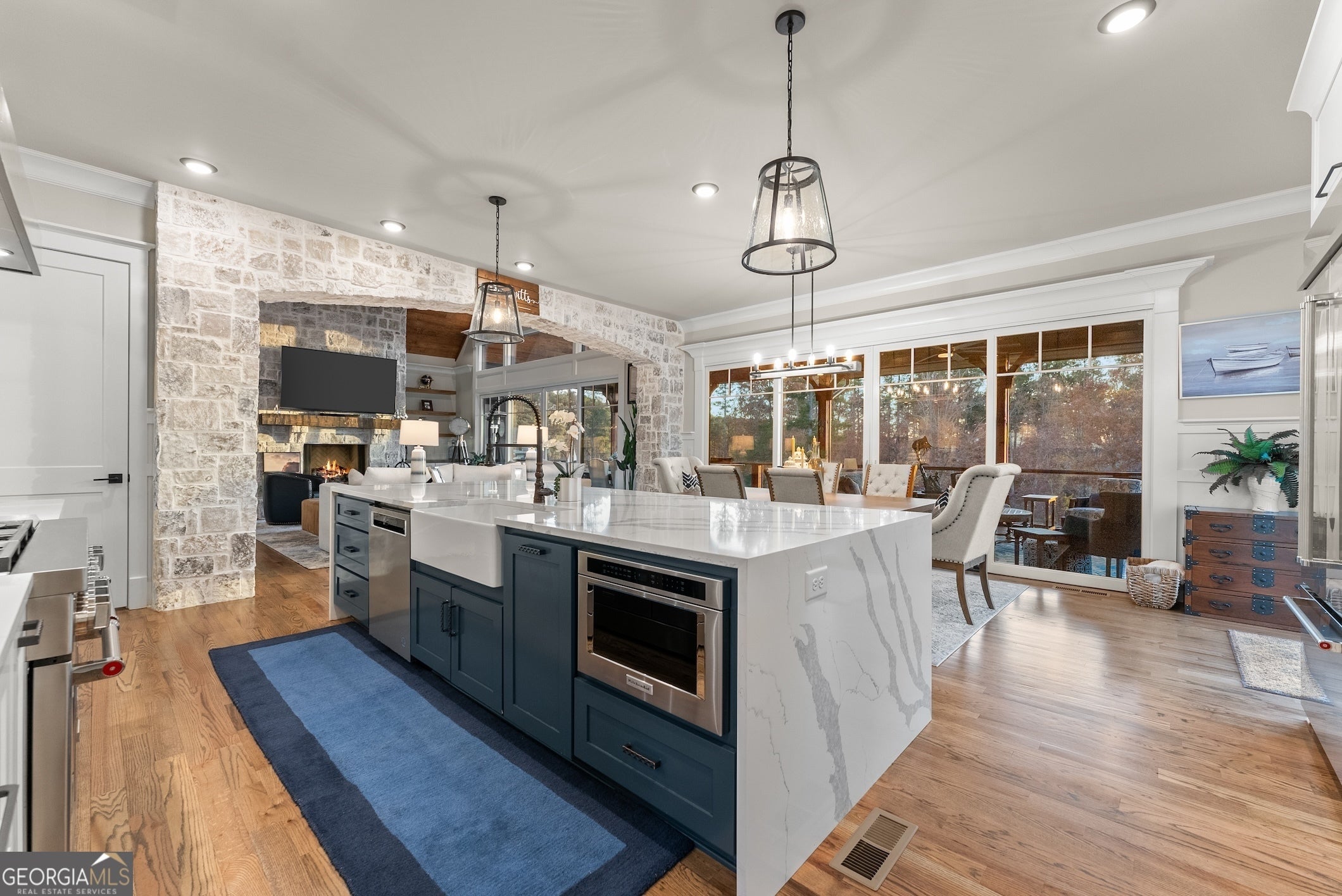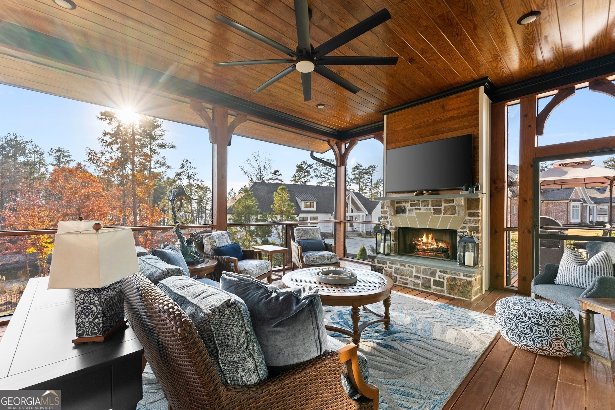 Experience Lake Lanier living at its best - luxury home at water's edge, sunset skies, effortless lake days, and the vibrant South Lake lifestyle right at your doorstep. With your private dedicated boat slip, you're moments from marinas, waterfront dining, and live music nights that make this side of the lake so loved. This home blends elevated design with relaxed lake-life living, creating a true waterfront retreat. Inside, the great room with lake views welcomes you with soaring wood-beam ceiling, floor-to-ceiling stone fireplace, and warm, inviting atmosphere that flows naturally into the chef's kitchen featuring a waterfall quartz island, premium appliances, and a walk-in pantry. Two sets of sliding glass doors open the main level to a full-length screened-in porch and expansive back deck, giving you true four-season living - morning coffee as the lake wakes up, afternoons of grilling and laughter, and evenings spent unwinding under the glowing golden hour sunset skies. This outdoor living space becomes the heart of the home, where gatherings of all sizes feel effortless and unforgettable. The main level primary suite offers a peaceful retreat with a vaulted wood ceiling, calming Lake views, and a spa - inspired bath, with heated floors, soaking tub, oversized frameless shower, and dual closets. A powder room and spacious laundry room complete the main level. Upstairs, and en-suite bathroom/bedroom, two additional spacious bedrooms with shared bath, and a large bonus room provide comfort and flexibility for guests of all ages. The bonus room is ideal for a movie lounge, playroom, or home office - whatever fits your lifestyle. The terrace level is designed for fun and relaxation, featuring tall ceilings, a full wet bar, game area, generous living space, and an oversized flex room with its own bath perfect for additional bedroom, gym or hobby space. It's the ideal backdrop for movie nights, game days, and weekend hangouts. Outside the large level fenced in backyard becomes your lakeside playground - room for fun and games, space to entertain, and easy gate access to the water's edge shoreline for kayaking, fishing, paddle boarding, or simply enjoying quiet moments by the water. With a new price, this home delivers incredible value for a true South Lake waterfront retreat - elevated, inviting, and designed for the way people love to live on Lake Lanier!