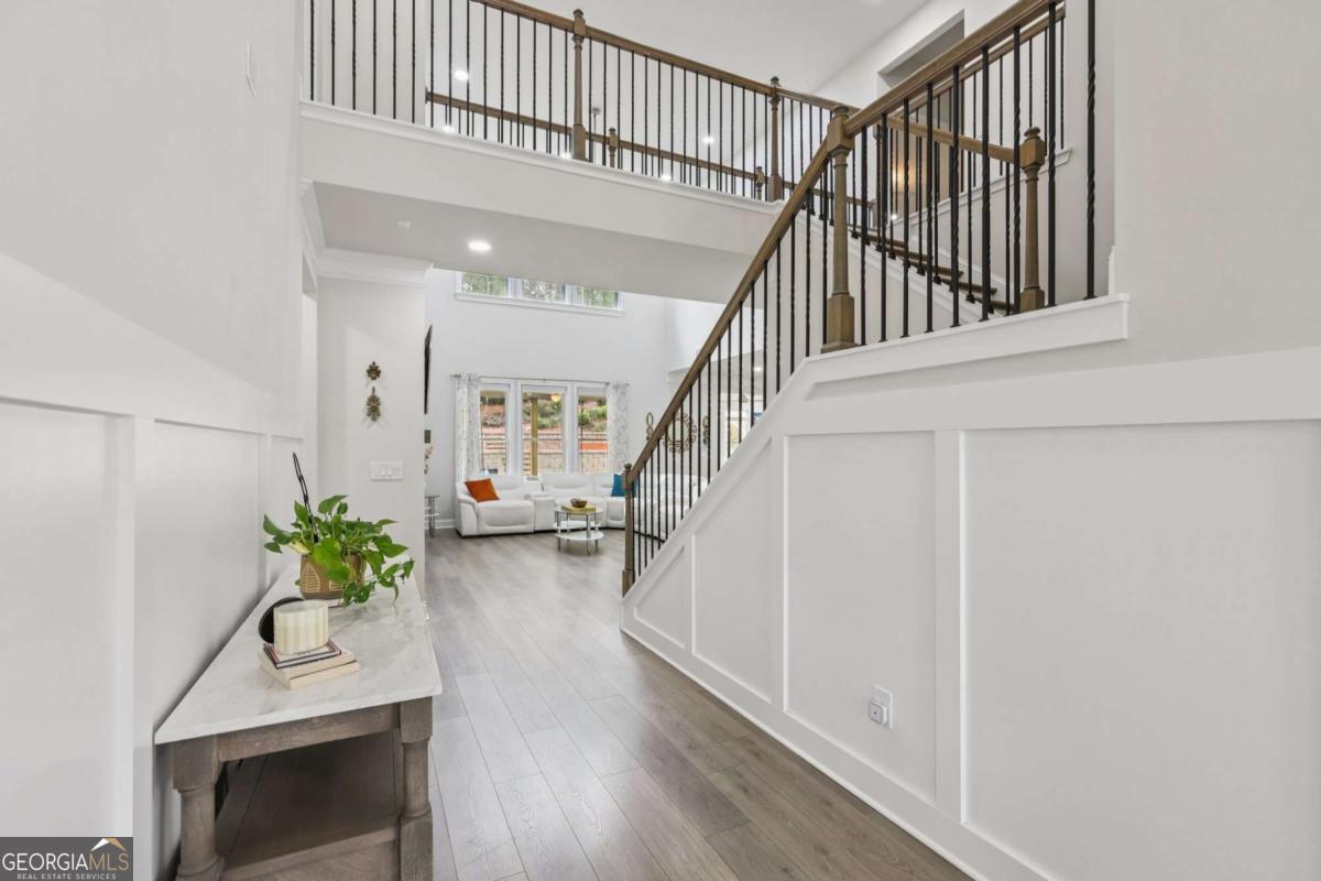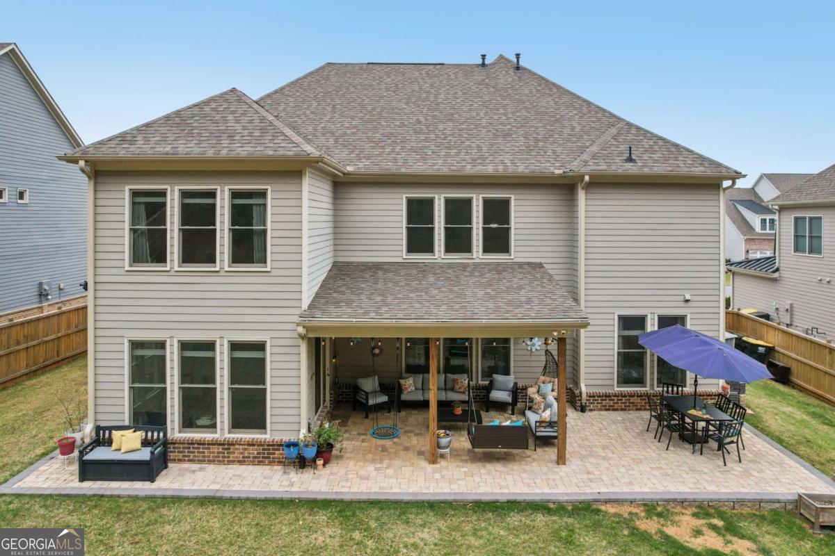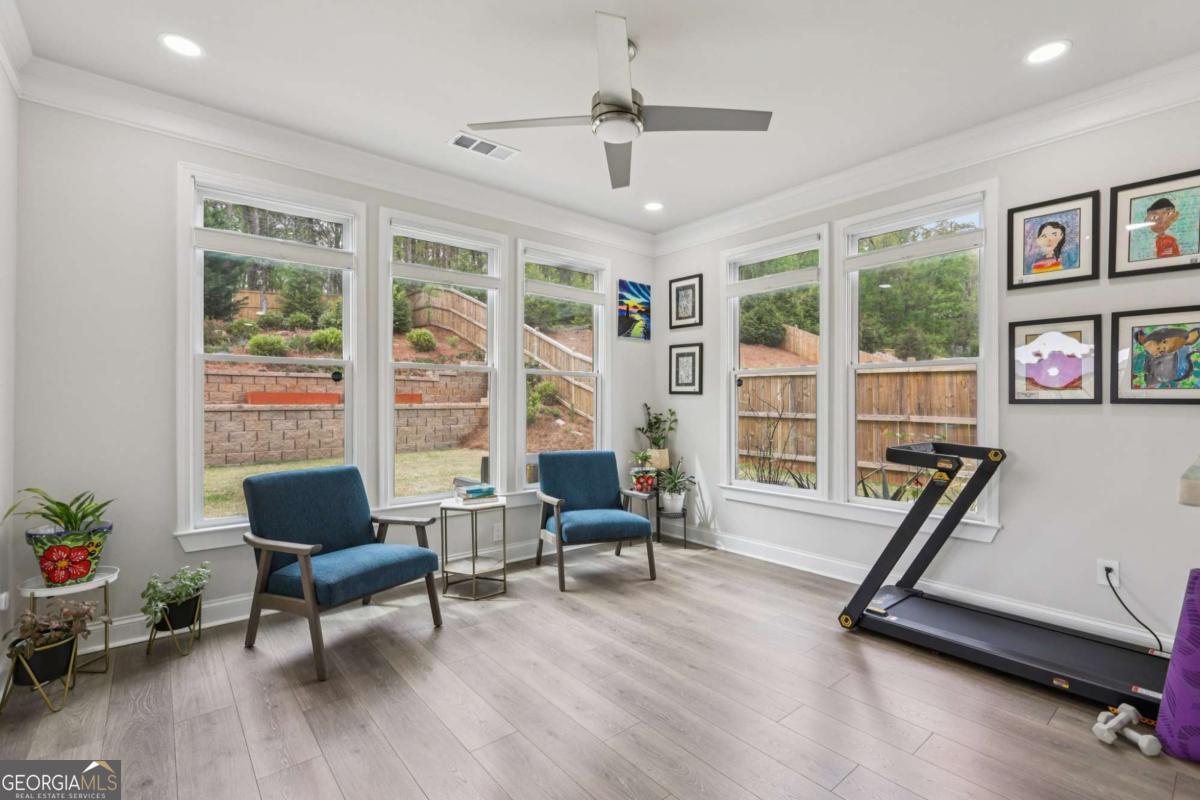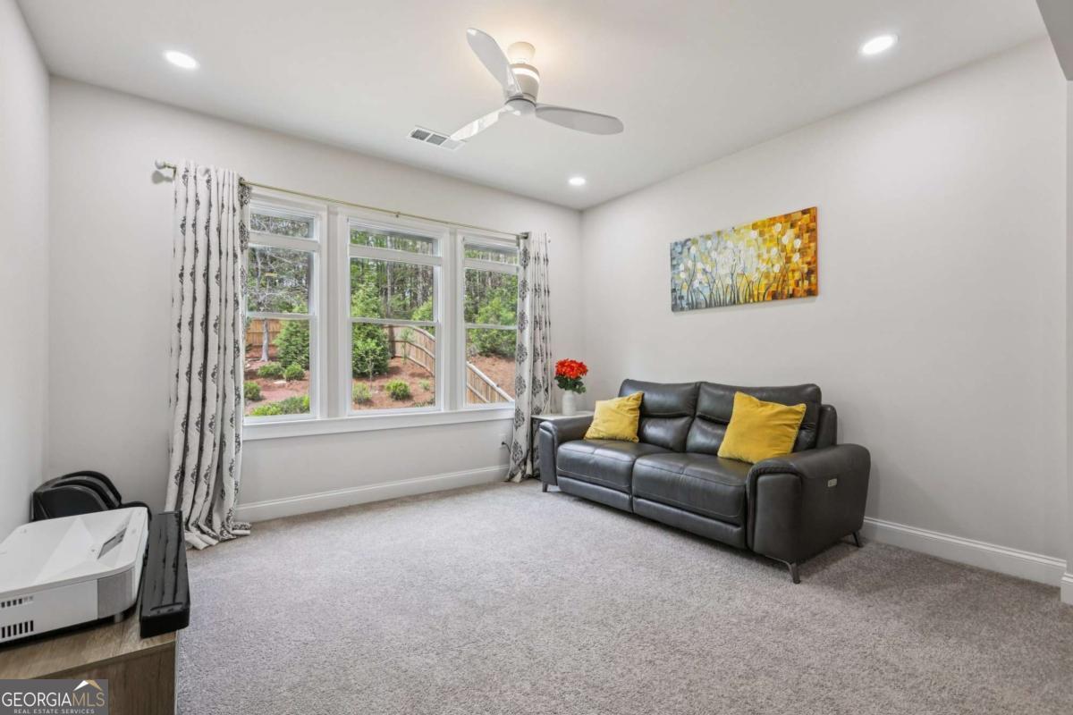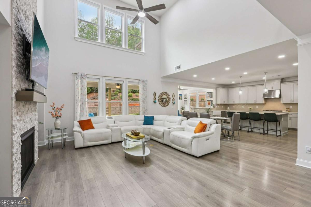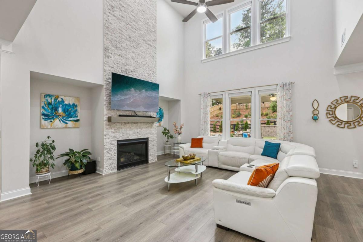 Welcome home to Hadley Estates, one of Forsyth County's most sought-after communities, known for its top-rated schools, close-knit atmosphere, and only 77 homes that truly create a neighborhood feel. Built in 2022 and thoughtfully upgraded, this east-facing home is filled with natural light throughout the day and offers the perfect blend of comfort, function, and elevated design. From the moment you enter, you are greeted by a dedicated office and formal dining room, leading into a spacious open-concept main level designed for both everyday living and entertaining. The main level features durable and stylish LVP flooring throughout, creating a seamless and modern feel. The heart of the home is the stunning kitchen, complete with an upgraded level 4 oversized quartz island, stainless steel appliances including a gas cooktop, oven, and built-in microwave, vent hood exhausting to the outside along with a walk-in pantry featuring built-ins and upgraded counters. The inviting living area is anchored by a gorgeous stacked stone fireplace and enhanced with remote-controlled blinds and smart lighting via Lutron, creating both comfort and convenience. Just off the kitchen, a beautiful sun room flows seamlessly to the covered back patio, creating a true outdoor oasis perfect for relaxing or hosting. The main level also features a private guest suite with its own ensuite bath, along with an additional flex space ideal for a playroom or second office. A conveniently located powder room completes the main level. Upstairs, plush carpeting adds comfort throughout the second level. The oversized primary suite offers a large sitting area, spa-like bath with dual vanities and a stunning walk in shower with built in bench, and a custom walk-in closet with built-ins. Three additional bedrooms provide generous space, including one with a private ensuite and two connected by a Jack-and-Jill bath. The upstairs laundry room adds convenience with a sink and built-in shelving. The fully fenced backyard has been enhanced with added stairs leading to an upper level, offering additional usable space perfect for quiet moments, entertaining, or even a peaceful retreat. Exterior focus lighting is controlled through the Lumary app, while the irrigation system is managed with B-hyve for effortless maintenance. This home is thoughtfully equipped with smart features throughout, including ceiling fans controlled via Hubspace, a smart front door with Schlage keypad entry, and a garage door system powered by myQ for added convenience and security. Additional highlights include a two-car garage and access to the community pool. This home also features Taylor Morrison's LiveWellTM package, thoughtfully designed to support everyday wellness with whole-home air filtration, filtered water at the kitchen sink, water-saving fixtures, and low-VOC materials that contribute to a cleaner, healthier living environment. Perfectly located with convenient access to GA-400 via Exit 13 and Exit 14, making commuting throughout Forsyth County and into North Atlanta seamless. Just minutes to The Collection at Forsyth and Cumming Marketplace, offering a wide variety of dining, shopping, and entertainment options. Enjoy close proximity to outdoor recreation including Sawnee Mountain Preserve, Central Park, and Fowler Park, offering trails, sports fields, and year-round activities. This is the one you've been waiting for.