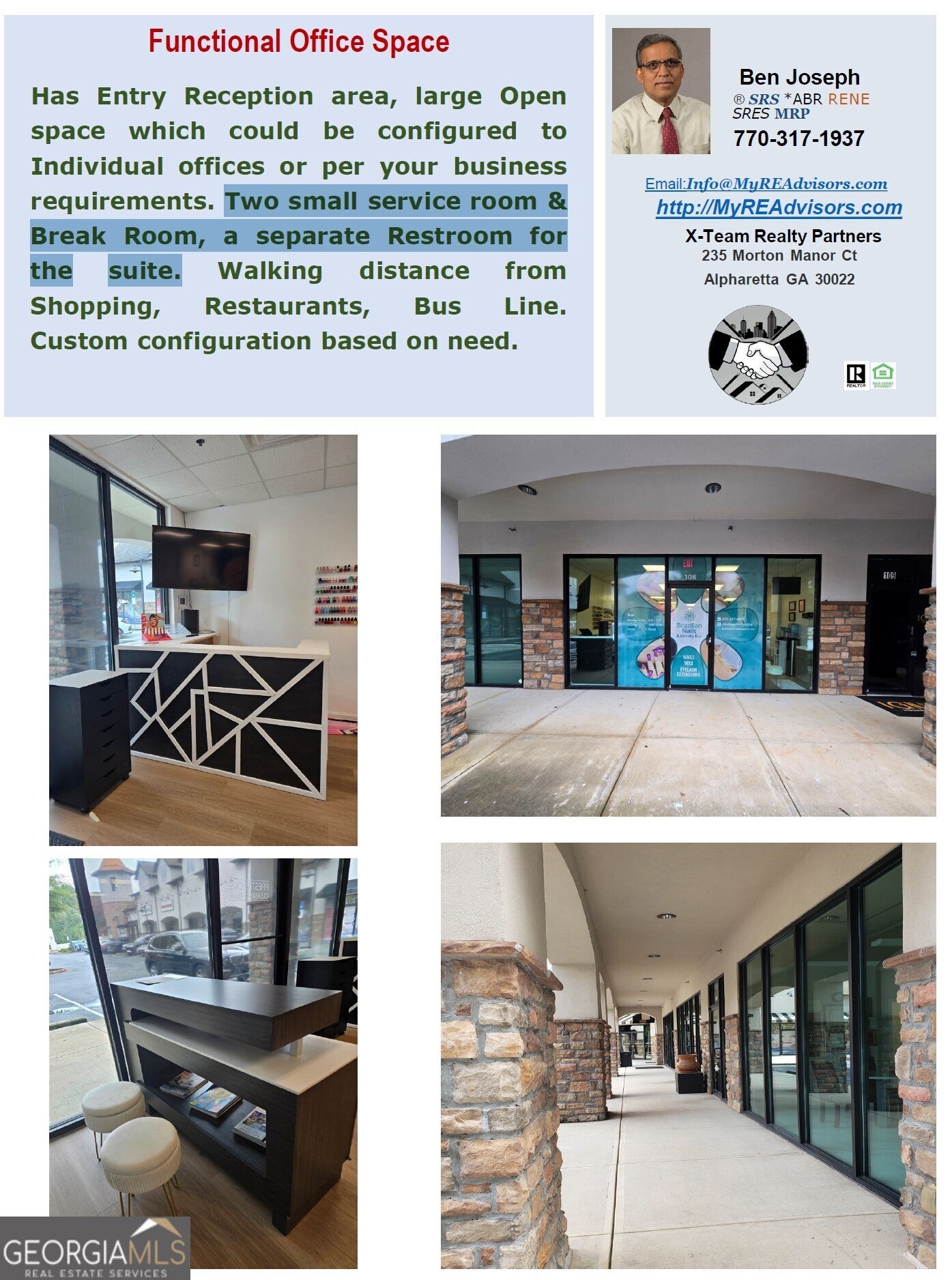 Excellent Opportunity Neighborhood Small Business Excellent street visibility & proximity to KSU Well Maintained Excellent Condition - Updated in 2024 Walking distance from Shopping, Restaurants, Bus Lines Two small service room & Break Room, a separate Restroom for the suite Open space which could be configured to Individual offices or per your business requirements. Possible build to suite to meet your Business requirement 1363 SF immediately available for lease. Suitable for Dentist, Insurance Agency, Nail or Hair Salon Spa, Tutoring for Kumon others similar or Music or Art & Dance, Game Shop, Boutique, Floral shop, Screen printing or Local Service Provider etc.. The property is surrounded by local and nationally recognized retail and popular restaurants. Minutes from I-75 and I-575 and Cobb County Airport