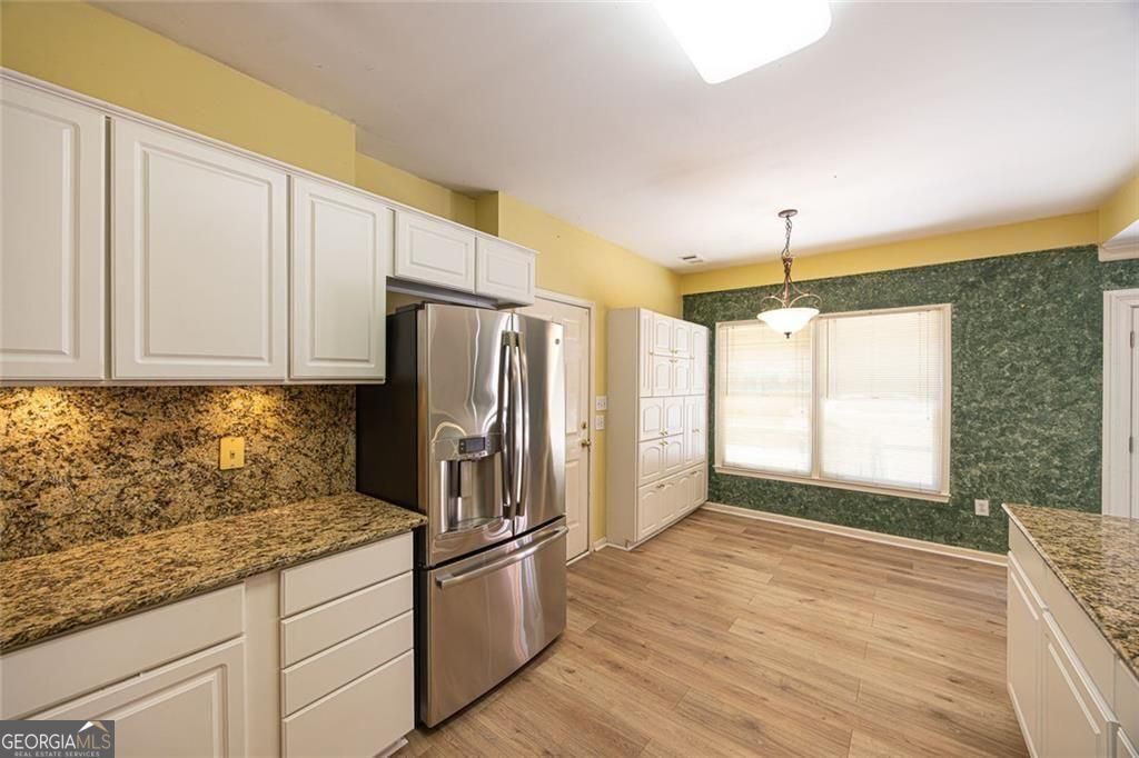 Welcome to 431 Thornbush Trace, a charming farmhouse style home nestled in the desirable community of Lawrenceville, GA. This well-maintained property boasts new luxury vinyl flooring and carpet, and a front porch swing perfect for enjoying the peaceful neighborhood surroundings. The exterior was recently painted. Step inside to be greeted by a spacious foyer that leads to the upstairs and an open-concept layout seamlessly connecting the living room, dining area, and kitchen, great for cooking while visiting with family and friends. Just waiting for your personal touches. The home offers 3 bedrooms and 2.5 bathrooms, there is plenty of space for comfortable living. Not only is there a 2 car garage in back, there's a large parking pad for 4 cars or even a backyard play area. Convenience is key with a private back entry to the 2-car garage, providing easy access to the kitchen or the spacious laundry room. For those who value education, the property is conveniently located 5 minutes from Gwinnett School of the Arts, 11 minutes from Georgia's #1-ranked Gwinnett School of Mathematics, Science & Technology, it is in the Central Gwinnett school District, and 13 minutes from Georgia Gwinnett College. You are also just 11 minutes from Northside Gwinnett Hospital, providing easy access to world-class healthcare. With its desirable layout, inviting features, and unbeatable location, this home offers an exceptional opportunity to enjoy the best of Lawrenceville living. Located just minutes away from Hwy 29 and I-85, this home offers quick access to local shops, restaurants, and schools. Best of all, there are no HOA fees or rental restrictions, giving you the freedom to make this house your own. Don't miss out on this wonderful opportunity to call 431 Thornbush Trace home in Lawrenceville. Welcome home!