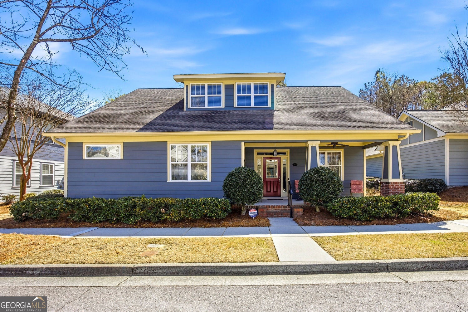 This 3-bedroom, 2.5-bathroom Craftsman gem is full of character and an abundance of oversized windows that flood the open interior with natural light! The main level features a beautiful kitchen with stained cabinets and black granite countertops, an open living room anchored by a gas fireplace flanked by custom built-in bookcases, and a dining room with plate railing and two walls of large windows. Tucked away on the main floor is the primary suite, with a spacious bathroom and large walk-in closet. Upstairs, you will find a versatile bonus/flex space, two additional bedrooms with large closets, and a convenient Jack-and-Jill bathroom. The charm extends to the outdoors with three distinct living areas: a covered front porch for visiting with neighbors, a private covered side porch for quiet mornings, and a rear patio ideal for evening gatherings. The two-car rear-entry garage is convenient and maintains the classic curb appeal of this charming community. No need for a lawn mower! The lawn care and grounds maintenance is all handled by the HOA. This home offers the convenience of being just minutes away from The Railyard and all that downtown Grayson has to offer, while feeling a world away in the idyllic Ivey Parc community.