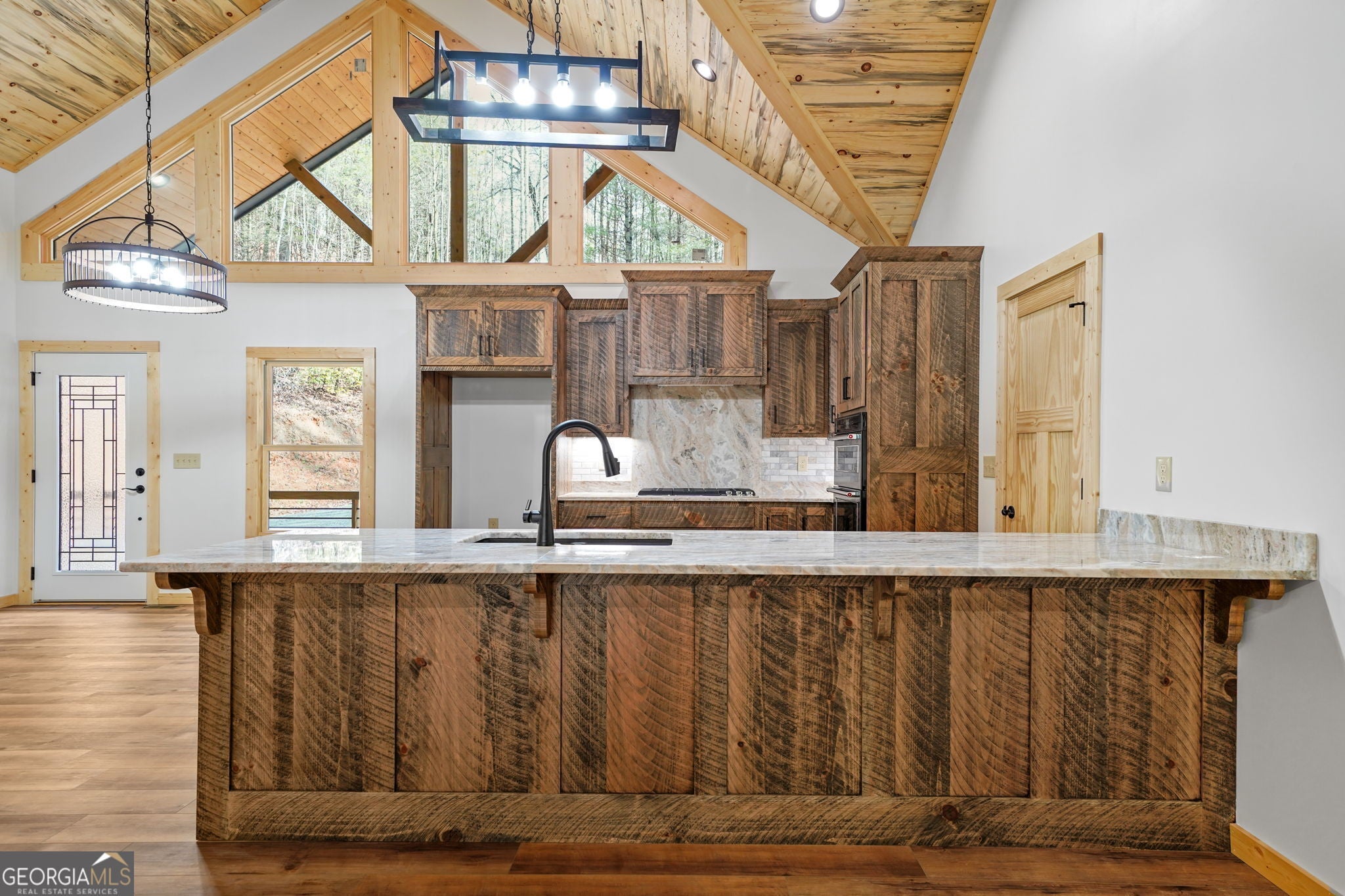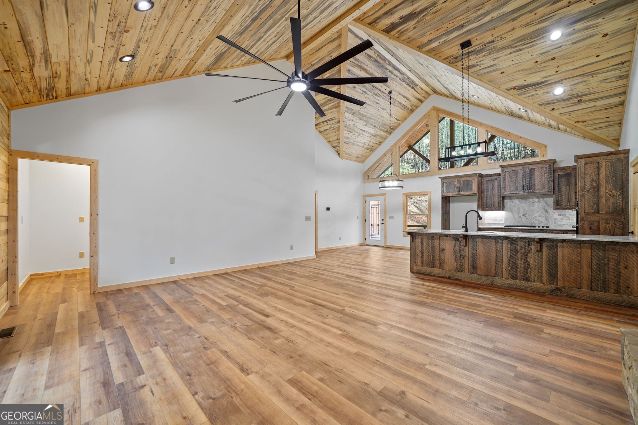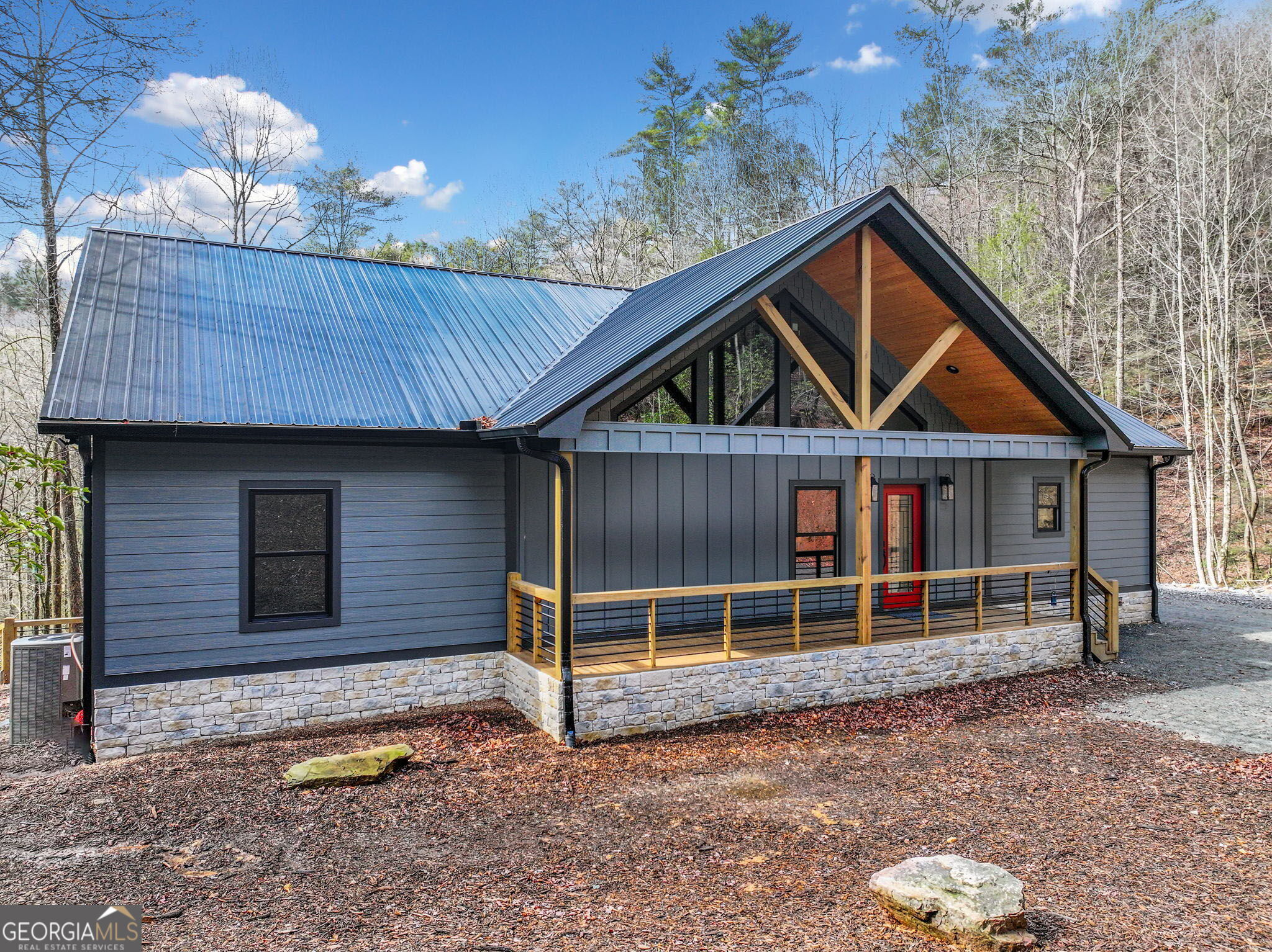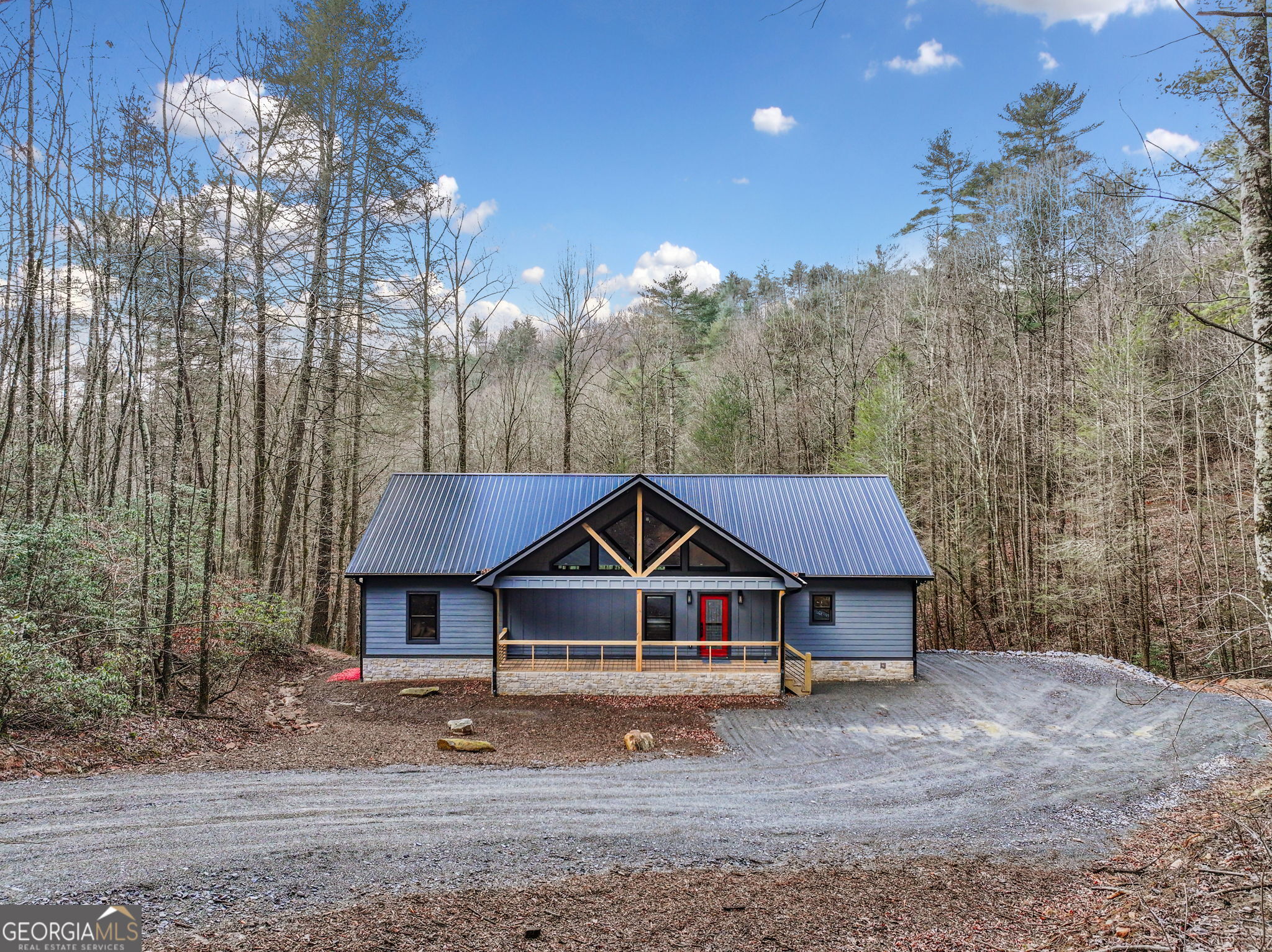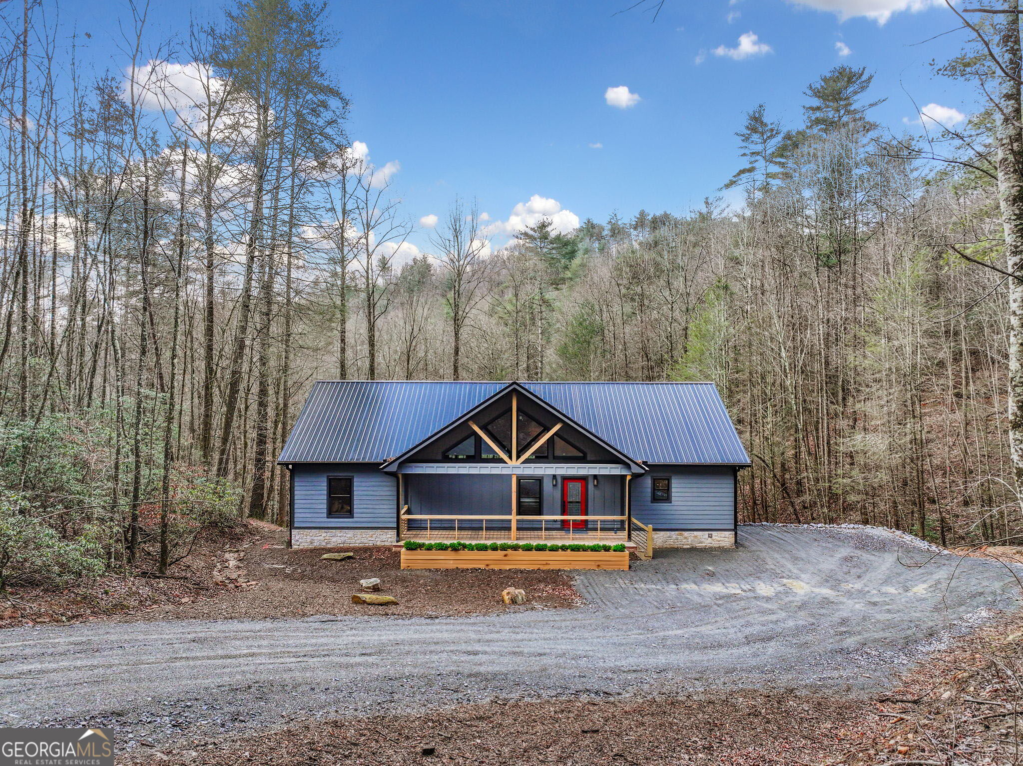 This dream mountain masterpiece is nestled on 2.33 gorgeous acres with the musical sounds of Bryant Creek flowing along the rear of the property. Durable Hardie board siding, metal roof & stacked stone clad foundation provide both beauty & long-lasting protection. A spacious, covered front porch invites you inside to a wide-open great room where rustic elegance takes center stage featuring a wormwood-clad ceiling, rough-sawn kitchen cabinetry & custom windows that follow the soaring roofline. The chef's kitchen offers abundant counter space, long peninsula with seating ideal for entertaining, along with a pantry. Overlooking the dramatic great room with floor-to-ceiling stacked stone fireplace & oversized windows, the living space flows effortlessly to the full-length rear porch. Relax year-round with the sights & sounds of the tumbling creek & the warmth of an outdoor fireplace on cool mountain evenings. The main level also includes a "tech room" perfect for smart home setup, small office, or craft room. The private master wing features vaulted ceilings, perfect blend of wood & drywall finishes, access to the rear porch & views of the water. The spa-like ensuite has a walk-in shower with wood-look tile, double sink granite vanity & separate his & her closets. Two additional bedrooms & a full bath with tiled tub/shower combo sit on the opposite wing of the home, along with a spacious laundry room. The terrace level offers a massive entertaining space complete with full bar or 2nd kitchen, office/4th bedroom, full bath & a large mechanical room with room for storage. Step outside to the lower patio or meander over to splash in the creek. Tucked away with only 1/2 a mile of gravel road, you'll enjoy peace & privacy while still being an easy drive to the charming shops & restaurants of Downtown Ellijay, vineyards & endless outdoor adventures. Don't miss this rare opportunity to own a brand-new mountain home with the perfect blend of luxury, nature & convenience!