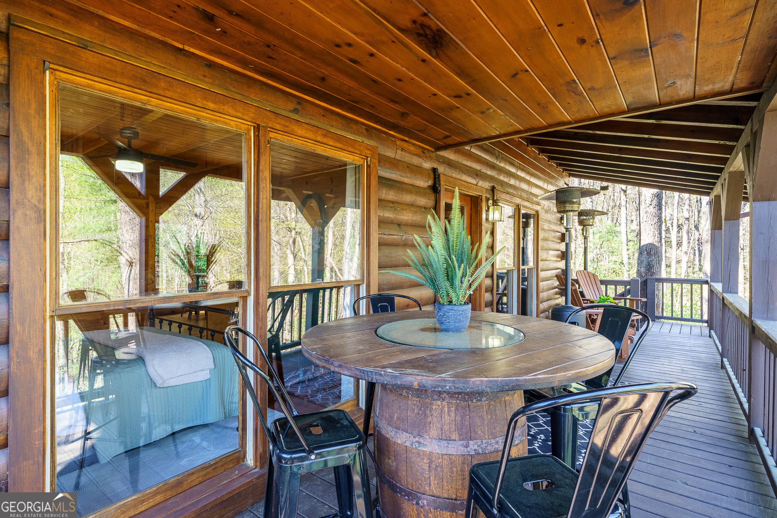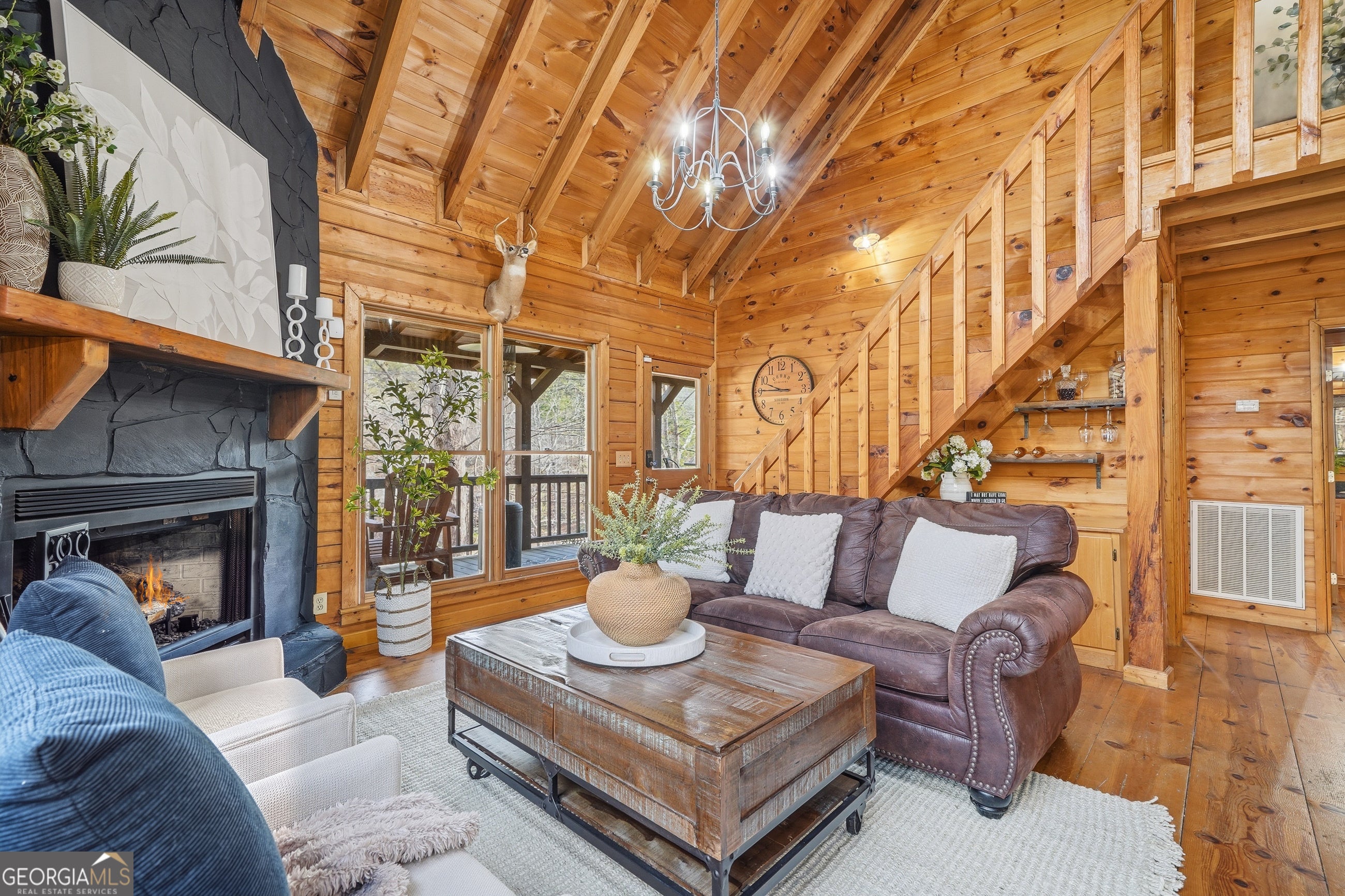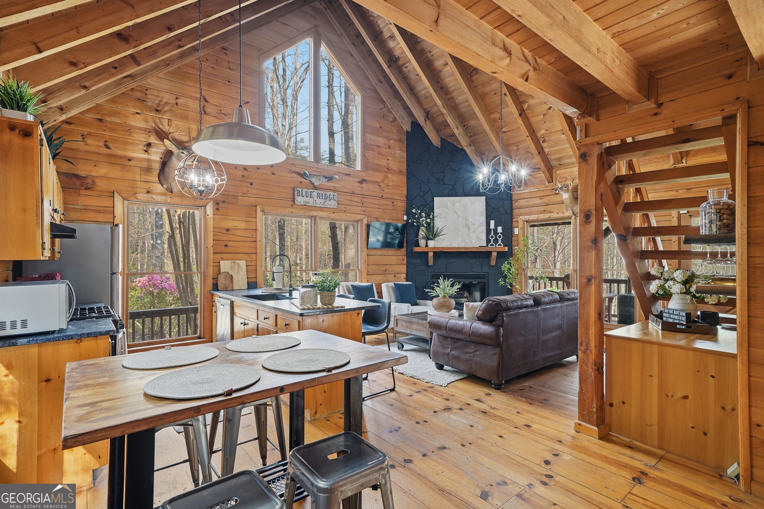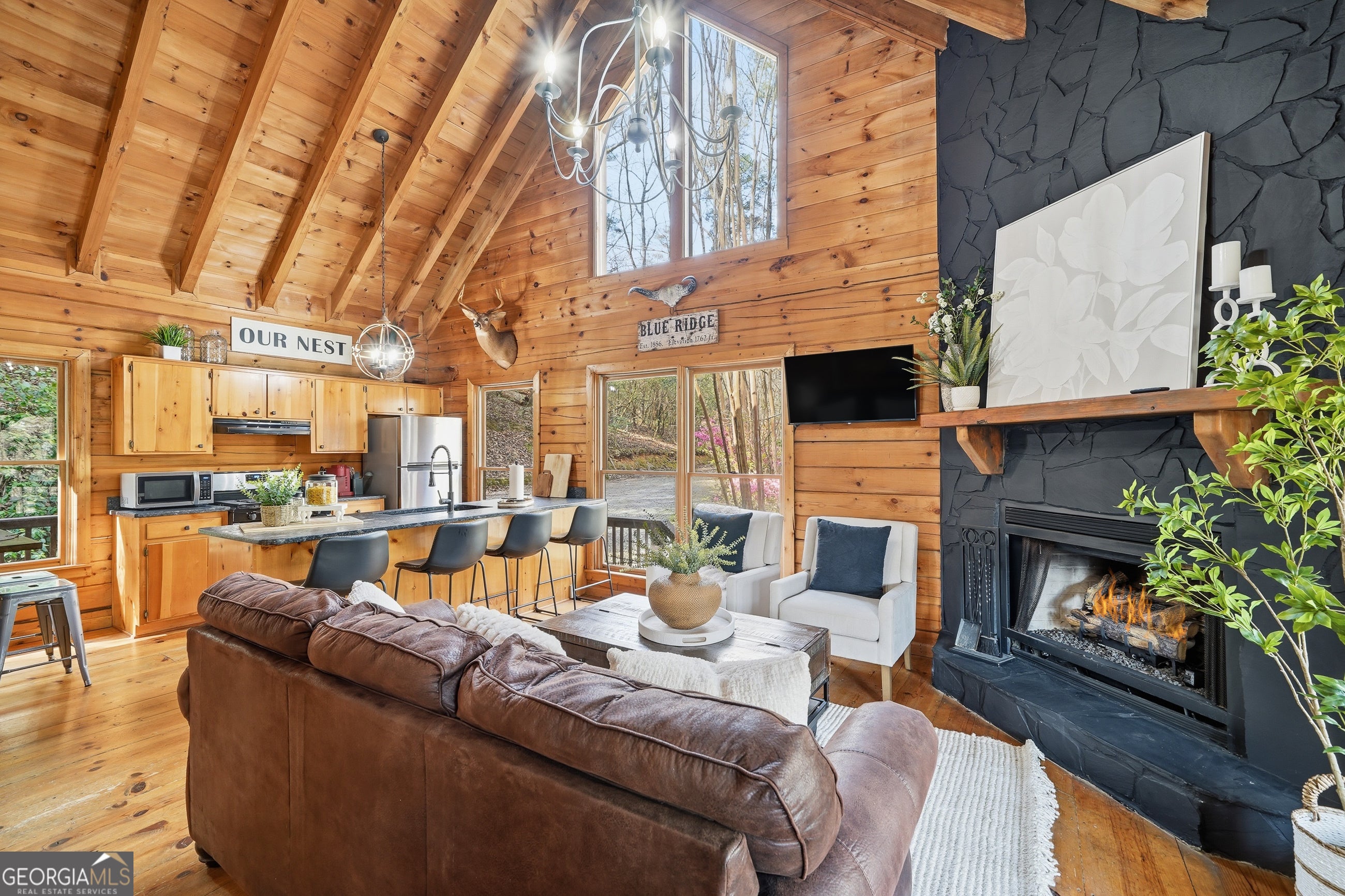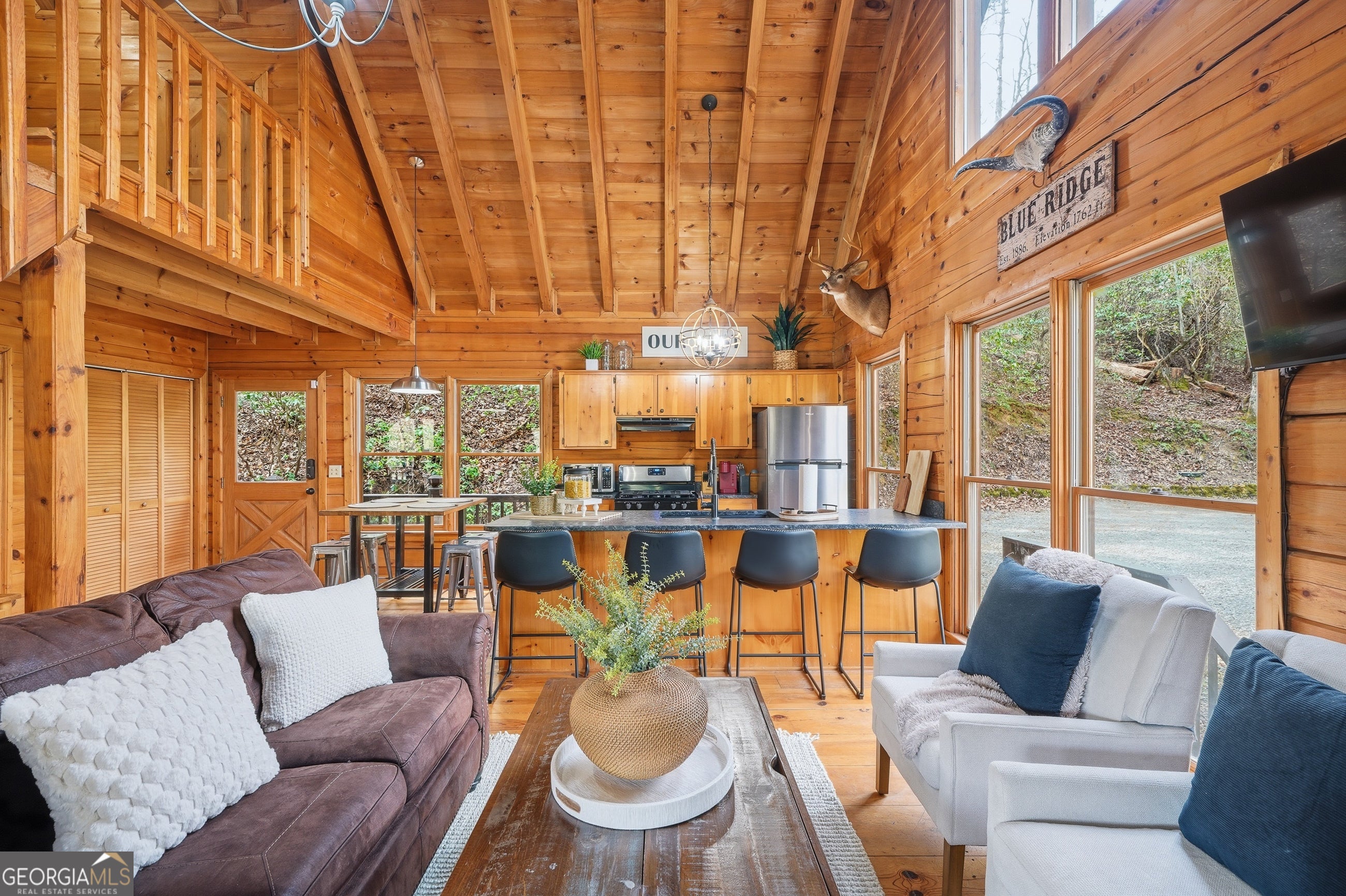 Explore your own private sanctuary! Soaring above the shimmering glass-like surface of a private lake that remains full and vibrant through every season, this solid log cabin offers a rare connection to the water that never fades with the changing calendar. The heart of this sanctuary is the primary owner's suite, where a private sunroom with windows on three sides creates the magical sensation of floating among the emerald canopy of the North Georgia forest. This dedicated meditation space is perfectly positioned to capture elevated, panoramic vistas of the lake below, offering a peaceful start to your day as the mist rises off the water. Inside, the home unfolds with an open floor plan defined by towering vaulted ceilings and rich wood finishes that glow under the natural light pouring through massive windows. The seamless flow from the updated kitchen to the living area makes hosting effortless, while the warmth of the stone fireplace anchors the room with classic mountain character. Beyond the interior, multiple levels of outdoor living space-including two expansive decks and a dedicated lake patio-provide endless opportunities for entertaining or quiet reflection. Whether you are seeking a lucrative investment with excellent rental potential or a permanent escape just minutes from the charm of downtown Blue Ridge, this fully furnished retreat is designed for those who want to live in harmony with nature without sacrificing modern comfort. Reach out to schedule your private tour and witness the permanent beauty of this lakeside escape for yourself!