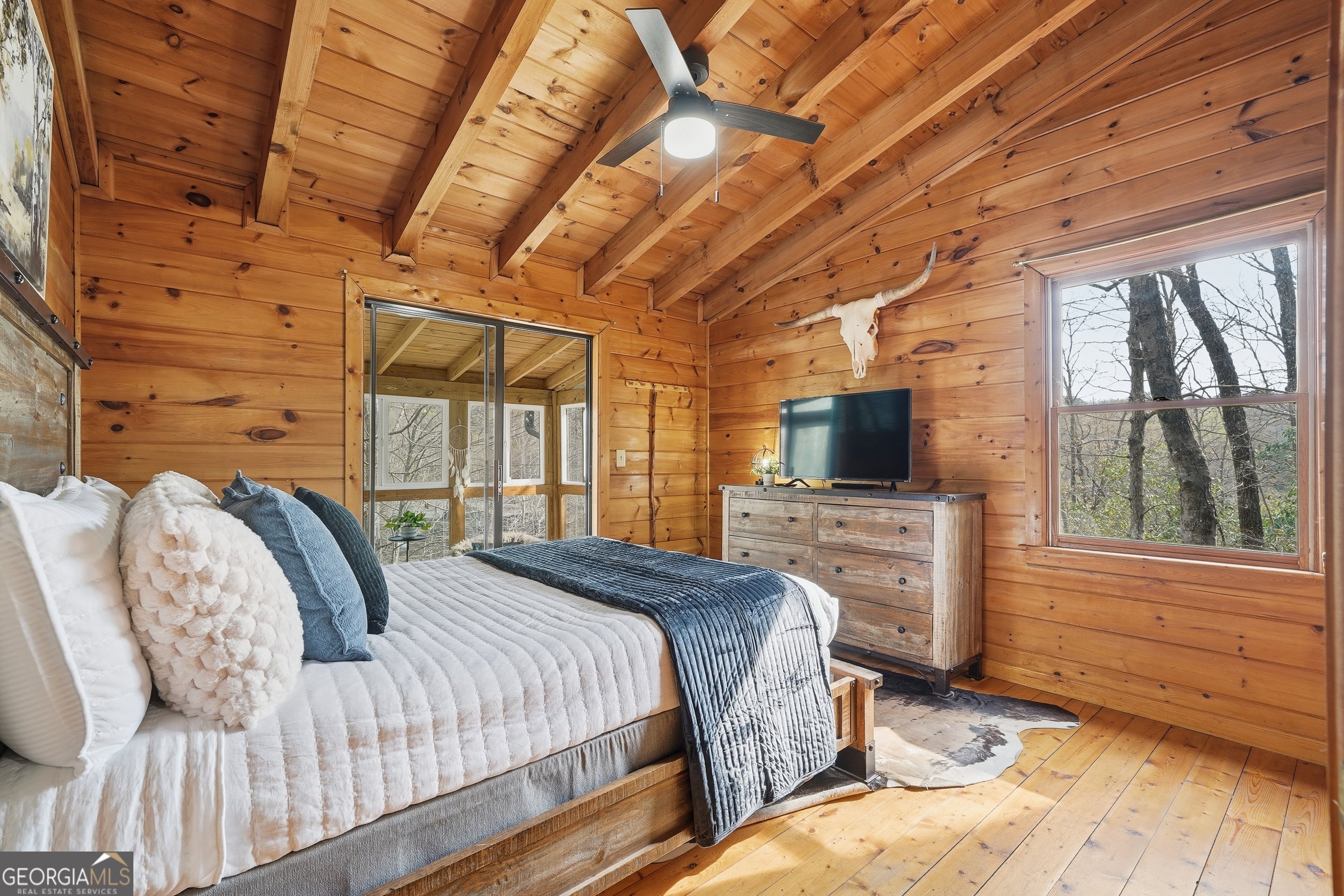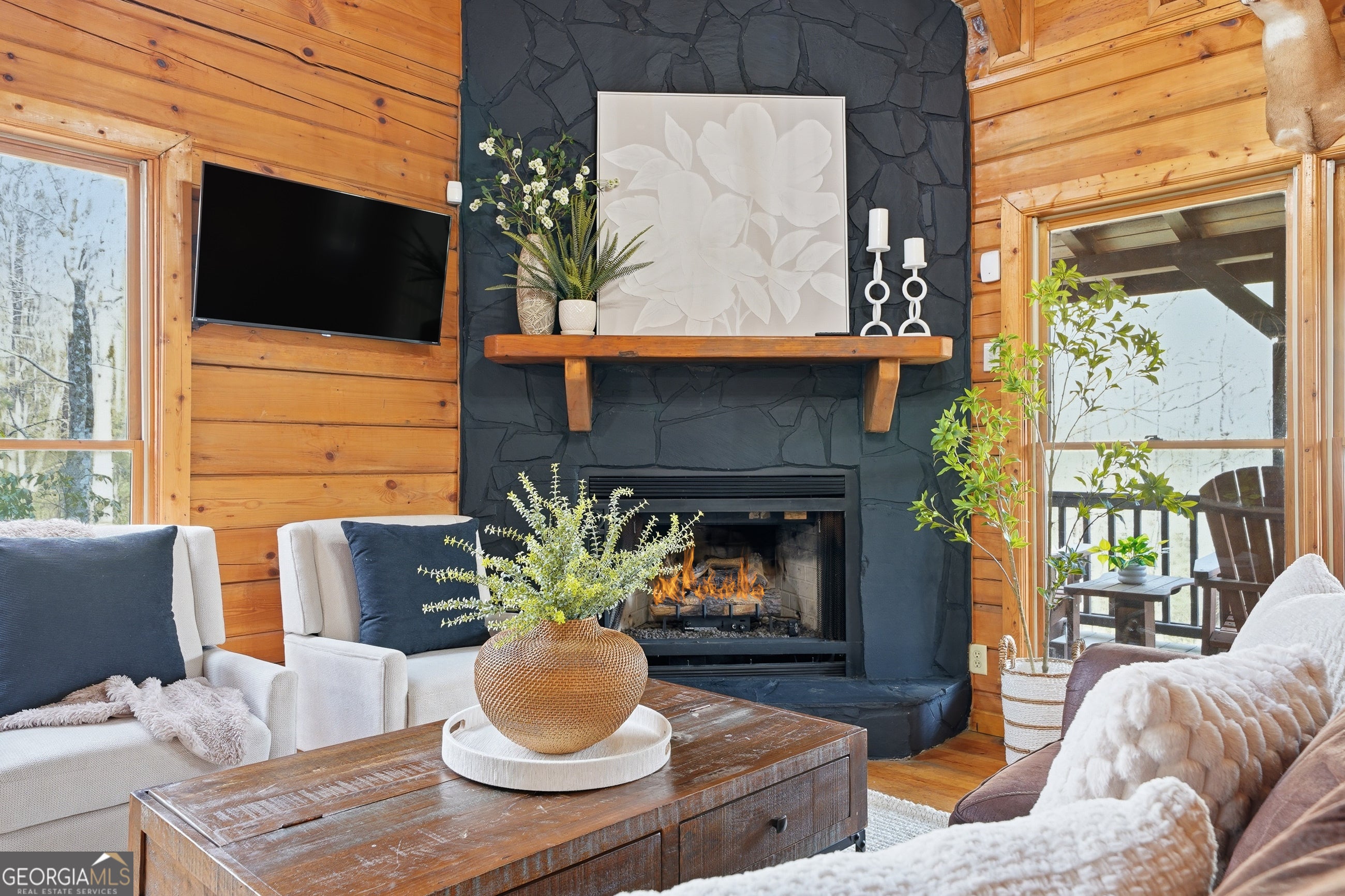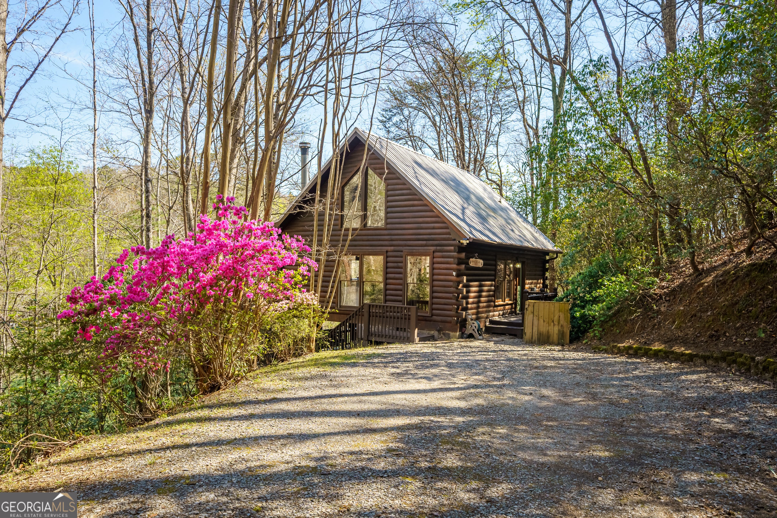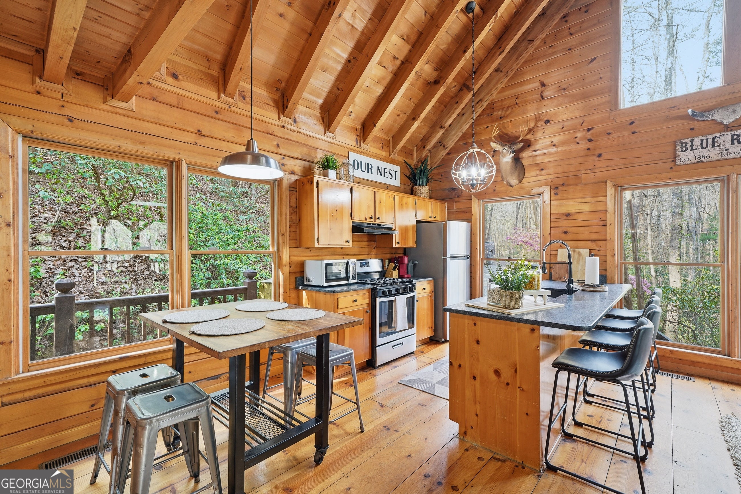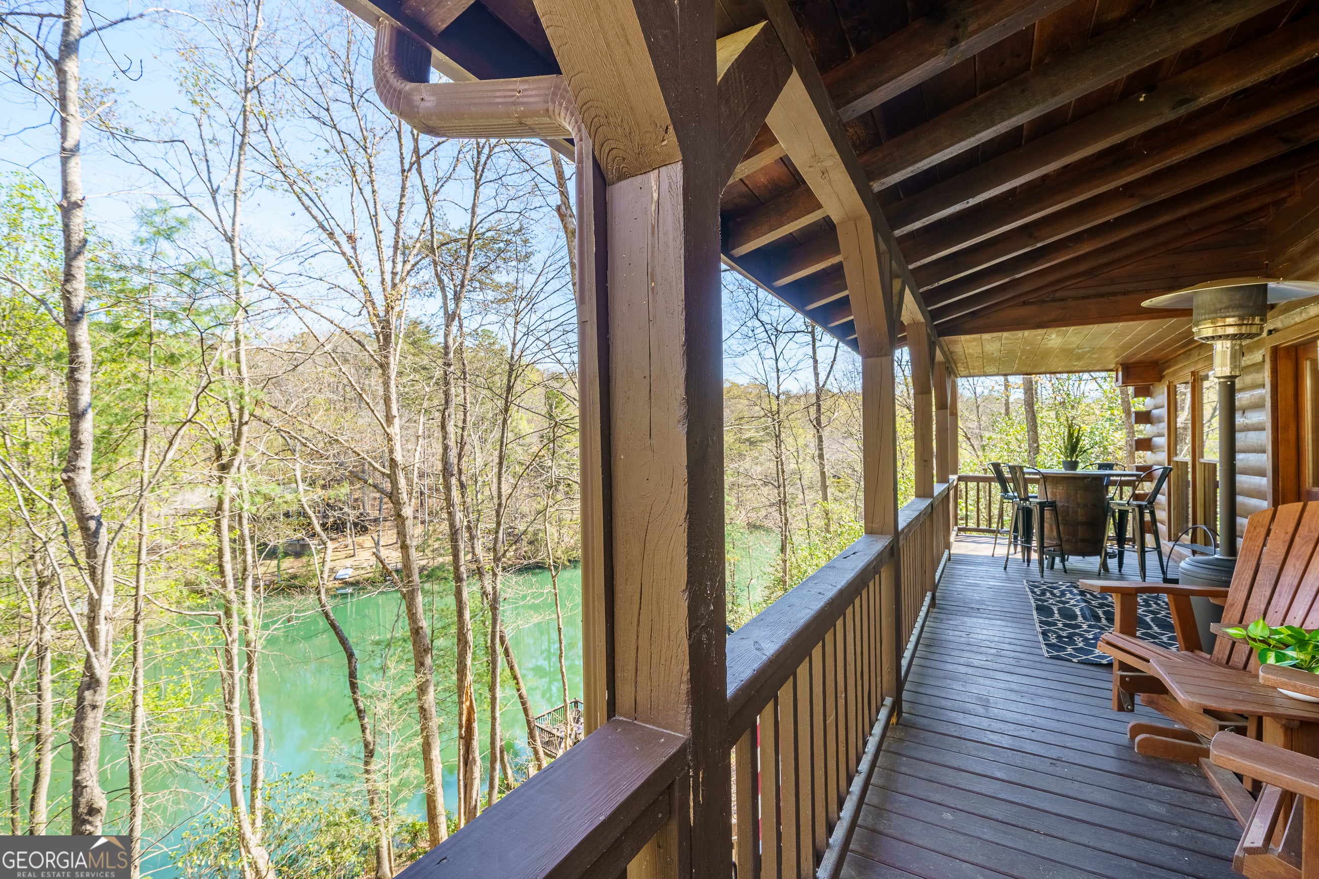 Explore your own private sanctuary! Soaring above the shimmering glass-like surface of a private lake that remains full and vibrant through every season, this solid log cabin offers a rare connection to the water that never fades with the changing calendar. The heart of this sanctuary is the primary owner's suite, where a private sunroom with windows on three sides creates the magical sensation of floating among the emerald canopy of the North Georgia forest. This dedicated meditation space is perfectly positioned to capture elevated, panoramic vistas of the lake below, offering a peaceful start to your day as the mist rises off the water. Inside, the home unfolds with an open floor plan defined by towering vaulted ceilings and rich wood finishes that glow under the natural light pouring through massive windows. The seamless flow from the updated kitchen to the living area makes hosting effortless, while the warmth of the stone fireplace anchors the room with classic mountain character. Beyond the interior, multiple levels of outdoor living space-including two expansive decks and a dedicated lake patio-provide endless opportunities for entertaining or quiet reflection. Whether you are seeking a lucrative investment with excellent rental potential or a permanent escape just minutes from the charm of downtown Blue Ridge, this fully furnished retreat is designed for those who want to live in harmony with nature without sacrificing modern comfort. Reach out to schedule your private tour and witness the permanent beauty of this lakeside escape for yourself!