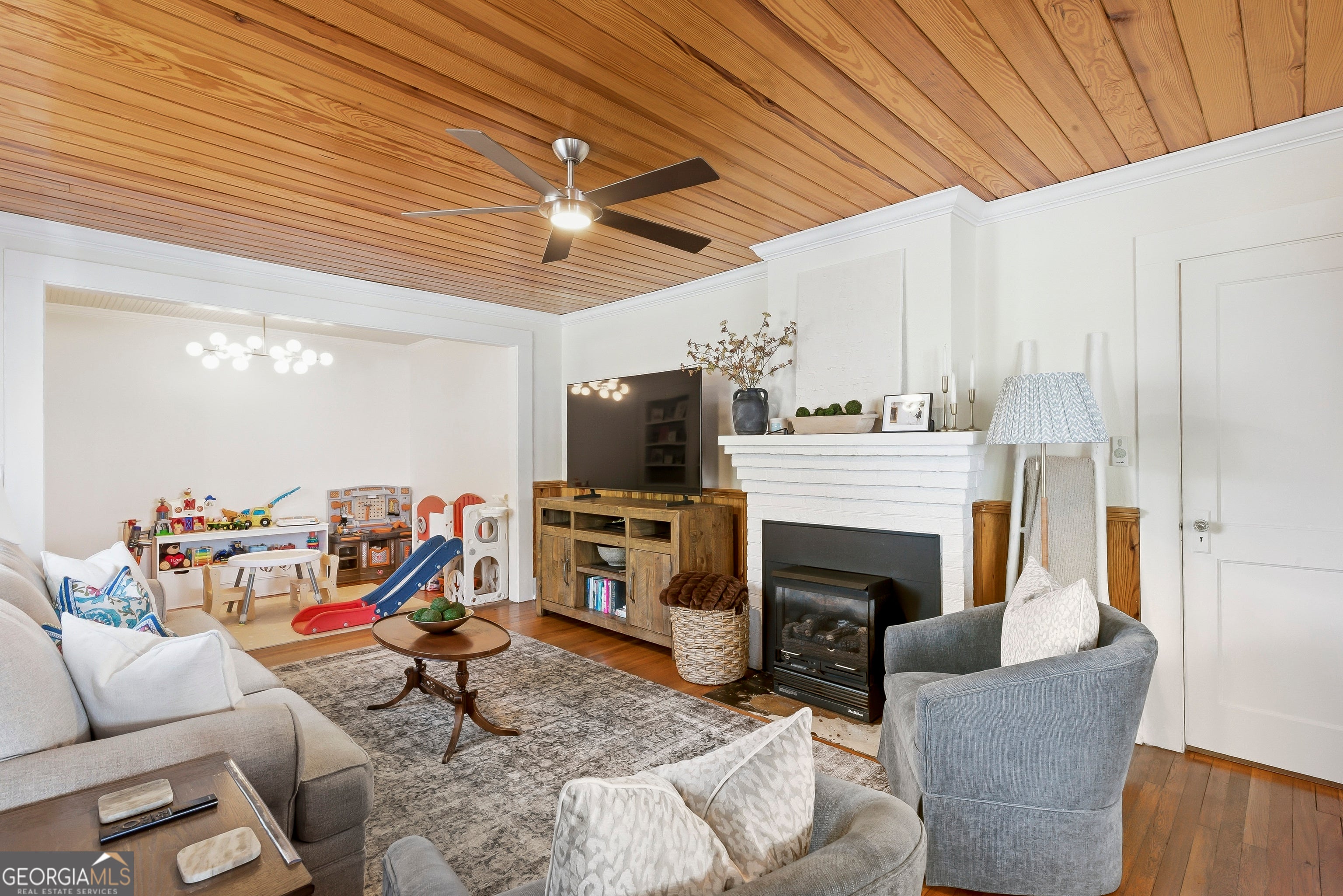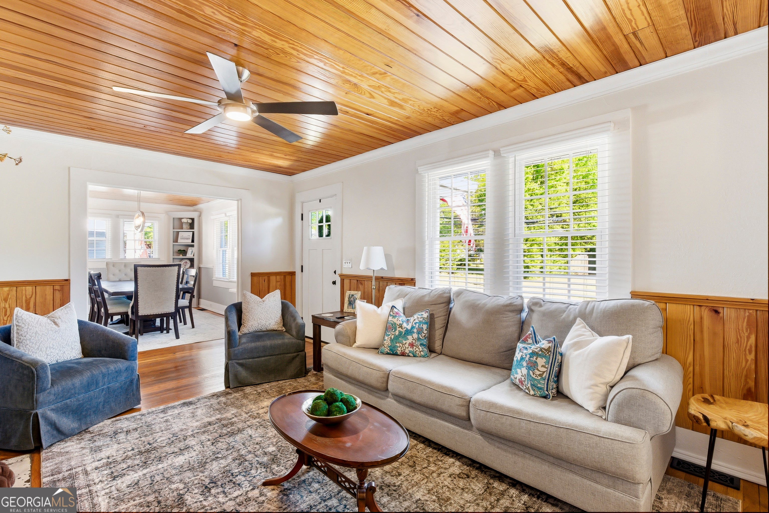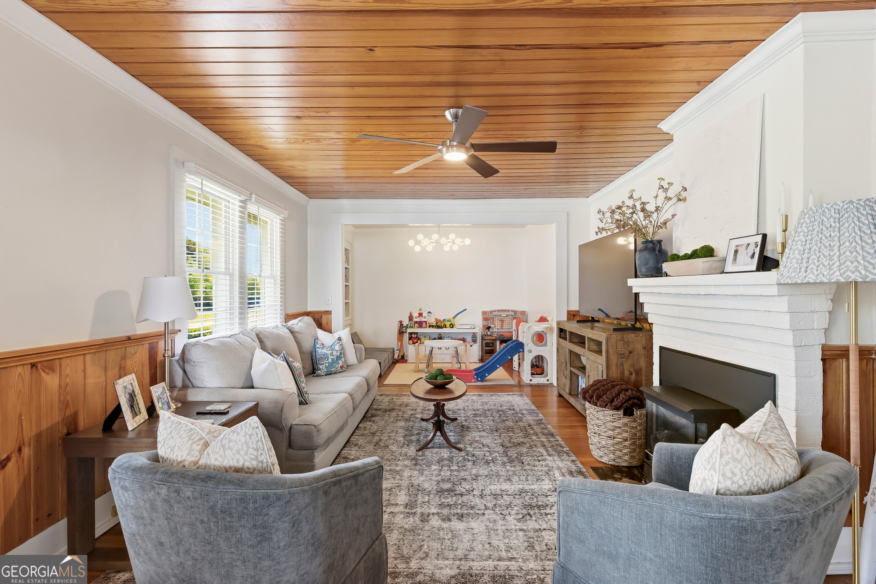 DOWNTOWN living at its finest....Nestled in the heart of Carrollton- all within walking distance to downtown shops, dining, and events! Step inside to find a warm, inviting living room featuring a stunning tongue-and-groove ceiling and brick gas fireplace, creating a custom feel. Just off the living area, a versatile inset space with beadboard custom shelving makes the perfect playroom, home office, or reading nook. A beautifully defined dining room-also accented with tongue-and-groove ceilings-perfect for hosting holidays and gatherings. The kitchen offers a cozy, inviting feel with granite countertops, stainless steel appliances, and pantry. A door off the kitchen leads directly to the outdoor space. The oversized primary suite offers a walk-in closet and a tiled shower. The large laundry room is a functional space, with cabinetry, a wash sink, and a trendy accent wall. Upstairs, you'll find an additional room with a closet and half bath-ideal for guests or a teen suite. Enjoy updates and modern finishes throughout the home. Storage is truly abundant both inside and out, including an unfinished basement perfect for extra storage. Outside, enjoy a newly sodded, fenced-in backyard designed for privacy and ideal for entertaining, cookouts, or simply relaxing. A detached shop provides the perfect space for hobbies or additional storage needs. Parking is no issue with a two-car garage plus a two-car drive-under carport. This home beautifully preserves its historic charm while offering the updates and functionality today's buyers love-don't miss your chance to own a piece of downtown Carrollton!