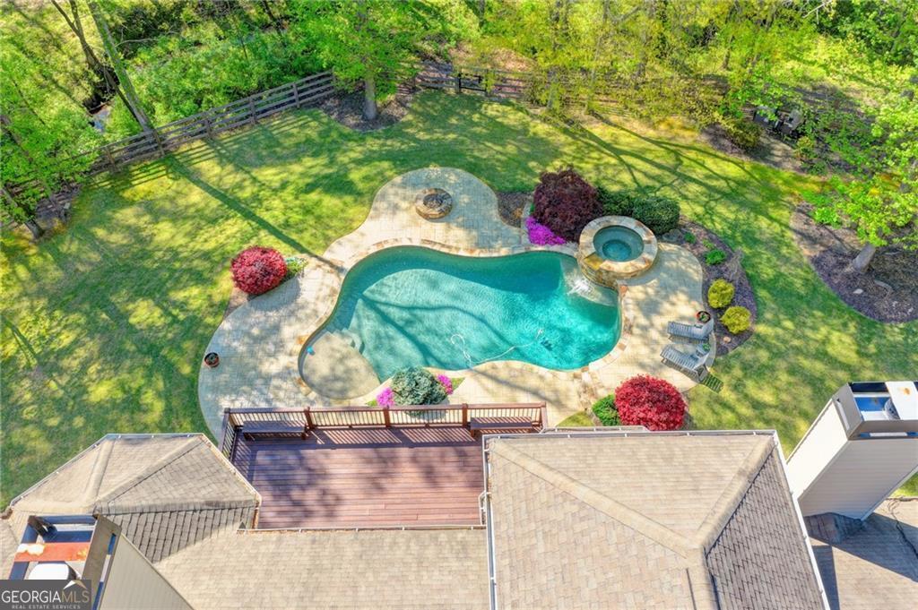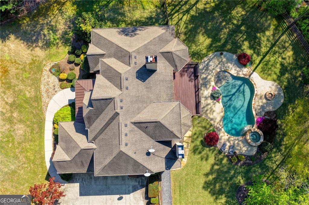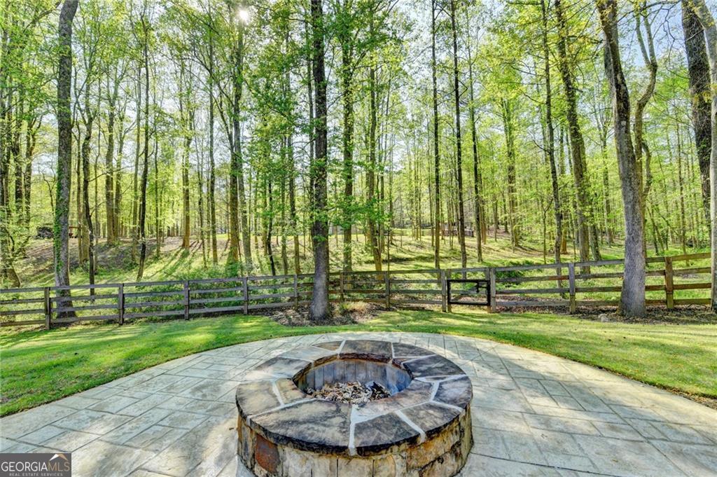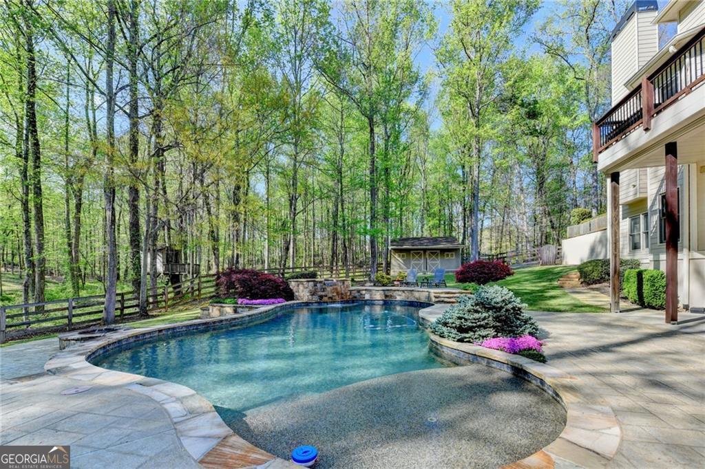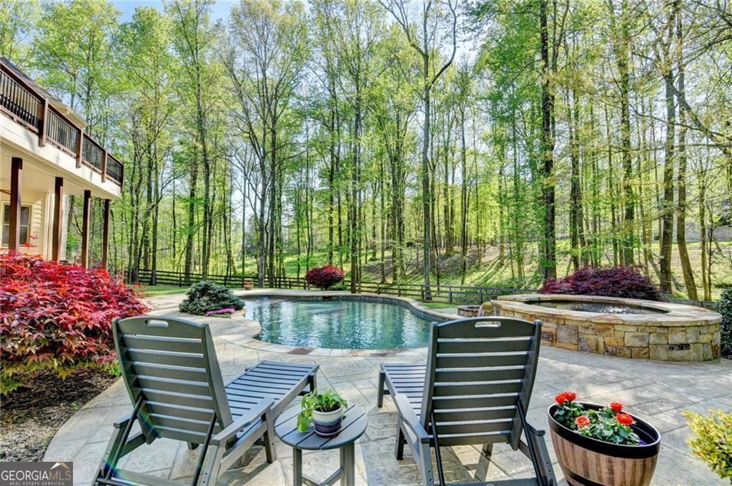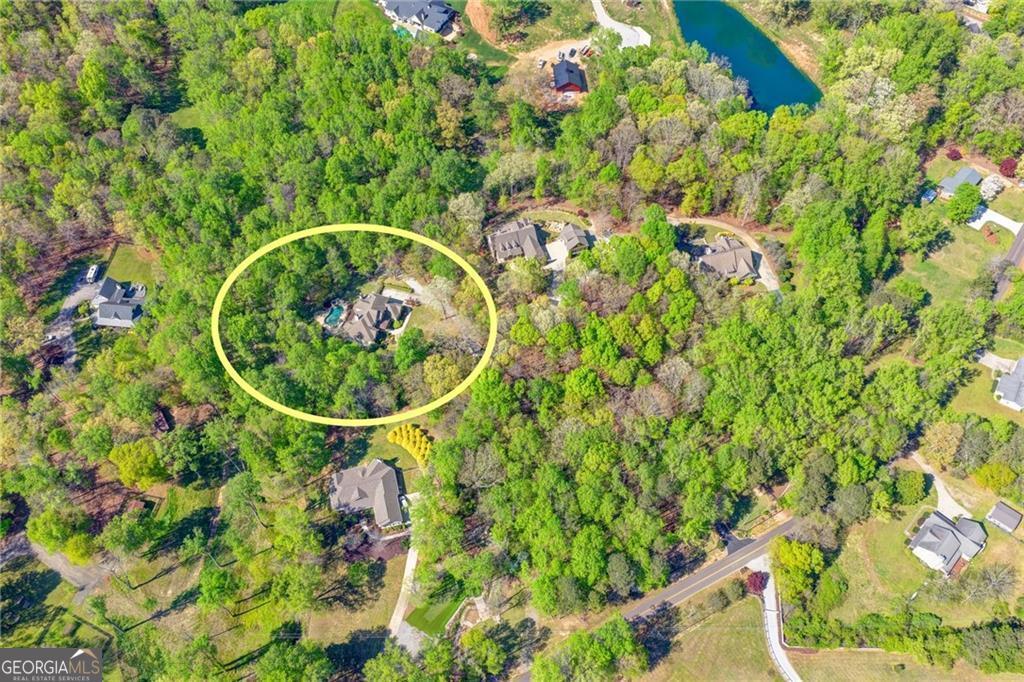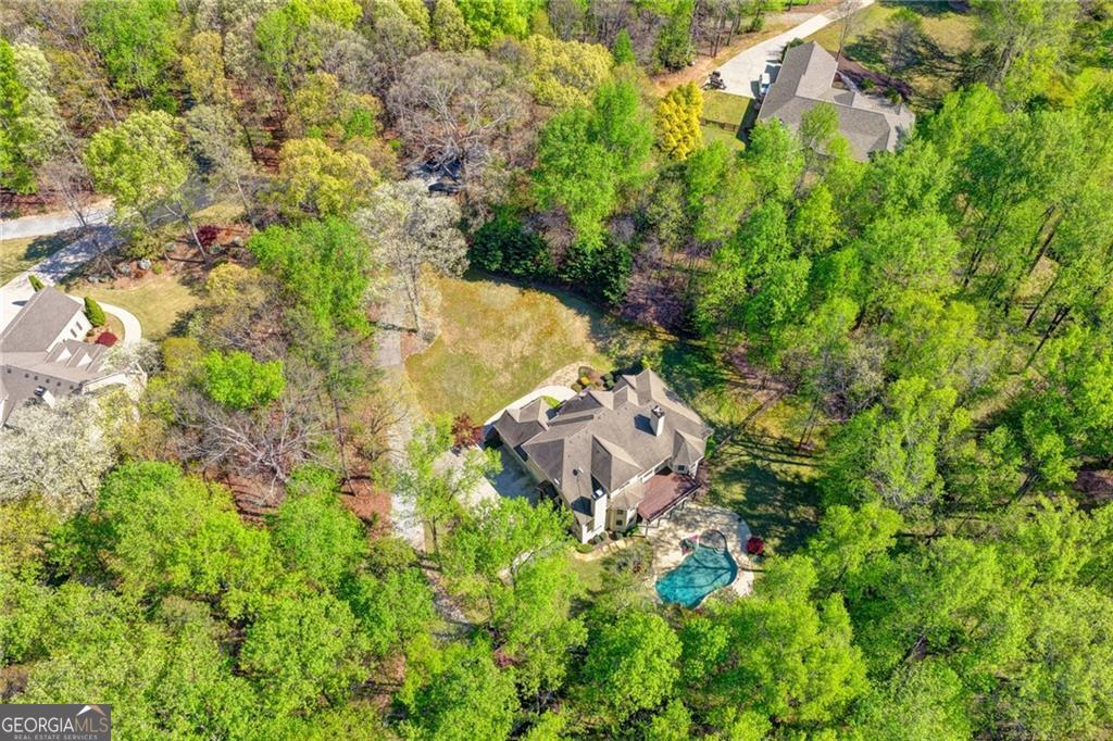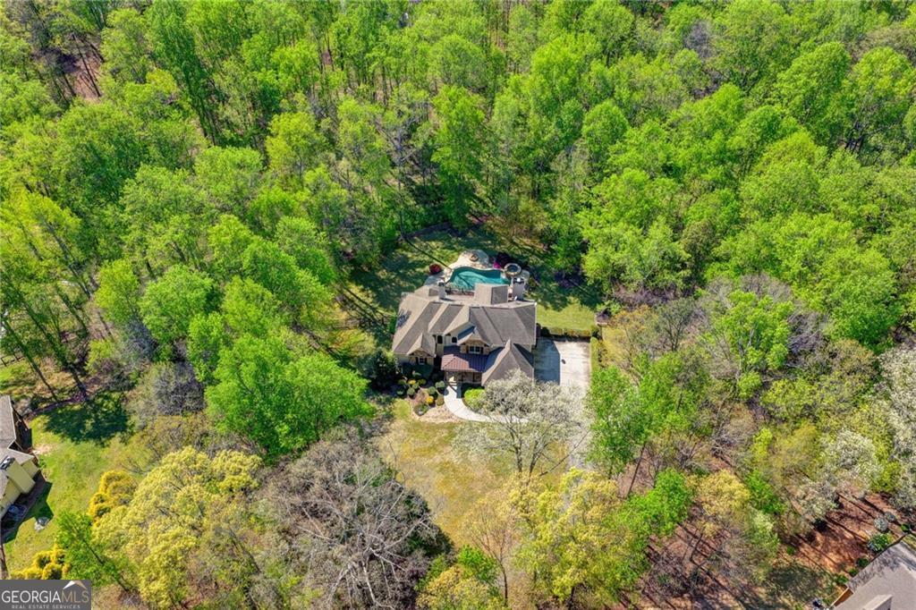 Nestled on over three acres of private, wooded serenity, this exceptional 5-bedroom, 4.5-bath estate offers an extraordinary blend of refined luxury, comfort, and natural beauty. Surrounded by tranquil forest views, the property provides the ultimate private retreat while still remaining conveniently located to nearby amenities, schools, and major thoroughfares. The main-level owner's suite is a true sanctuary, featuring expansive windows that frame peaceful wooded vistas, a spa-inspired en suite bath, and two spacious walk-in closets designed for both elegance and functionality. Designed with entertaining and everyday living in mind, the chef's kitchen showcases high-end appliances, custom cabinetry, and a large center island, seamlessly flowing into a warm and inviting keeping room with a stunning stone fireplace-the perfect setting for casual dining or relaxing with family and friends. The grand great room is equally impressive, highlighted by a dramatic stone fireplace and custom built-ins, creating an elegant gathering space ideal for hosting or quiet evenings at home. Upstairs, you'll find three generously sized bedrooms and two full bathrooms, offering comfort and privacy for family or guests. The finished terrace level elevates the home's entertainment and wellness experience. Highlights include a luxurious spa bath, a spacious game room perfect for movie nights or watching the big game, a dedicated exercise room, an additional bedroom, flexible living spaces, and ample storage. Step outside to your own resort-style backyard retreat. A heated saltwater pool and spa provide the perfect setting for relaxation, while the custom-built fire pit invites memorable evenings under the stars. The surrounding 3+ acres of mature wooded landscape offer exceptional privacy and a peaceful setting ideal for nature walks and outdoor enjoyment. Additional features include a 3-car garage and high-end finishes throughout, including hardwood floors, custom millwork, and designer fixtures. Whether you're entertaining poolside, relaxing fireside, or simply enjoying the quiet beauty of the surrounding woods, this remarkable estate offers a lifestyle of luxury, privacy, and timeless elegance.