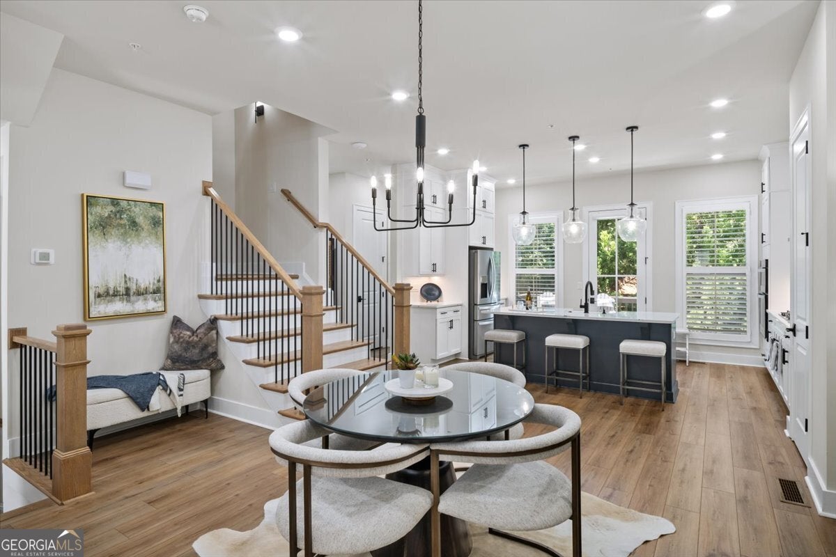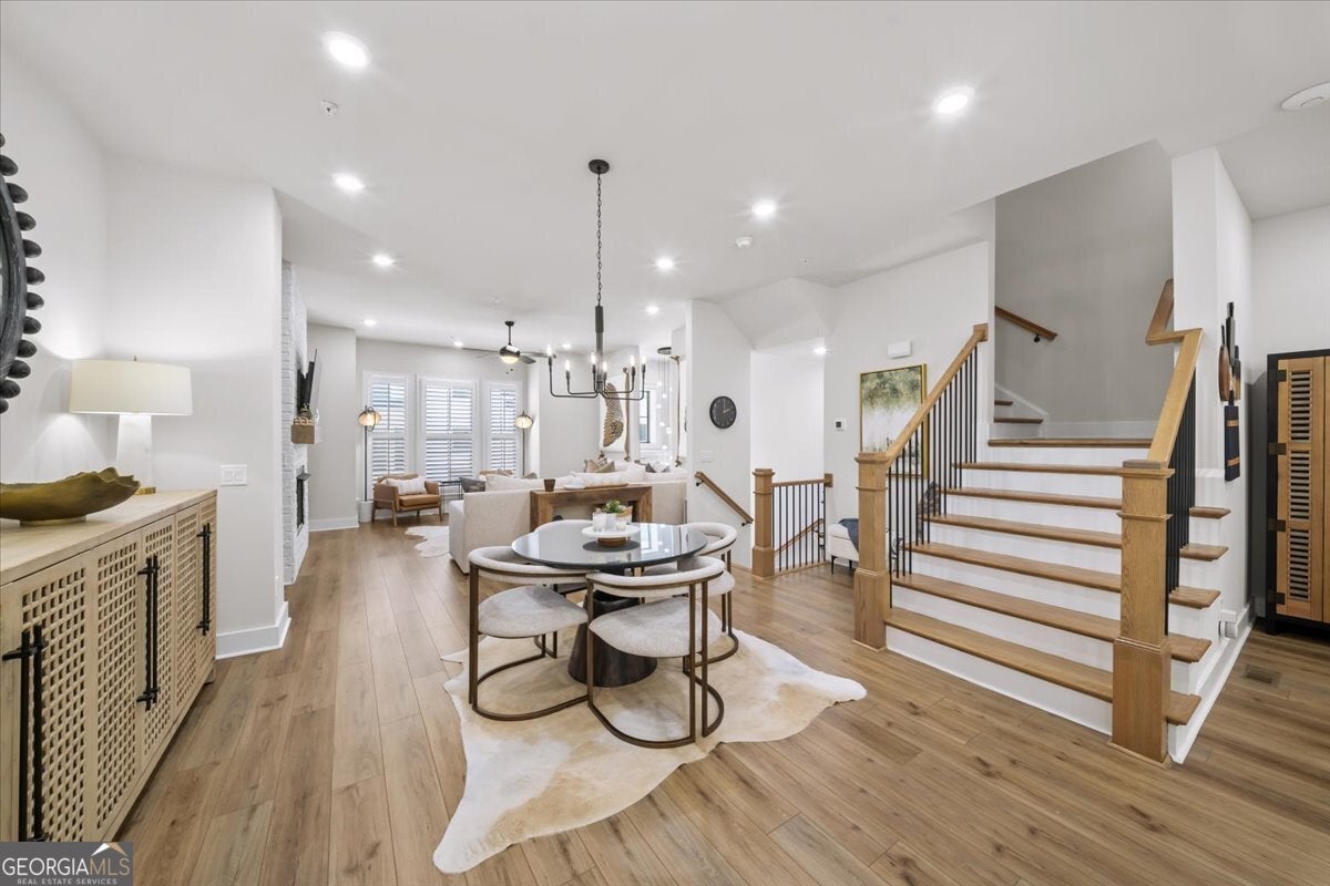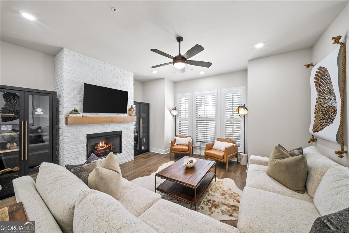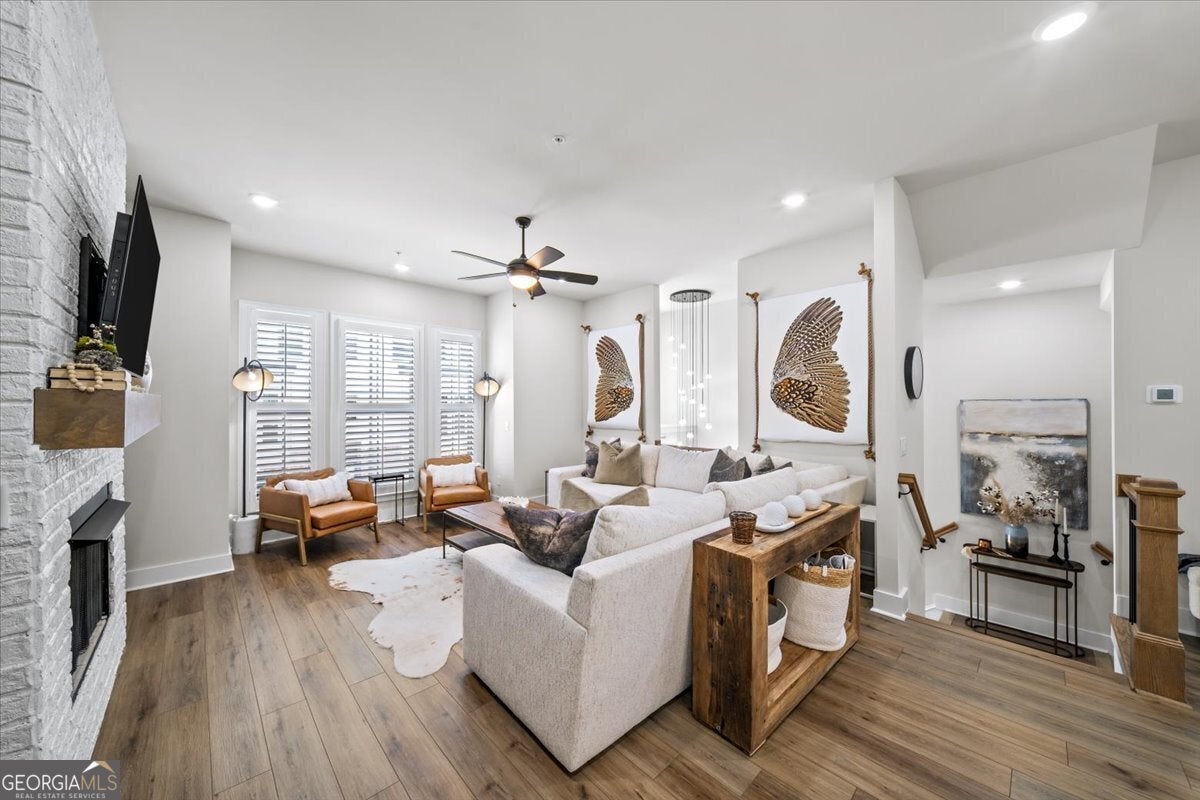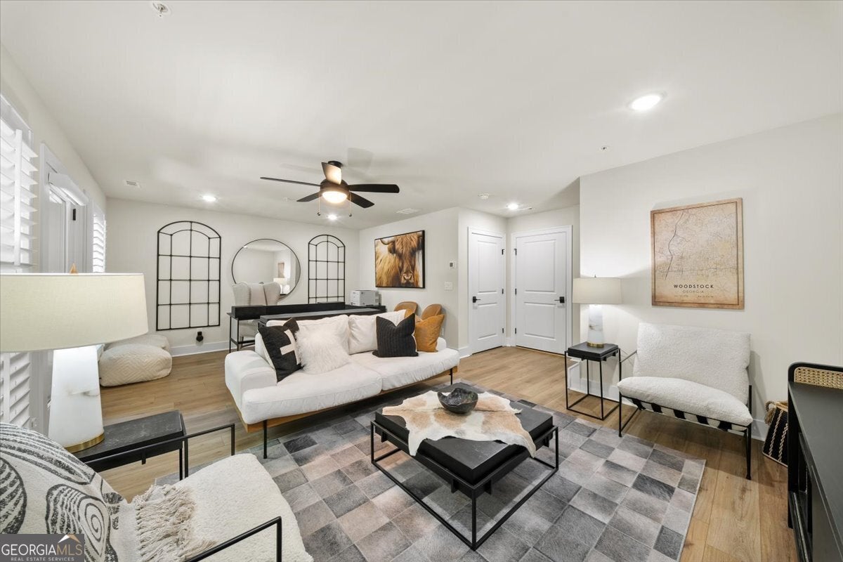 More than just a home-this is a lifestyle upgrade. Welcome to a stunning three-story townhome where modern luxury meets an unbeatable outdoor lifestyle, just a short, scenic stroll (less than 3/4 mile) from the charm and energy of historic downtown Woodstock. Follow a picturesque, tree-lined path straight into the heart of the city and experience the perfect balance of nature, convenience, and vibrant community living. Step outside and immerse yourself in an active, amenity-rich environment designed for all ages. Enjoy access to yoga, pickleball, volleyball, disc golf, walking trails, a dog park, fitness stations, and courts for basketball and tennis. Explore a breathtaking 110-acre park featuring hiking and mountain biking trails, fishing, canoeing, kayaking, and even a youth/amateur inline roller hockey league. Spend your evenings at the nearby amphitheater, hosting free summer concerts and fitness classes-all easily accessible by golf cart for the ultimate lifestyle experience. Inside, the home is equally impressive-crafted with both elegance and everyday functionality in mind. A dramatic split staircase welcomes you to the expansive main level, where soaring 10-foot ceilings and walls of windows flood the space with natural light. The open-concept design creates an airy, sophisticated atmosphere, anchored by a sleek linear fireplace in the living room. At the heart of the home, the gourmet kitchen is designed to impress. Featuring an oversized island, premium stainless steel appliances, floor-to-ceiling soft-close cabinetry with custom drawer inserts, and a bespoke coffee bar, it's the perfect space for everything from quiet mornings to elevated entertaining. The entry level offers a flexible bonus suite-ideal for a private office, home gym, or guest retreat. The spacious two-car garage is thoughtfully equipped with a smart opener, electric vehicle charger, and additional storage. Smart living is seamlessly integrated throughout, including Wi-Fi thermostats, an instant hot water recirculation system, central vacuum system for effortless cleaning, smart door lock, and video doorbell. Upstairs, retreat to the oversized primary suite-your private sanctuary-featuring a generous walk-in closet and a spa-inspired bath with dual vanities and a large walk-in shower. Additional bedrooms are equally well-appointed with ample space and walk-in closets. Outdoor living is just as inviting, with a private deck off the kitchen and a covered, fenced patio below-perfect for relaxing evenings or entertaining guests with ease. This is more than a home-it's where comfort, style, and an active lifestyle come together in perfect harmony.