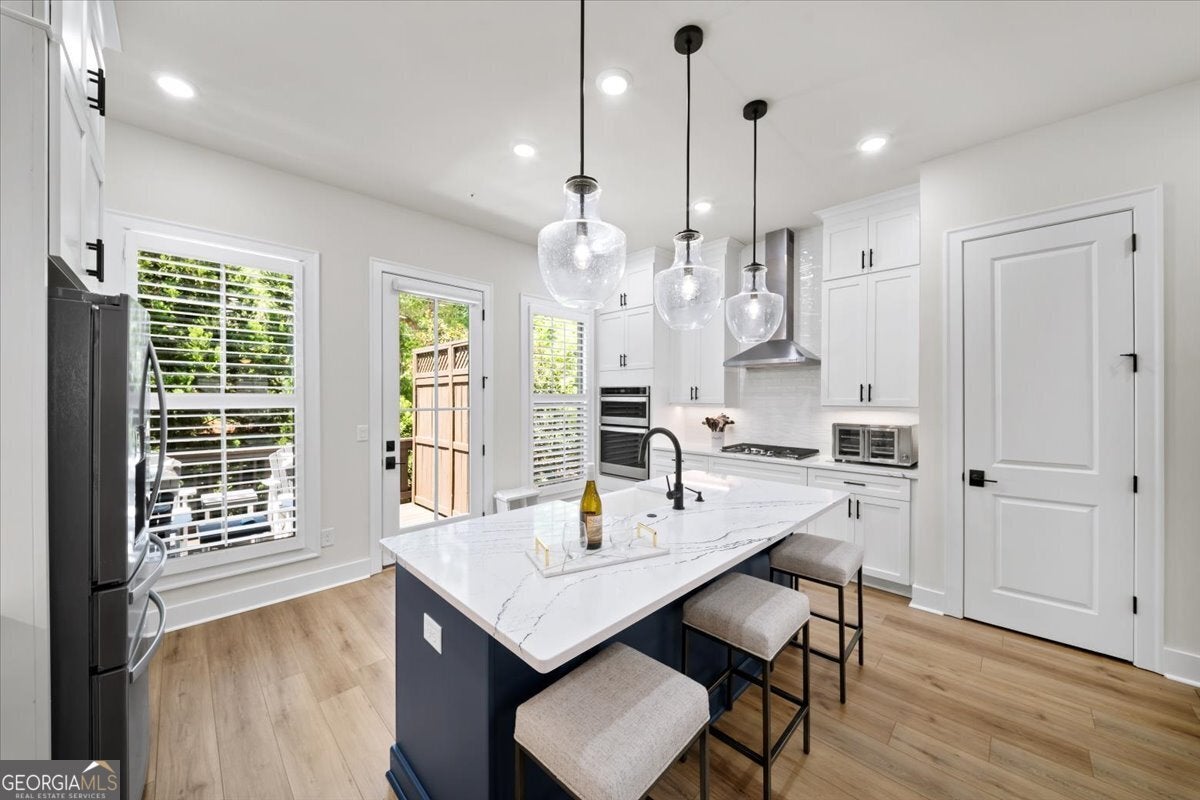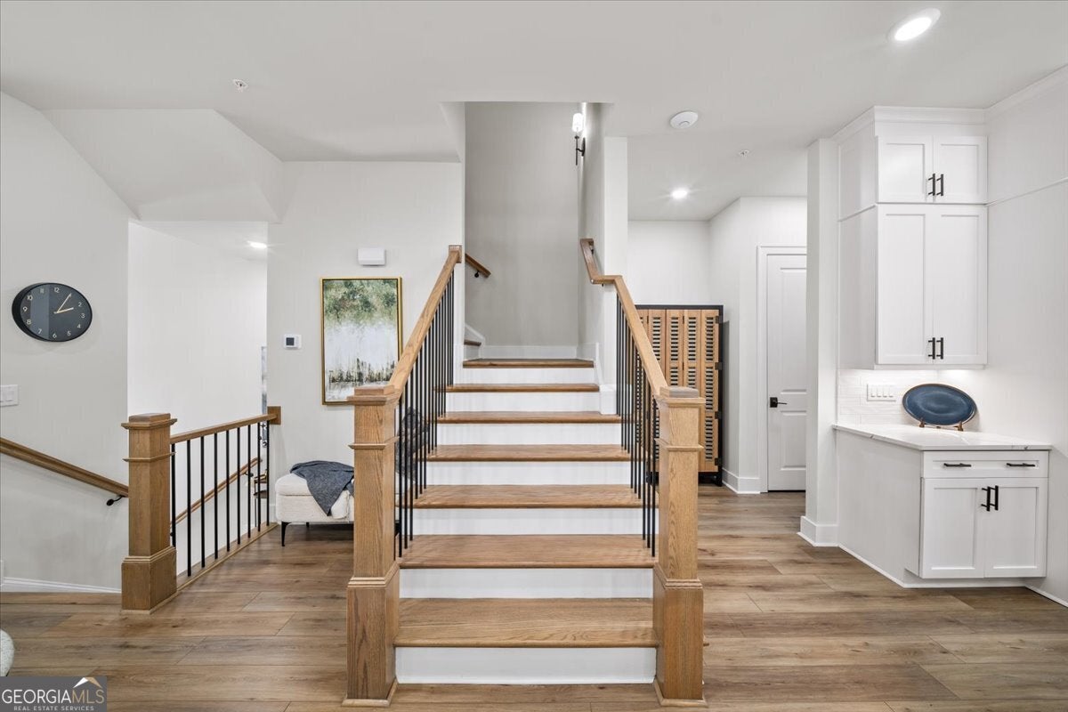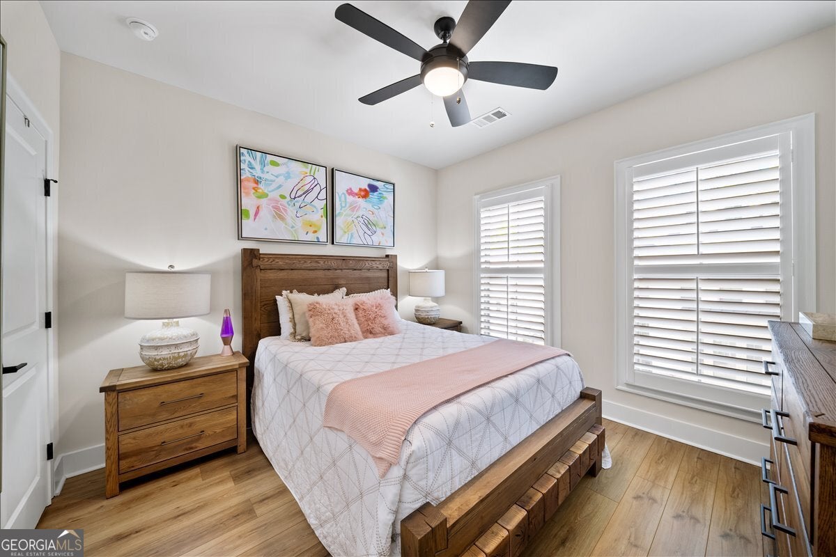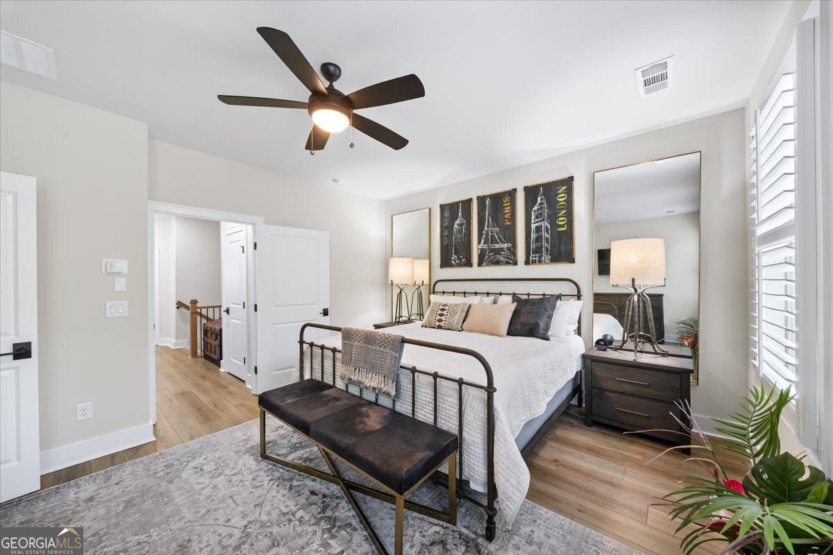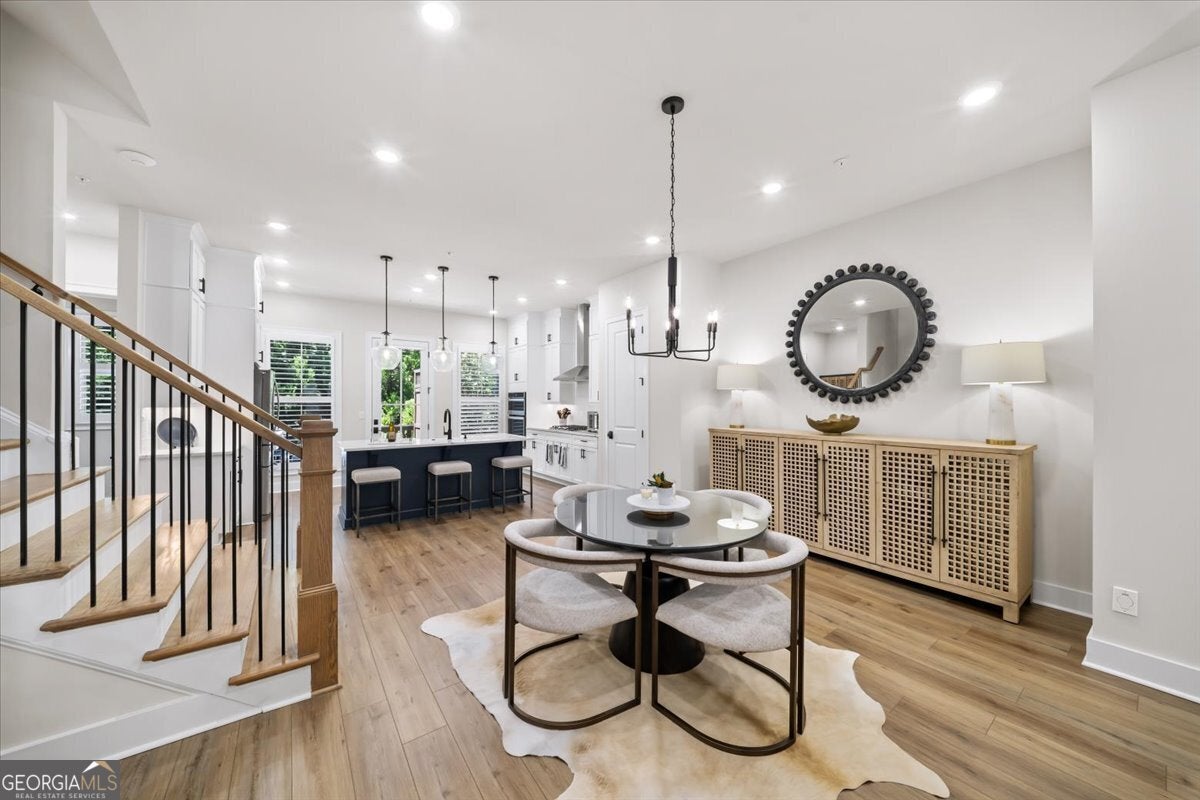 More than just a home-this is a lifestyle upgrade. Welcome to a stunning three-story townhome where modern luxury meets an unbeatable outdoor lifestyle, just a short, scenic stroll (less than 3/4 mile) from the charm and energy of historic downtown Woodstock. Follow a picturesque, tree-lined path straight into the heart of the city and experience the perfect balance of nature, convenience, and vibrant community living. Step outside and immerse yourself in an active, amenity-rich environment designed for all ages. Enjoy access to yoga, pickleball, volleyball, disc golf, walking trails, a dog park, fitness stations, and courts for basketball and tennis. Explore a breathtaking 110-acre park featuring hiking and mountain biking trails, fishing, canoeing, kayaking, and even a youth/amateur inline roller hockey league. Spend your evenings at the nearby amphitheater, hosting free summer concerts and fitness classes-all easily accessible by golf cart for the ultimate lifestyle experience. Inside, the home is equally impressive-crafted with both elegance and everyday functionality in mind. A dramatic split staircase welcomes you to the expansive main level, where soaring 10-foot ceilings and walls of windows flood the space with natural light. The open-concept design creates an airy, sophisticated atmosphere, anchored by a sleek linear fireplace in the living room. At the heart of the home, the gourmet kitchen is designed to impress. Featuring an oversized island, premium stainless steel appliances, floor-to-ceiling soft-close cabinetry with custom drawer inserts, and a bespoke coffee bar, it's the perfect space for everything from quiet mornings to elevated entertaining. The entry level offers a flexible bonus suite-ideal for a private office, home gym, or guest retreat. The spacious two-car garage is thoughtfully equipped with a smart opener, electric vehicle charger, and additional storage. Smart living is seamlessly integrated throughout, including Wi-Fi thermostats, an instant hot water recirculation system, central vacuum system for effortless cleaning, smart door lock, and video doorbell. Upstairs, retreat to the oversized primary suite-your private sanctuary-featuring a generous walk-in closet and a spa-inspired bath with dual vanities and a large walk-in shower. Additional bedrooms are equally well-appointed with ample space and walk-in closets. Outdoor living is just as inviting, with a private deck off the kitchen and a covered, fenced patio below-perfect for relaxing evenings or entertaining guests with ease. This is more than a home-it's where comfort, style, and an active lifestyle come together in perfect harmony.