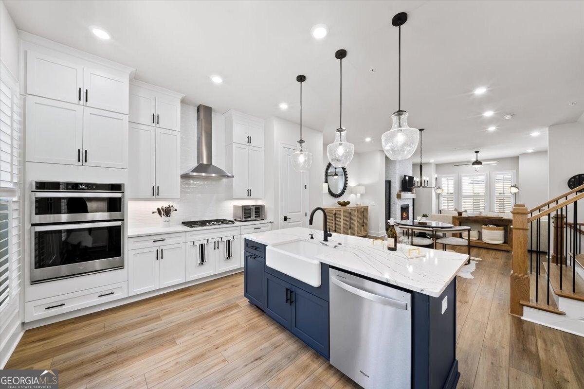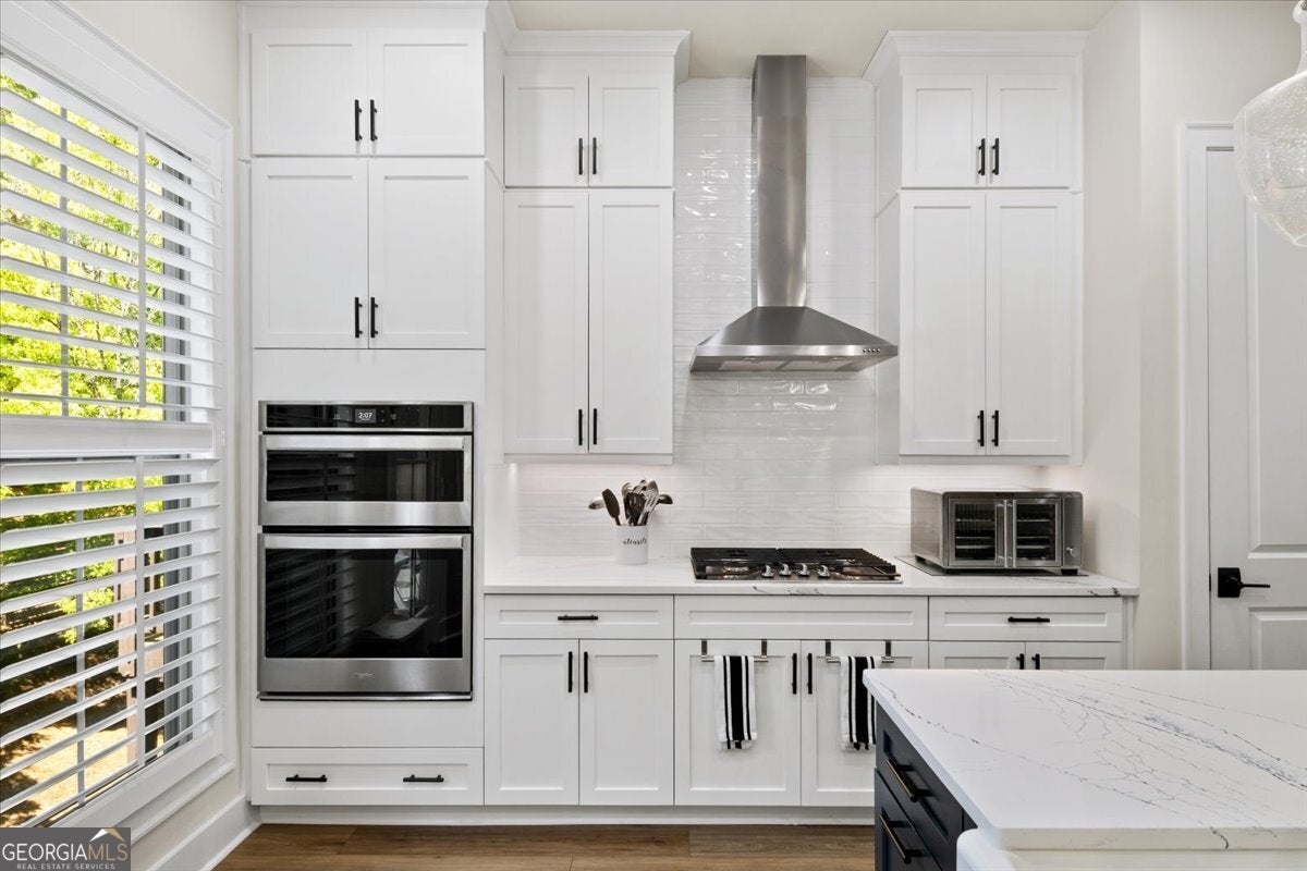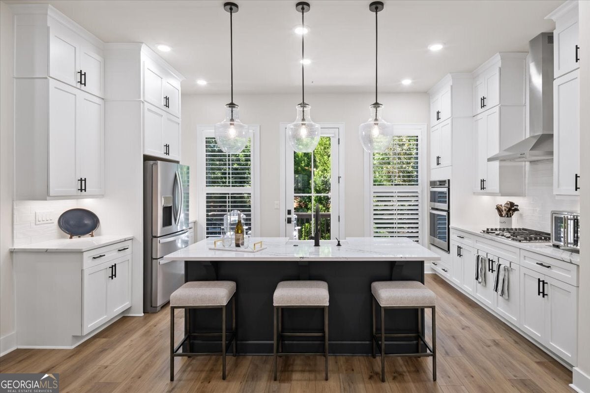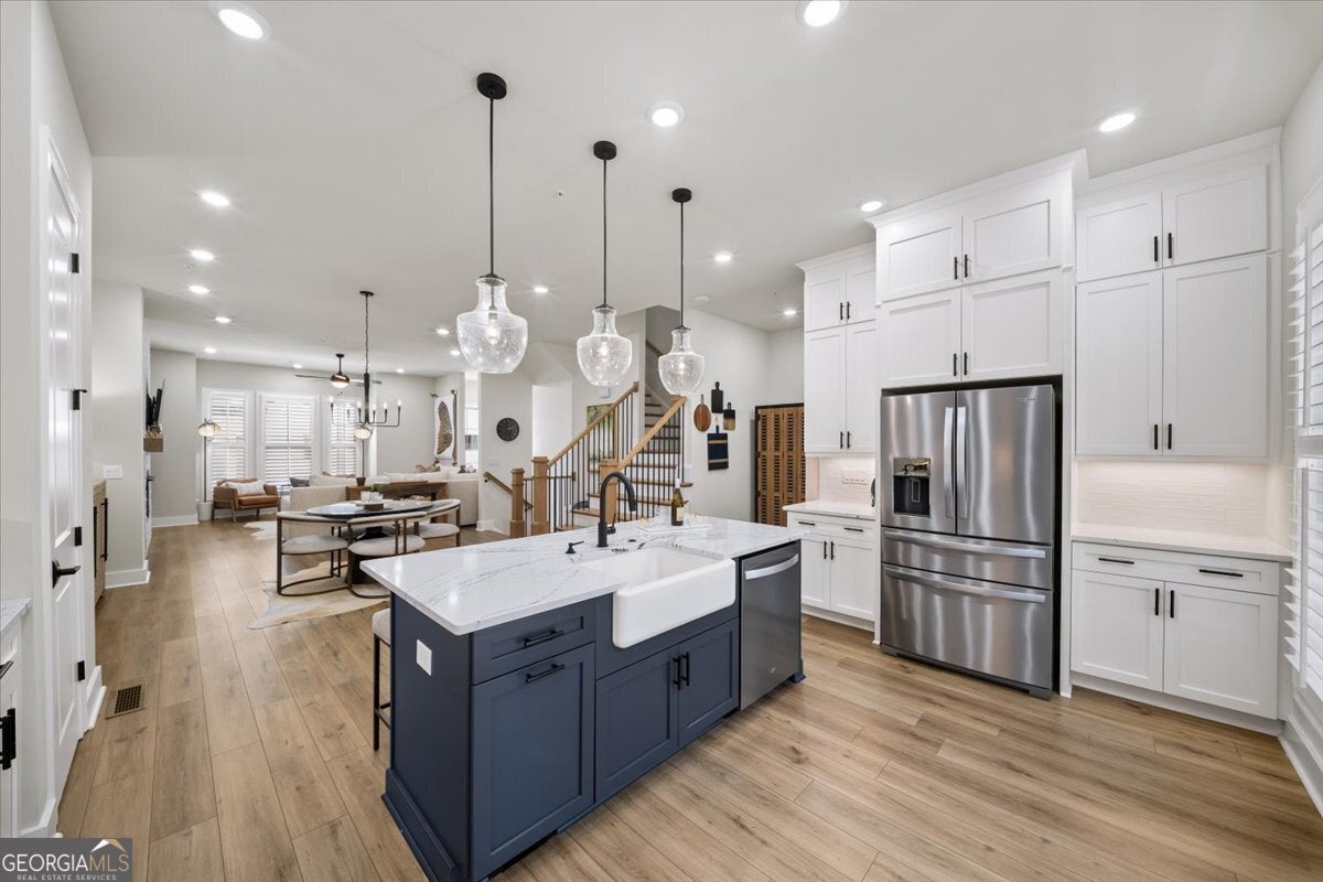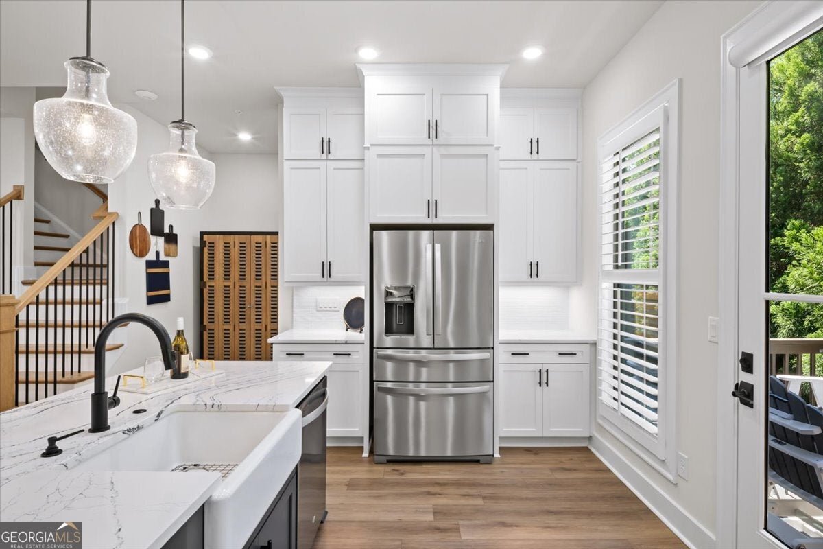 More than just a home-this is a lifestyle upgrade. Welcome to a stunning three-story townhome where modern luxury meets an unbeatable outdoor lifestyle, just a short, scenic stroll (less than 3/4 mile) from the charm and energy of historic downtown Woodstock. Follow a picturesque, tree-lined path straight into the heart of the city and experience the perfect balance of nature, convenience, and vibrant community living. Step outside and immerse yourself in an active, amenity-rich environment designed for all ages. Enjoy access to yoga, pickleball, volleyball, disc golf, walking trails, a dog park, fitness stations, and courts for basketball and tennis. Explore a breathtaking 110-acre park featuring hiking and mountain biking trails, fishing, canoeing, kayaking, and even a youth/amateur inline roller hockey league. Spend your evenings at the nearby amphitheater, hosting free summer concerts and fitness classes-all easily accessible by golf cart for the ultimate lifestyle experience. Inside, the home is equally impressive-crafted with both elegance and everyday functionality in mind. A dramatic split staircase welcomes you to the expansive main level, where soaring 10-foot ceilings and walls of windows flood the space with natural light. The open-concept design creates an airy, sophisticated atmosphere, anchored by a sleek linear fireplace in the living room. At the heart of the home, the gourmet kitchen is designed to impress. Featuring an oversized island, premium stainless steel appliances, floor-to-ceiling soft-close cabinetry with custom drawer inserts, and a bespoke coffee bar, it's the perfect space for everything from quiet mornings to elevated entertaining. The entry level offers a flexible bonus suite-ideal for a private office, home gym, or guest retreat. The spacious two-car garage is thoughtfully equipped with a smart opener, electric vehicle charger, and additional storage. Smart living is seamlessly integrated throughout, including Wi-Fi thermostats, an instant hot water recirculation system, central vacuum system for effortless cleaning, smart door lock, and video doorbell. Upstairs, retreat to the oversized primary suite-your private sanctuary-featuring a generous walk-in closet and a spa-inspired bath with dual vanities and a large walk-in shower. Additional bedrooms are equally well-appointed with ample space and walk-in closets. Outdoor living is just as inviting, with a private deck off the kitchen and a covered, fenced patio below-perfect for relaxing evenings or entertaining guests with ease. This is more than a home-it's where comfort, style, and an active lifestyle come together in perfect harmony.