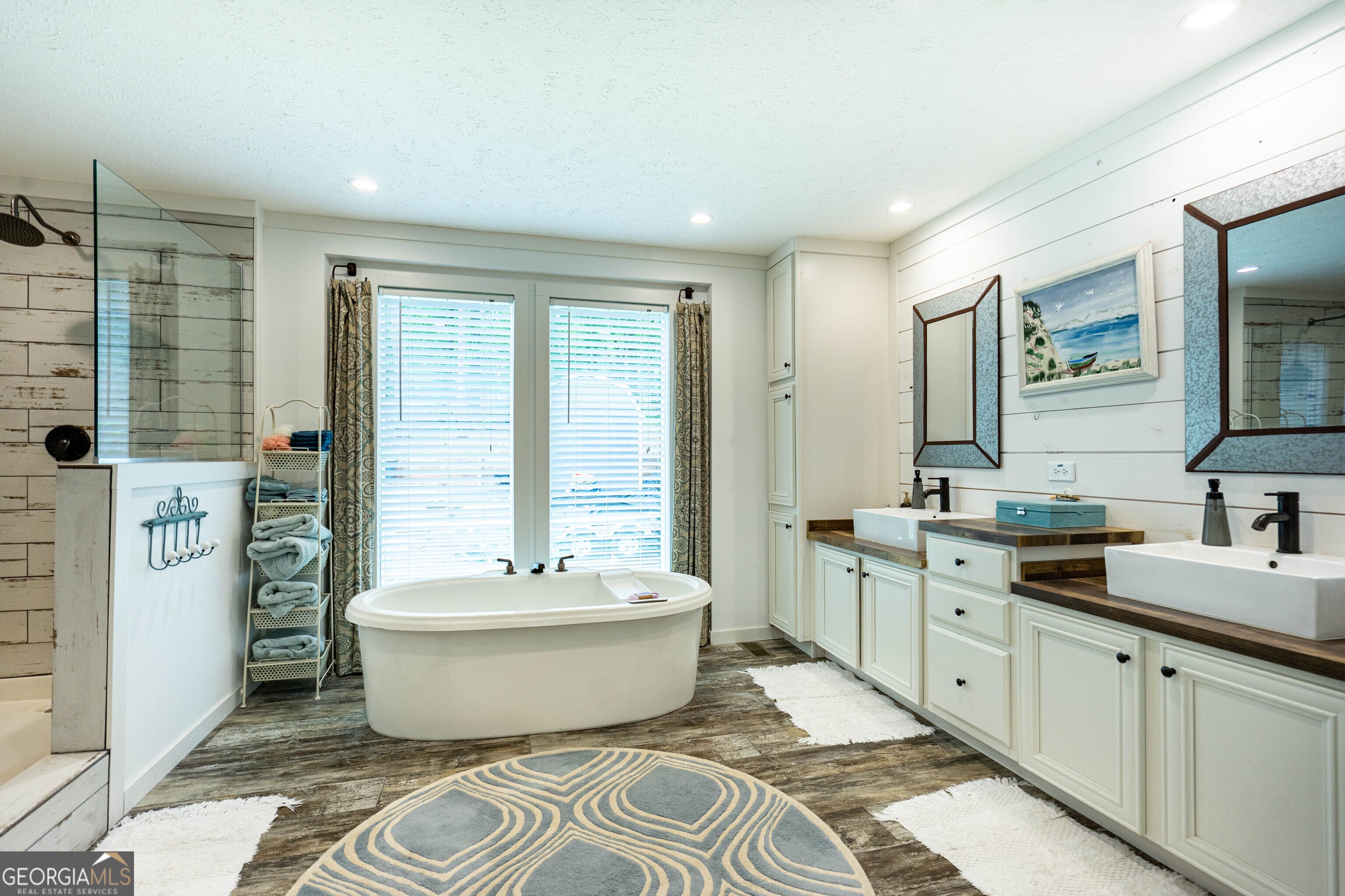 - Interior FeaturesDouble Vanity, Master On Main Level, Separate Shower, Soaking Tub, Walk-In Closet(s), Beamed Ceilings, Tile Bath