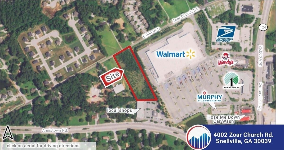 Introducing this Perfect Investment Opportunity! Are you looking for a prime commercial tract of land in an ideal location? Look no further! We are thrilled to present a remarkable property with C2 zoning, situated right next to the bustling Walmart Supercenter in Snellville, part of the thriving northeast metro Atlanta MSA. Key Features: Unbeatable Location: Conveniently positioned on one of the main arteries through Snellville, this property offers exceptional visibility and accessibility. With a curb cuts on Zoar Church Road and adjoining shopping center, your business will benefit from high traffic exposure and a steady flow of potential customers. Strong Demographics: Located in a high household income area, with an impressive average income of over $76,000 within a 1-mile radius, this property provides an excellent customer base for various commercial ventures. The affluent community surrounding the site ensures a receptive market eager for quality goods and services. Walmart Supercenter: With the property directly adjacent to the Walmart Supercenter, you have a unique opportunity to tap into the foot traffic generated by one of the nation’s leading retail giants. This strategic positioning provides a built-in customer base, boosting your business potential. Zoning and Utilities: The C2 zoning designation allows for a wide range of commercial uses, ensuring flexibility for various business types. Additionally, utilities such as electric, water, gas, and sewer are readily available. Surrounding Amenities: The property is flanked by an adjoining strip center to the south, providing additional convenience for potential customers. This complementary retail space can foster synergistic partnerships and enhance the overall appeal of the location. Whether you envision a retail store, restaurant, service-oriented establishment, or any other commercial venture, this property offers the perfect canvas to bring your business dreams to life. Don’t miss out on this exceptional opportunity to establish your presence in a thriving community with strong economic potential. Contact us today to learn more about this prime commercial tract of land. Don’t wait too long, as properties of this caliber seldom stay on the market for long!