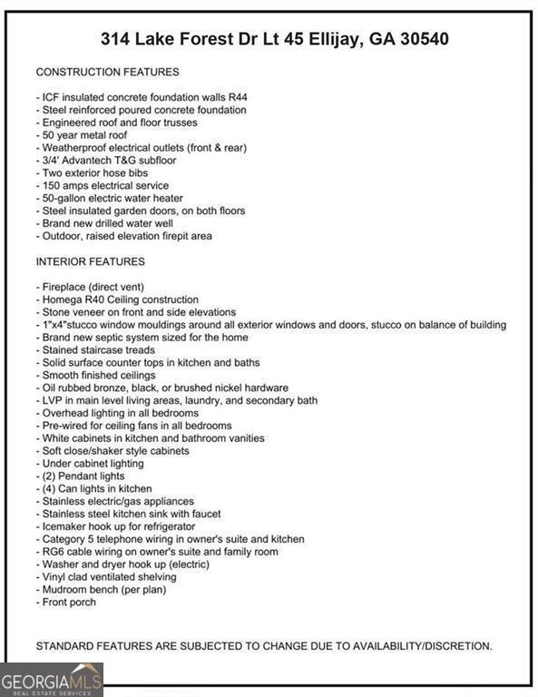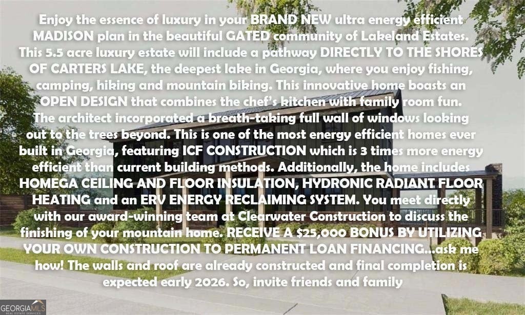 ***THIS IS YOUR OWN 5.5 ACRE ESTATE WITH MAGNIFICENT NATURE VIEWS*** CLICK ON THE (V) INSTAVIEW BUTTON ABOVE FOR A VIDEO ON THIS HOME. Enjoy the essence of luxury in your BRAND NEW ultra energy efficient MADISON plan in the beautiful GATED community of Lakeland Estates. This 5.5 acre luxury estate will include a pathway DIRECTLY TO THE SHORES OF CARTERS LAKE, the deepest lake in Georgia, where you enjoy fishing, camping, hiking and mountain biking. This innovative home boasts an OPEN DESIGN that combines the chef's kitchen with family room fun. Enjoy BREATHTAKING mountain views through a wall of windows highlighted by 24 foot ceilings. This is one of the most energy efficient homes ever built in Georgia, featuring ICF CONSTRUCTION which is 3 times more energy efficient than current building methods. Additionally, the home includes HOMEGA CEILING AND FLOOR INSULATION, HYDRONIC RADIANT FLOOR HEATING and an ERV ENERGY RECLAIMING SYSTEM. You meet directly with our award-winning team at Clearwater Construction to discuss the finishing of your mountain home. RECEIVE A $25,000 BONUS BY UTILIZING YOUR OWN CONSTRUCTION TO PERMANENT LOAN FINANCING...ask me how! The walls and roof are already constructed and final completion is expected early 2026. So, invite friends and family over to enjoy your new mountain villa and take them for a tour of ELLIJAY'S NINE NEARBY WINERIES.....the best Georgia has to offer. The home also has a LOFT area which could be converted to an additional sleeping area.